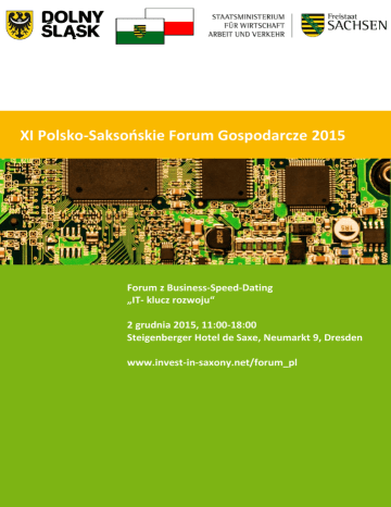 XI Polsko-Saksońskie Forum Gospodarcze 2015 Forum z Business-Speed-Dating „IT- klucz rozwoju“ 2 grudnia 2015, 11:00-18:00 Steigenberger Hotel de Saxe, Neumarkt 9, Dresden www.invest-in-saxony.net/forum_pl FORUM 2015 XI Polsko-Saksońskie Forum Gospodarcze – IT-Klucz rozwoju Wprowadzenie Współczesna rewolucja cyfrowa w gospodarce, administracji oraz społeczeństwie stawia sąsiedzkie regiony Saksonii i Polski przed podobnymi wyzwaniami. Samorządy po obu stronach granicy pracują nad stworzeniem założeń koniecznych do dalszego procesu digitalizacji we wszystkich obszarach. Forum organizowane jest wspólnie przez Saksońskie Ministerstwo Gospodarki, Pracy i Transportu, Saksońską Agencję Wspierania Gospodarki, Urząd Marszałkowski Województwa Dolnośląskiego oraz Ministerstwo Gospodarki RP. Dzięki tej inicjatywie powstaje szansa dla ukierunkowanej na projekty współpracy transgranicznej pomiędzy saksońskimi i polskim firmami z branży IT. W samej tylko Polsce na programy „Inteligentny rozwój” oraz „Cyfrowa Polska” przeznaczonych zostało prawie 11 miliardów euro. Niewątpliwie jednymi z ważniejszych obszarów w tym zakresie jest bezpieczeństwo informatyczne, Cloud Computing a także Internet of Things. Cele Celem tegorocznego Forum jest budowanie pozytywnego wizerunku kooperacji i internacjonalizacji przedsiębiorstw innowacyjnych poprzez pokazanie potencjału i silnych stron przedsiębiorstw oraz dzielenie się dobrymi praktykami. Istotą Forum jest stworzenie platformy współpracy dla innowacyjnych firm informatycznych z obu regionów. Forum służy nawiązaniu kontaktów kooperacyjnych pomiędzy dolnośląskimi i saksońskimi przedsiębiorcami, wymianie informacji o planowanych projektach informatycznych, oraz poszerzaniu wiedzy na temat aktualnych dążeń potencjalnych partnerów. Idealną okazją do nawiązania i intensyfikacji kontaktów biznesowych będzie planowany podczas Forum Busines-Speed-Dating i spotkanie Get-together. Język konferencji Forum będzie tłumaczone symultanicznie na język polski i niemiecki. Business-Speed-Dating prowadzony będzie w języku angielskim. W przypadku potrzeby udostępniony będzie tłumacz (niemiecko-polski). Business-Speed-Dating W ramach 20 krótkich spotkań (po 6 minut) przedsiębiorcom z Saksonii i Polski zapewniona będzie możliwość wzajemnego poznania się i zaprezentowania ofert oraz idei projektów. Dzięki branżowo ukierunkowanemu wyborowi uczestników Business-Speed-Dating, w ciągu krótkiego czasu możliwe będzie podjęcie decyzji związanej z wyborem potencjalnych partnerów w zakresie kooperacji oraz wymiany doświadczeń. Celem tych rozmów jest prezentacja w pierwszym kroku - w krótkiej i zwięzłej formie - w przekonywujący sposób własnych atutów. Następnie podczas Get-together, zapewniona będzie dostateczna ilość czasu oraz przyjazne ramy na pogłębienie świeżo nawiązanych kontaktów. Warunki uczestnictwa Uczestnictwo w Forum, łącznie z Business-Speed-Dating jest bezpłatne. Udział Business-Speed-Dating jest zastrzeżony dla należących do branży przedsiębiorstw/instytucji i możliwy wyłącznie na podstawie potwierdzenia otrzymanego od organizatorów. Zgłoszenie Prosimy o nadsyłanie zgłoszeń poprzez wysłanie formularza zgłoszeniowego do dnia 13 listopada 2015 roku na adres [email protected] oraz dodatkowo wypełnienie online wymaganych informacji o firmie/instytucji. Stan na dzień: 23.10.2015 Zdjęcie tytułowe: Maik Siegert PROGRAM PROGRAM XI Polsko-Saksońskie Forum Gospodarcze - Misja gospodarcza do Drezna dla branży Polsko-Saksońskie Forum Gospodarcze - Misja gospodarcza do Drezna dla IT branży IT Internet of Things w obszarze publicznym: „Droga do przemysłu 4.0, ścieżkami Internet of Things. Moda czy ewolucja?“ Bartłomiej Andrusiewicz, Viceprezes REC GLOBAL I dzień godz. 10:30-11:00 Rejestracja uczestników, kawa powitalna godz. 11:00-12:00 Część plenarna „Otwarte dane we Wrocławiu - miejska baza miejsc i wydarzeń Case study na temat efektywnej współpracy miasta i wrocławskich MŚP branży IT“ Przemysław Skrzek, Prezes Zarządu klastra ITCorner Grzegorz Jabłoński, Prezes Zarządu Fream SA sala Festsaal Otwarcie XI Polsko-Saksońskiego Forum Gospodarczego Martin Dulig, Saksoński Minister Gospodarki, Pracy i Transportu NN, Ministerstwo Gospodarki RP Andrzej Kosiór, Wicemarszałek Województwa Dolnośląskiego „Akademickie centrum superkomputerowe - nowe podejście do świadczenia usług udostępniania zasobów na potrzeby otoczenia nauki i biznesu“ Dr inż. Jacek Oko, Zastępca Kanclerza ds. Informatyzacji, Dyrektor Wrocławskiego Centrum Sieciowo Superkomputerowego Politechniki Wrocławskiej, mgr inz. Agnieszka Kwiecień, Dział Usług Obliczeniowych, Politechnika Wrocławska Wręczenie Polsko-Niemieckiej Nagrody Gospodarczej Referaty wprowadzające „Cyfryzacja w Saksonii i w Polsce“ Polski Elektroniczny Punkt Kontaktowy, Marcin Szokalski, Ekspert, Departament Gospodarki Elektronicznej Ministerstwa Gospodarki „Strategia cyfryzacji w Saksonii – stan i perspektywy“ Dr Dirk Orlamünder, Dyrektor Departamentu, Saksońskie Ministerstwo Gospodarki Pracy i Transportu godz. 14:40 „Strategia Rozwoju Społeczeństwa Informacyjnego na Dolnym Śląsku do roku 2020“ Krzysztof Zalewski, Pełnomocnik Zarządu Województwa Dolnośląskiego ds. Informatyzacji godz. 15:00-17:00 NETWORKING Business-Speed-Dating godz. 12:00-12:45 Przerwa na lunch godz. 12:45-14:40 Referaty wprowadzające Restauracja de Saxe Przerwa kawowa Restauracja de Saxe godz. 17:00-18:00 GET-TOGETHER Restauracja de Saxe Podsumowanie Polsko-Saksońskiego Forum Gospodarczego i Get-together sala Festsaal Zamówienia publiczne-szanse dla współpracy zorientowanej na projekty branży IT dla przedsiębiorców z Polski i Saksonii Modernizacja państwa i E-Government w Saksonii: „Platforma E-Government: baza do aplikacji i usług IT w Saksonii- doświadczenia i p