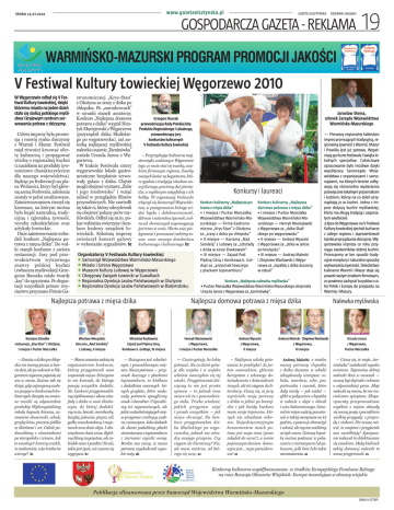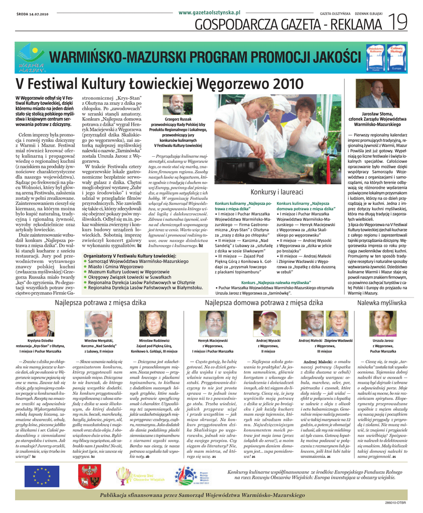 www.gazetaolsztynska.pl ŚRODA 14.07.2010 GAZETA OLSZTYŃSKA DZIENNIK ELBLĄSKI GOSPODARCZA GAZETA - REKLAMA 19 WARMIŃSKO-MAZURSKI PROGRAM PROMOCJI JAKOŚCI V Festiwal Kultury Łowieckiej Węgorzewo 2010 W Węgorzewie odbył się V Festiwal Kultury Łowieckiej, dzięki któremu miasto na jeden dzień stało się stolicą polskiego myślistwa i krajowym centrum serwowania potraw z dziczyzny. Celem imprezy była promocja i rozwój rynku dziczyzny z Warmii i Mazur. Festiwal miał również kreować ofertę kulinarną i propagować wiedzę o regionalnej kuchni (z naciskiem na produkty żywnościowe charakterystyczne dla naszego województwa). Sądząc po frekwencji na placu Wolności, który był główną areną Festiwalu, założenia zostały w pełni zrealizowane. Zainteresowaniem cieszył się kiermasz, na którym można było kupić naturalną, tradycyjną i rgionalną żywność, wyroby rękodzielnicze oraz artykuły łowieckie. Duże zainteresowanie wzbudził konkurs „Najlepsza potrawa z mięsa dzika“. Do walki stanęli kucharze z sześciu restauracji. Jury pod przewodnictwem wytrawnego znawcy polskiej kuchni (zwłaszcza myśliwskiej) Grzegorza Russaka miało twardy „kęs“ do zgryzienia. Po degustacji wszystkich potraw zwycięstwo przyznano Firmie Ga- stronomicznej „Krys-Stan” z Olsztyna za zrazy z dzika po chłopsku. Po „zawodowcach” w szranki stanęli amatorzy. Konkurs „Najlepsza domowa potrawa z dzika“ wygrał Henryk Maciejewski z Węgorzewa (przyrządził dzika Skaliskiego po węgorzewsku), zaś autorką najlepszej myśliwskiej nalewki o nazwie „Tarninówka” została Urszula Jarosz z Węgorzewa. W trakcie Festiwalu cztery węgorzewskie lokale gastronomiczne bezpłatnie serwowały gulasz z dzika. Chętni mogli obejrzeć wystawę „Żubr i jego środowisko” i wziąć udział w przeglądzie filmów przyrodniczych. Nie zawiedli się także ci, którzy zdecydowali się obejrzeć pokazy psów myśliwskich. Odbył się m.in. pokaz wabienia zwierzyny i konkurs budowy urządzeń łowieckich. Sobotnią imprezę zwieńczył koncert galowy w wykonaniu sygnalistów. bz — Przyrządzając kulinarne majstersztyki, szukamy w Węgorzewie tego, co może stać się marką, znakiem firmowym regionu. Zasoby naszych lasów są bogactwem, które zgodnie z tradycją i duchem nowej Europy, powinny dać pieniądze, a myśliwym satysfakcję z ich hobby. W organizację Festiwalu włączył się Samorząd Województwa, w postępowaniu którego widać logikę i dalekowzroczność. Zdrowa i naturalna żywność, wolna od chemicznych wspomagaczy jest teraz w cenie. Warto więc pielęgnować i promować rodzimy towar, owoc naszego dziedzictwa kulturowego i kulinarnego. bz Organizatorzy V Festiwalu Kultury Łowieckiej: • Samorząd Województwa Warmińsko-Mazurskiego • Miasto i Gmina Węgorzewo • Muzeum Kultury Ludowej w Węgorzewie • Okręgowy Związek Łowiecki w Suwałkach • Regionalna Dyrekcja Lasów Państwowych w Olsztynie • Regionalna Dyrekcja Lasów Państwowych w Białymstoku. Najlepsza potrawa z mięsa dzika Krystyna Dziodko restauracja „Krys-Stan“ z Olsztyna, I miejsce i Puchar Marszałka — Zrazów z dzika po chłopsku nie mamy jeszcze w karcie dań, ale po sukcesie w Węgorzewie zapewne pojawią się one w menu. Zawsze tak się dzieje, gdy zajmujemy czołowe pozycje w konkursach kulinarnych. Receptą na smaczne zraziki są odpowiednie produkty. Wykorzystaliśmy młodą kapustę kiszoną, zasmażone skwareczki, cebulę, grzyby leśne, pieczone jabłko ze śliwkami i ser. Całość podawaliśmy z ziemniakami po staropolsku i winem. Jak to smakuje? Jurorzy orzekli, że znakomicie, więc trzeba im wierzyć! bz Wiesław Mergalski, Karczma „Nad Sandelą“ z Lubawy, II miejsce — Słowa uznania należą się organizatorom konkursu, którzy przygotowali nam wspaniałe mięso. Dziczyzna to nie kurczak, do którego pasują wszystkie dodatki. Na konkurs przygotowaliśmy szpikowaną z ukosa sztufadę z dzika w sosie śliwkowym, do której dodaliśmy m.in. boczek, marchewkę, bazylię, jałowiec, pieprz, sól, gałkę muszkatołową i majeranek oraz dużo oleju. I obowiązkowo dużo wina. Byliśmy bliscy zwycięstwa, ale zabrakło nam 1 punktu! No cóż, takie jest życie, nie zawsze się wygrywa. bz Jarosław Słoma, członek Zarządu Województwa Warmińsko-Mazurskiego Grzegorz Russak przewodniczący Rady Polskiej Izby Produktu Regionalnego i Lokalnego, przewodniczący jury konkursów kulinarnych V Festiwalu Kultury Łowieckiej Konkursy i laureaci Konkurs kulinarny „Najlepsza potrawa z mięsa dzika“ • I miejsce i Puchar Marszałka Województwa Warmińsko-Mazurskiego — Firma Gastronomiczna „Krys-Stan” z Olsztyna za „zrazy z dzika po chłopsku“ • II miejsce — Karczma „Nad Sandelą” z Lubawy za „sztufadę z dzika w sosie śliwkowym“ • III miejsce — Zajazd Pod Piękną Górą z Konikowa k. Gołdapi za „przysmak łowczego z plackami topinamburu“ Konkurs kulinarny „Najlepsza domowa potrawa z mięsa dzika“ • I miejsce i Puchar Marszałka Województwa Warmińsko-Mazurskiego — Henryk Maciejewski z Węgorzewa za „dzika Skaliskiego po węgorzewsku“ • II miejsce — Andrzej Wysocki z Węgorzewa za „dzika w jelicie po brożajcku“ • III miejsce — Andrzej Małecki i Zbigniew Wacławski z Węgorzewa za „łopatkę z dzika duszoną w cebuli“ Konkurs „Najlepsza nalewka myśliwska“ • Puchar Marszałka Województwa Warmińsko-Mazurskiego otrzymała Urszula Jarosz z Węgorzewa za „tarninówkę“. — Pierwszy regionalny kalendarz imprez promujących tradycyjną, regionalną żywność z Warmii, Mazur i Powiśla jest już gotowy. Wypełniają go liczne festiwale i święta lokalnych specjałów. Całościowe opracowanie było możliwe dzięki współpracy Samorządu Województwa z organizacjami i samorządami, na których terenie odbywają się różnorodne wydarzenia poświęcone lokalnym przysmakom i ludziom, któr