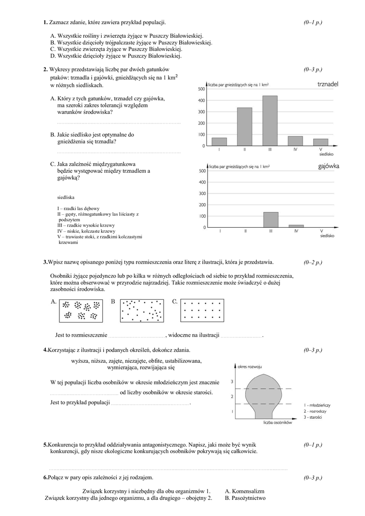 1. Zaznacz zdanie, które zawiera przykład populacji. (0–1 p.) A. Wszystkie rośliny i zwierzęta żyjące w Puszczy Białowieskiej. B. Wszystkie dzięcioły trójpalczaste żyjące w Puszczy Białowieskiej. C. Wszystkie zwierzęta żyjące w Puszczy Białowieskiej. D. Wszystkie dzięcioły żyjące w Puszczy Białowieskiej. 2. Wykresy przedstawiają liczbę par dwóch gatunków ptaków: trznadla i gajówki, gnieżdżących się na 1 km² w różnych siedliskach. (0–3 p.) A. Który z tych gatunków, trznadel czy gajówka, ma szeroki zakres tolerancji względem warunków środowiska? ................................................................................. B. Jakie siedlisko jest optymalne do gnieżdżenia się trznadla? ................................................................................. C. Jaka zależność międzygatunkowa będzie występować między trznadlem a gajówką? siedliska I – rzadki las dębowy II – gęsty, różnogatunkowy las liściasty z podszytem III – rzadkie wysokie krzewy IV – niskie, kolczaste krzewy V – trawiaste stoki, z rzadkimi kolczastymi krzewami 3.Wpisz nazwę opisanego poniżej typu rozmieszczenia oraz literę z ilustracji, która je przedstawia. (0–2 p.) Osobniki żyjące pojedynczo lub po kilka w różnych odległościach od siebie to przykład rozmieszczenia, które można obserwować w przyrodzie najrzadziej. Takie rozmieszczenie może świadczyć o dużej zasobności środowiska. Jest to rozmieszczenie . . . . . . . . . . . . . . . . . . . . . . . . . . . . . . . . . . . . . , widoczne na ilustracji . . . . . . . . . . . . . . . . . . . . . . . . . . . . 4.Korzystając z ilustracji i podanych określeń, dokończ zdania. (0–3 p.) wyższa, niższa, zajęte, niezajęte, obfite, ustabilizowana, wymierająca, rozwijająca się W tej populacji liczba osobników w okresie młodzieńczym jest znacznie ............................................. od liczby osobników w okresie starości. Jest to przykład populacji . . . . . . . . . . . . . . . . . . . . . . . . . . . . . . . . . . . . . . . . . . . . . . . . . . . . 5.Konkurencja to przykład oddziaływania antagonistycznego. Napisz, jaki może być wynik konkurencji, gdy nisze ekologiczne konkurujących osobników pokrywają się całkowicie. (0–1 p.) ............................................................... .................................. ........................................................... 6.Połącz w pary opis zależności z jej rodzajem. Związek korzystny i niezbędny dla obu organizmów 1. Związek korzystny dla jednego organizmu, a dla drugiego – obojętny 2. (0–3 p.) A. Komensalizm B. Pasożytnictwo Związek niekorzystny dla obu organizmów 3. C. Mutualizm D. Konkurencja 7.Środkowoamerykańskie mrówki pozostają w zależności z grzybami. Mrówki zdobywają liście (0–1 p.) z odpowiednich gatunków roślin i przygotowują z nich podłoże dla grzybów, którymi się żywią. Grzyby bez opieki mrówek nie są w stanie przeżyć. Młoda królowa – matka, wylatując na gody, zawsze zabiera ze sobą kawałek grzybni, który służy do założenia nowej hodowli w przyszłym mrowisku. Opisany rodzaj zależności to A. mutualizm. B. komensalizm. C. mikoryza. D. protokooperacja. 8.Zaznacz schemat, który prawidłowo przedstawia zależność między biotopem, biocenozą a ekosystemem. (0–1 p.) A. biotop = biocenoza + ekosystem B. biotop + ekosystem = biocenoza C. biotop + biocenoza = ekosystem 9.Podkreśl nazwy ekosystemów naturalnych. ogród, jezioro, las, pole, sad, torfowisko, staw rybny, step, morze, park (0–1 p.) 10.Przykładem zależności pokarmowych występujących w ekosystemie jest łańcuch pokarmowy. Każde ogniwo łańcucha reprezentuje określony poziom troficzny. Korzystając ze schematu, uzupełnij zdania. (0–2 p.) lipa larwa ćmy muchołówka kuna W podanym łańcuchu pokarmowym producentem jest . . . . . . . . . . . . . . . . . . . . , a konsumentem II rzędu jest . .. . . . . . . . . . . . . . . . . . . . . . . . . 11.W ekosystemie materia krąży między organizmami a środowiskiem. Uzupełnij schemat krążenia materii w ekosystemie. (0–2 p.) 12.Tlenki azotu i siarki powstające w rejonach przemysłowych są przenoszone na dalekie odległości. W atmosferze powstają z nich tzw. kwaśne opady. Obok zdań zawierających prawdziwe informacje wpisz literę P, a obok zawierających fałszywe informacje – literę F. (0–3 p.) Kwaśne opady powodują zakwaszenie gleb i wód. ….. Zakwaszenie wód jest obojętne dla organizmów wodnych. ….. Zakwaszenie gleb zakłóca pobieranie przez rośliny wody z solami mineralnymi. ….. Kwaśne opady uszkadzają przede wszystkim liście. ….. Najbardziej wrażliwe na działanie kwaśnych opadów są drzewa liściaste. ….. Najbardziej wrażliwe na działanie kwaśnych opadów są drzewa iglaste o wieloletnich igłach. ….. 13.W dużych miastach na pniach drzew nie występują porosty. Świadczy to o (0–1 p.) A. zanieczyszczeniu powietrza tlenkami azotu. B. zanieczyszczeniu powietrza tlenkami węgla. C. zanieczyszczeniu powietrza tlenkami siarki. D. zanieczyszczeniu powietrza węglowodorami. 1.Zaznacz zdanie, które zawiera przykład populacji. (0–1 p.) A. Wszystkie sowy żyjące w Puszczy Białowieskiej. B. Wszystkie zwierzęta żyjące w Puszczy Białowieskiej. C. Wszystkie sowy uszate żyjące w Puszczy Białowieskiej. D. Wszystkie rośliny i zwierzęta żyjące w Puszczy Białowieskiej. 2.Wykresy przedstawiają liczbę par dwóch gatunków ptaków: (0–3 p.) trznadla i gajówki, gnieżdżących się na 1 km2 w różnych siedliskach. A. Który z tych gatunków, trznadel czy gajówka, ma wąski zakres tolerancji względem warunków środowiska? ................................................................ B. Jakie siedlisko jest optymalne do gnieżdżenia się gajówki? ................................................................ C. Jaka zależność międzyg