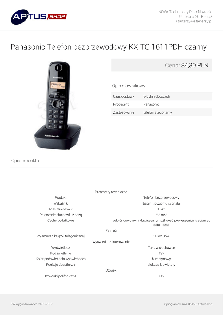NOVA Technology Piotr Nowacki Ul. Leśna 20, Raciąż [email protected] Panasonic Telefon bezprzewodowy KX-TG 1611PDH czarny Cena: 84,30 PLN Opis słownikowy Czas dostawy 2-5 dni roboczych Producent Panasonic Zastosowanie telefon stacjonarny Opis produktu Parametry techniczne Produkt Telefon bezprzewodowy Wskaźnik baterii , poziomu sygnału Ilość słuchawek 1 szt. Połączenie słuchawki z bazą radiowe Cechy dodatkowe odbiór dowolnym klawiszem , możliwość powieszenia na ścianie , data i czas Pamięć Pojemność książki telegonicznej 50 wpisów Wyświetlacz i sterowanie Wyświetlacz Tak , w słuchawce Podświetlenie Tak Kolor podświetlenia wyświetlacza bursztynowy Funkcje dodatkowe blokada klawiatury Dźwięk Dzwonki polifoniczne Plik wygenerowano: 03-03-2017 Tak Oprogramowanie sklepu: AptusShop NOVA Technology Piotr Nowacki Ul. Leśna 20, Raciąż [email protected] Funkcje połączeń Zarządzanie połaczeniami identyfikacja numeru Automatyczna sekretarka Maks. czas nagrywania Nie dotyczy Sterowanie automatyczną sekretarką Nie dotyczy Licznik wiadomości Nie dotyczy Fax Maks. prędkość modemu Nie dotyczy Pamięć dokumentów Nie dotyczy Technologia wydruku Nie dotyczy Ilość odcieni szarości Nie dotyczy Kopiowanie Nie dotyczy Parametry fizyczne Sposób zasilania akumulatorowe Typ akumulatora NiMH Kolor czarny Zgłoś błędny opis produktu. Plik wygenerowano: 03-03-2017 Powered by TCPDF (www.tcpdf.org) Oprogramowanie sklepu: AptusShop