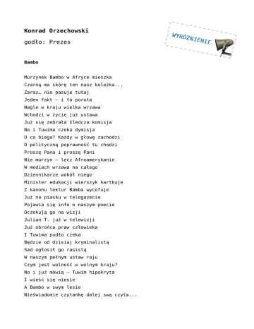 Konrad Orzechowski godło: Prezes Bambo Murzynek Bambo w Afryce mieszka Czarną ma skórę ten nasz koleżka... Zaraz… nie pasuje tutaj Jeden fakt – i to poruta Nagle w kraju wielka wrzawa Wchodzi w życie już ustawa Już się zebrała śledcza komisja No i Tuwima czeka dymisja O co biega? Każdy w głowę zachodzi O polityczną poprawność tu chodzi Proszę Pana i proszę Pani Nie murzyn – lecz Afroamerykanin W mediach wrzawa na całego Dziennikarze wokół niego Minister edukacji wierszyk kartkuje Z kanonu lektur Bamba wycofuje Już na piasku w telegazecie Pojawia się info o naszym poecie Oczekują go na wizji Julian T. już w telewizji Już obrońca praw człowieka I Tuwima pudło czeka Będzie od dzisiaj kryminalistą Sad ogłosił go rasistą W naszym pełnym ustaw raju Czym jest wolność w wolnym kraju? No i już mówią – Tuwim hipokryta I wieść się niesie A Bambo w swym lesie Nieświadomie czytankę dalej swą czyta... Konrad Orzechowski godło: Prezes Lokomotywa Stoi na stacji lokomotywa... Stoi! Wokół ludzi rój się roi. Dokręcają jakieś śruby Kręci chudy, kręci gruby, Kręci monter i mechanik, Kręci też w okienku pani. Wszyscy kręcą, co sił w rękach. Nagle… SRU! I śruba pęka! Motłoch, ludzi rój szaleje, Każdy pyta, co się dzieje, Maszyna wielka, tłusta oliwa, Stoi bez ruchu, nagle nieżywa, Każdy popycha, robi, co może, Tutaj i Pudzian nic nie pomoże, Ale nagle, wśród tej wrzawy, O kolei już ustawy, Godzina odjazdu już dawno wybiła, Znowu śruba – trrrach! Puściła! Jakaś rada wśród tej wrzawy, Nowy pociąg już z Warszawy, Jedzie! W głowie się nie mieści! Czas spóźnienia – godzina czterdzieści... Stoi na stacji lokomotywa, W kraju, co POLSKĄ wciąż się nazywa