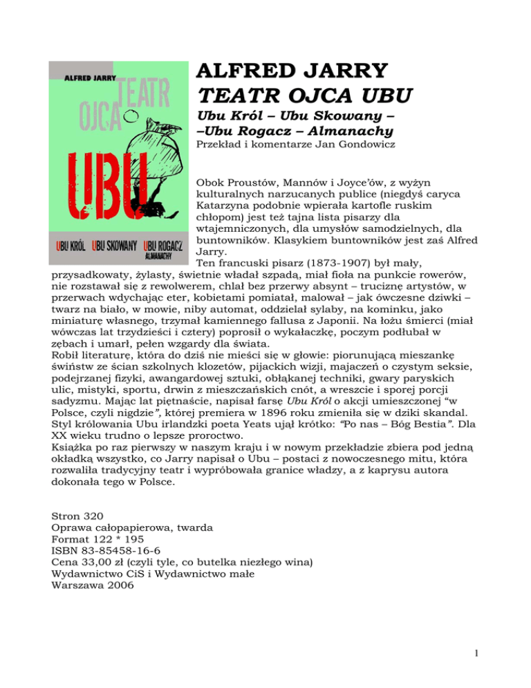 ALFRED JARRY TEATR OJCA UBU Ubu Król – Ubu Skowany – –Ubu Rogacz – Almanachy Przekład i komentarze Jan Gondowicz Obok Proustów, Mannów i Joyce’ów, z wyżyn kulturalnych narzucanych publice (niegdyś caryca Katarzyna podobnie wpierała kartofle ruskim chłopom) jest też tajna lista pisarzy dla wtajemniczonych, dla umysłów samodzielnych, dla buntowników. Klasykiem buntowników jest zaś Alfred Jarry. Ten francuski pisarz (1873-1907) był mały, przysadkowaty, żylasty, świetnie władał szpadą, miał fioła na punkcie rowerów, nie rozstawał się z rewolwerem, chlał bez przerwy absynt – truciznę artystów, w przerwach wdychając eter, kobietami pomiatał, malował – jak ówczesne dziwki – twarz na biało, w mowie, niby automat, oddzielał sylaby, na kominku, jako miniaturę własnego, trzymał kamiennego fallusa z Japonii. Na łożu śmierci (miał wówczas lat trzydzieści i cztery) poprosił o wykałaczkę, poczym podłubał w zębach i umarł, pełen wzgardy dla świata. Robił literaturę, która do dziś nie mieści się w głowie: piorunującą mieszankę świństw ze ścian szkolnych klozetów, pijackich wizji, majaczeń o czystym seksie, podejrzanej fizyki, awangardowej sztuki, obłąkanej techniki, gwary paryskich ulic, mistyki, sportu, drwin z mieszczańskich cnót, a wreszcie i sporej porcji sadyzmu. Mając lat piętnaście, napisał farsę Ubu Król o akcji umieszczonej “w Polsce, czyli nigdzie”, której premiera w 1896 roku zmieniła się w dziki skandal. Styl królowania Ubu irlandzki poeta Yeats ujął krótko: “Po nas – Bóg Bestia”. Dla XX wieku trudno o lepsze proroctwo. Książka po raz pierwszy w naszym kraju i w nowym przekładzie zbiera pod jedną okładką wszystko, co Jarry napisał o Ubu – postaci z nowoczesnego mitu, która rozwaliła tradycyjny teatr i wypróbowała granice władzy, a z kaprysu autora dokonała tego w Polsce. Stron 320 Oprawa całopapierowa, twarda Format 122 * 195 ISBN 83-85458-16-6 Cena 33,00 zł (czyli tyle, co butelka niezłego wina) Wydawnictwo CiS i Wydawnictwo małe Warszawa 2006 1