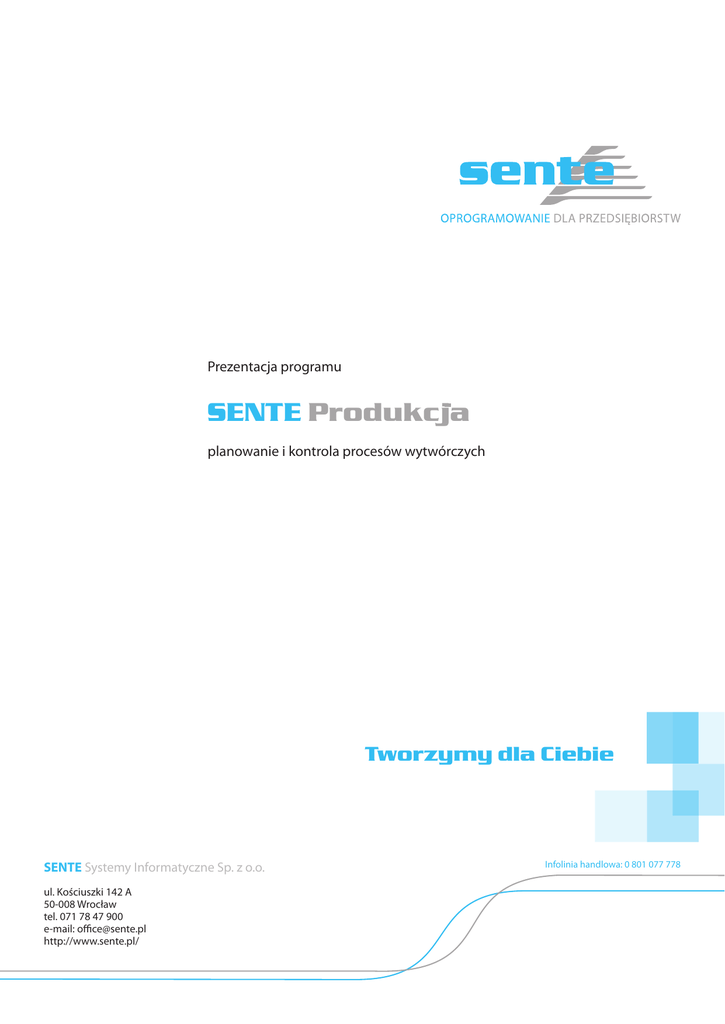 Prezentacja programu SENTE Produkcja planowanie i kontrola procesów wytwórczych Tworzymy dla Ciebie SENTE Systemy Informatyczne Sp. z o.o. ul. Kościuszki 142 A 50-008 Wrocław tel. 071 78 47 900 e-mail: [email protected] http://www.sente.pl/ Infolinia handlowa: 0 801 077 778 Program SENTE Produkcja umoĪliwia m.in. ewidencjĊ procesu Struktura wyrobu technologicznego w postaci kart technologicznych, kalkulacjĊ kosztów wytworzenia produktów, planowanie i sterowanie Surowiec procesem produkcyjnym, w tym planowanie zapotrzebowania surowcowego, rozliczanie czasu pracy (RCP( oraz na karcie technologicznej moĪe byü wyrób gotowy moĪe posiadaü strukturĊ hierarchiczną. Program harmonogramowanie oraz ewidencjĊ raportów wykonania operacji produkcyjnych, umieszczony jednoczeĞnie produktem posiadającym wáasną technologiĊ. Stąd umoĪliwia wgląd zarówno w strukturĊ wieloskáadnikowego wyrobu jak obsáugĊ i wykonywanie analizy uwzglĊdniającej peáną strukturĊ wyrobu. dyspozytorni. EWIDENCJA KART TECHNOLOGICZNYCH Redagowanie kart technologicznych System umoĪliwia ewidencjĊ kart technologicznych, czyli peánego technicznego opisu wyrobu. Informacje zawarte w karcie umoĪliwiają wykonanie kalkulacji wyrobu oraz zaplanowanie i przeprowadzenie procesu produkcyjnego. KaĪda karta technologiczna moĪe byü opisana przez: dane podstawowe – czyli informacje takie jak: typ, x symbol, wersja, opis, wydziaá produkcyjny, KTM i iloĞü wyrobu, itp. operacje produkcyjne – hierarchicznie uáoĪona lista x czynnoĞci produkcyjnych, zawierających m.in.: symbol operacji, czas pracy, kod stanowiska produkcyjnego, itp. ZaleĪnoĞci miĊdzy operacjami produkcyjnymi odzwierciedlają przebieg oraz Kalkulacja karty technologicznej alternatywy procesu produkcyjnego. KaĪda operacja produkcyjna x x moĪe byü wskazana jako kalkulowana lub/i harmonogramowana. KaĪda Dodatkowo na operacjach harmonogramowanych wskazywany jednoczeĞnie. Kalkulacje mogą róĪniü siĊ metodą przeprowadzenia, jest sposób raportowania realizacji tych operacji: brak wykonania parametrami i datą wykonania. Wynikiem kalkulacji jest zestaw lub zdefiniowanych iloĞci oraz wspóáczynnik raportowania, dla operacji technologiczna w trakcie moĪe posiadaü wdroĪenia rubryk wiele kalkulacji kalkulacyjnych, produkcyjnych podlegających kontroli jakoĞci wskazywany jest zawierających typ kontroli: po przezbrojeniu lub cykliczna podsumowania. KaĪda z metod kalkulacji zawiera definiowalny zestaw poszczególne skáadniki kosztowe oraz ich surowce – czyli lista towarów wchodzących w skáad wyraĪeĔ arytmetycznych skáadających siĊ na algorytm wyliczający produktu, opisanych przez: KTM, iloĞü netto, iloĞü brutto. wartoĞci poszczególnych rubryk. W ramach wyraĪeĔ moĪna uĪywaü Surowiec takĪe moĪe byü produktem mającym wáasną kartĊ funkcji odwoáujących siĊ do dowolnych danych zawartych w bazie technologiczną. danych systemu. KaĪda kalkulacja karty moĪe posiadaü status: narzĊdzia – to lista narzĊdzi, dodatkowych materiaáów i niezatwierdzona, zatwierdzona lub domyĞlna. Kalkulacja domyĞlna pomocy warsztatowych niezbĊdnych w procesie produkcji. x karta moĪe byü wykorzystywana do wyceniania wyrobu gotowego w trakcie parametry definiowalne – karta technologiczna moĪe produkcji. byü opisana przez szereg definiowalnych parametrów mających znaczenie kalkulacyjne i wpáywających na potrzeby surowcowe (np. wymiary wyrobu, cechy szczególne). Wspóáczynniki i informacje iloĞciowe zawarte na karcie mogą byü wprowadzane w postaci wykonywalnego skryptu SQL, co zwiĊksza elastycznoĞü i moĪliwoĞü parametryzacji informacji. Zatwierdzanie kart technologicznych KaĪda karta technologiczna moĪe widnieü jako: niezatwierdzona, zatwierdzona lub domyĞlna. Dla jednego wyrobu moĪe istnieü wiele kart technologicznych, ale tylko jedna moĪe posiadaü status karty domyĞlnej. UmoĪliwia to dynamiczny rozwój i bezpieczną modyfikacjĊ technologii w trakcie eksploatacji systemu. BezpoĞrednio modyfikowane mogą byü tylko niezatwierdzone karty technologiczne – kaĪda modyfikacja zapisywana jest w historii zmian. Modyfikacja zatwierdzonych kart technologicznych odbywa siĊ poprzez skopiowanie karty modyfikowanej i utworzenie w ten sposób je nowej wersji, która poddawana bĊdzie modyfikacjom. SENTE Produkcja 2 PLANOWANIE x analiz zapotrzebowaĔ: np. analizy stanów min./max. magazynów Plany sprzedaĪy Przewodniki produkcyjne Program umoĪliwia planowanie sprzedaĪy w dowolnym ujĊciu okresowym oraz kontrolĊ bieĪącej realizacji planów. Plany mogą byü Na podstawie zleceĔ produkcyjnych generowane są automatycznie ustalane rĊcznie lub w oparciu o analizĊ historii sprzedaĪy. MoĪna przewodniki produkcyjne odzwierciedlające partie wyrobu kierowane planowaü do produkcji. W celu wyrównania iloĞci wyrobu, na który wystawione sprzedaĪ poszczególnych asortymentów lub grup zostaáy przewodniki do iloĞci wyrobu na które opiewa zlecenie towarowych. produkcyjne Plany produkcyjne system automatycznie podbija/obniĪa iloĞci na przewodnikach do zlecenia lub generuje nowe przewodniki. Na podstawie planów sprzedaĪy lub zamówieĔ od klientów moĪliwe jest generowanie okresowych planów produkcji na poszczególne wydziaáy. Plan moĪe dodatkowo uwzglĊdniaü nadwyĪki i niedobory magazynowe wyrobów gotowych lub póáproduktów. Operacje produkcyjne Pod przewodniki produkcyjne generowane są operacje produkcyjne Plany zapotrzebowania surowcowego wg odpowiednio oznaczonych operacji z kart technologicznych. Plany sprzedaĪy i plany produkcyjne są podstawą generowania planów Operacja produkcyjna oznaczona jest nastĊpującymi statusami, zapotrzebowania surowcowego. Plany zapotrzebowania mogą sáuĪyü okreĞlającymi stan jej realizacji: do tworzenia zamówieĔ do dostawców. x nierozpoczĊta x opóĨniona x w trakcie realizacji x zrealizowana Kontrola realizacji planów W dowolnym momen