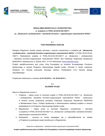 REGULAMIN REKRUTACJI I UCZESTNICTWA w projekcie nr POKL.05.04.02-00-C92/11 pt. „Skutecznie i profesjonalnie - standardy formalno - organizacyjne mazowieckich NGOs” §1 POSTANOWIENIA OGÓLNE Niniejszy Regulamin określa zasady rekrutacji i warunki uczestnictwa w projekcie pt. „Skutecznie i profesjonalnie - standardy formalno-organizacyjne mazowieckich NGOs” nr POKL.05.04.02-00C92/11. Realizatorem projektu nr POKL.05.04.02-00-C92/11 pt. „Skutecznie i profesjonalnie - standardy formalno-organizacyjne mazowieckich NGOs” jest Federacja Organizacji Służebnych MAZOWIA z siedzibą przy ul. Żytniej 16/31, 01-014 Warszawa, www.mazowia.org.pl. Projekt współfinansowany jest przez Unię Europejską ze środków Europejskiego Funduszu Społecznego w ramach Programu Operacyjnego Kapitał Ludzki, Priorytet V. Dobre rządzenie, Działanie 5.4. Rozwój potencjału trzeciego sektora, Poddziałanie 5.4.2 Rozwój dialogu obywatelskiego. Projekt jest realizowany w okresie od 01.05.2012 r. do 30.04.2014 r. §2 SŁOWNIK POJĘĆ Ilekroć w Regulaminie mowa o: 1. Projekcie – należy przez to rozumieć projekt nr POKL.05.04.02-00-C92/11 pt. „Skutecznie i profesjonalnie- standardy formalno-organizacyjne mazowieckich NGOs” realizowany w ramach umowy podpisanej pomiędzy Federacją Organizacji Służebnych MAZOWIA a Ministerstwem Pracy i Polityki Społecznej o dofinansowanie realizacji projektu w ramach poddziałania 5.4.2 Programu Operacyjnego Kapitał Ludzki. – 2. Regulaminie należy przez to rozumieć Regulamin uczestnictwa i rekrutacji w projekcie nr POKL.05.04.02-00-C92/11 pt. „Skutecznie i profesjonalnie- standardy formalnoorganizacyjne mazowieckich NGOs”. 3. Kandydacie - oznacza to osobę ubiegającą się o zakwalifikowanie do udziału w Projekcie na podstawie zasad określonych w Regulaminie. Skutecznie i profesjonalnie – standardy formalno-organizacyjne mazowieckich NGOs Projekt współfinansowany jest ze środków Unii Europejskiej w ramach Europejskiego Funduszu Społecznego 4. Uczestniku projektu - oznacza to Kandydata, który po spełnieniu wszystkich wymogów określonych w Regulaminie został dopuszczony do udziału w Projekcie. 5. Realizatorze projektu – należy przez to rozumieć Federację Organizacji Służebnych MAZOWIA, która realizuje projekt, z siedzibą przy ul. Żytniej 16/31, 01-014 Warszawa. 6. Federacji MAZOWIA – należy przez to rozumieć Federację Organizacji Służebnych MAZOWIA z siedzibą przy ul. Żytniej 16/31, 01-014 Warszawa. 7. Biurze Federacji – należy przez to rozumieć Biuro Federacji Organizacji Służebnych MAZOWIA mieszczące się przy ul. Żytniej 16/31, 01-014 Warszawa. 8. Organizacjach – należy przez to rozumieć organizacje pozarządowe w rozumieniu zapisów Ustawy o działalności pożytku publicznego i o wolontariacie. 9. Instytucji – należy przez to rozumieć instytucje administracji publicznej, w szczególności samorządowej. 10. MFIP – należy przez to rozumieć Mazowieckie Forum Inicjatyw Pozarządowych. §3 CELE PROJEKTU Celem głównym projektu jest zwiększenie stopnia realizacji standardów funkcjonowania organizacji pozarządowych z terenu województwa mazowieckiego. Celami szczegółowymi projektu są: 1. Poprawa stopnia znajomości wśród organizacji z terenu województwa mazowieckiego, standardów funkcjonowania organizacji pozarządowych. 2. Zwiększenie, w okresie realizacji projektu, ilości organizacji z terenu województwa mazowieckiego działających według standardów funkcjonowania. § 4 ZAKRES WSPARCIA REALIZOWANEGO W PROJEKCIE I WARUNKI UCZESTNICTWA W ramach projektu oferowane będą następujące formy wsparcia: 1. Seminarium dla organizacji członkowskich Federacji. 2. Doradztwo w zakresie wdrożenia standardów w wybranych mazowieckich organizacjach pozarządowych. 1. Seminarium dla organizacji członkowskich Federacji. Celem organizacji seminarium jest przeprowadzenie wśród organizacji członkowskich Federacji konsultacji projektu standardów z zakresu zarządzania organizacją i zarządzania finansami. Skutecznie i profesjonalnie – standardy formalno-organizacyjne mazowieckich NGOs Projekt współfinansowany jest ze środków Unii Europejskiej w ramach Europejskiego Funduszu Społecznego Rekrutacja 1. Rekrutacja do udziału w seminarium będzie oparta o działania informacyjno-promocyjne, które polegać będą na informowaniu organizacji członkowskich Federacji o organizacji seminarium poprzez mailing, newsletter wysyłany do organizacji członkowskich oraz informacje umieszczone na stronie www.mazowia.org.pl 2. Osoby zgłaszające chęć uczestnictwa w seminarium zobowiązane będą do dostarczenia do Biura Federacji, w terminie wskazanym przez Realizatora, Karty zgłoszenia na seminarium, na podstawie której zostanie podjęta decyzja o zakwalifikowaniu do uczestnictwa w seminarium (mailem na adres: [email protected], faxem na numer 22 652 22 66, osobiście do Biura Federacji, pocztą tradycyjną lub kurierem na adres Biura Federacji). 3. Wzór Karty będzie dostępny w Biurze Federacji oraz na stronie Federacji www.mazowia.org.pl w zakładce projektu „Skutecznie i profesjonalnie”. 4. Terminowe dostarczenie Karty jest warunkiem przystąpienia do oferowanego wsparcia. Osoby, które nie przedłożą we wskazanym terminie wymaganego dokumentu nie będą mogły skorzystać z oferowanego wsparcia. 5. W przypadku, gdy do udziału w seminarium zgłosi się więcej osób niż jest przewidzianych miejsc, będą tworzone listy rezerwowe. Decydować będzie kolejność zgłoszeń. 6. Osoby zakwalifikowane bądź nie zakwalifikowane do oferowanych form wsparcia zostaną poinformowane drogą mailową i/lub telefonicznie. 7. Proces rekrutacji do udziału w seminarium będzie odbywał się na przełomie III i IV kwartału 2012 roku. Warunki uczestnictwa Podstawowym warunkiem uczestnictwa w seminarium jest przynależność członkowska danej organizacji do Federacji MAZOWIA. Dodatkowo w pierwsz