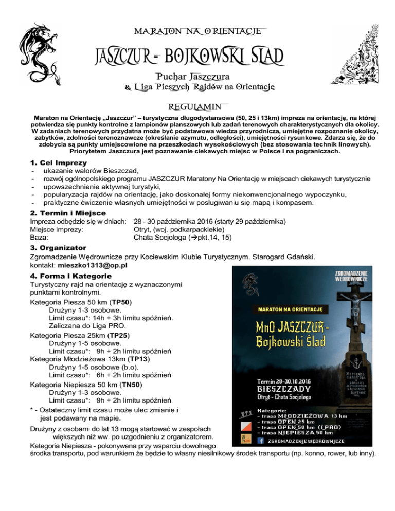 MARATON NA ORIENTACJE JASZCZUR –- BOJKOWSKI SLAD Puchar Jaszczura & L iga Pieszych Rajdow na Orientacje REGULAMIN Maraton na Orientację „Jaszczur” – turystyczna długodystansowa (50, 25 i 13km) impreza na orientację, na której potwierdza się punkty kontrolne z lampionów planszowych lub zadań terenowych charakterystycznych dla okolicy. W zadaniach terenowych przydatna może być podstawowa wiedza przyrodnicza, umiejętne rozpoznanie okolicy, zabytków, zdolności terenoznawcze (określanie azymutu, odległości), umiejętności rysunkowe. Zdarza się, że do zdobycia są punkty umiejscowione na przeszkodach wysokościowych (bez stosowania technik linowych). Priorytetem Jaszczura jest poznawanie ciekawych miejsc w Polsce i na pograniczach. 1. - Cel Imprezy ukazanie walorów Bieszczad, rozwój ogólnopolskiego programu JASZCZUR Maratony Na Orientację w miejscach ciekawych turystycznie upowszechnienie aktywnej turystyki, popularyzacja rajdów na orientację, jako doskonałej formy niekonwencjonalnego wypoczynku, praktyczne ćwiczenie własnych umiejętności w posługiwaniu się mapą i kompasem. 2. Termin i Miejsce Impreza odbędzie się w dniach: 28 - 30 października 2016 (starty 29 października) Miejsce imprezy: Otryt, (woj. podkarpackiekie) Baza: Chata Socjologa ( pkt.14, 15) 3. Organizator Zgromadzenie Wędrownicze przy Kociewskim Klubie Turystycznym. Starogard Gdański. kontakt: [email protected] 4. Forma i Kategorie Turystyczny rajd na orientację z wyznaczonymi punktami kontrolnymi. Kategoria Piesza 50 km (TP50) Drużyny 1-3 osobowe. Limit czasu*: 14h + 3h limitu spóźnień. Zaliczana do Liga PRO. Kategoria Piesza 25km (TP25) Drużyny 1-5 osobowe. Limit czasu*: 9h + 2h limitu spóźnień Kategoria Młodzieżowa 13km (TP13) Drużyny 1-5 osobowe (b.o). Limit czasu*: 6h + 2h limitu spóźnień Kategoria Niepiesza 50 km (TN50) Drużyny 1-3 osobowe. Limit czasu*: 9h + 2h limitu spóźnień * - Ostateczny limit czasu może ulec zmianie i jest podawany na mapie. Drużyny z osobami do lat 13 mogą startować w zespołach większych niż ww. po uzgodnieniu z organizatorem. Kategoria Niepiesza - pokonywana przy wsparciu dowolnego środka transportu, pod warunkiem że będzie to własny niesilnikowy środek transportu (np. konno, rower, lub inny). 5. Sędziowanie, Punktacja Sędziowanie na podstawie "Zasad punktacji i współzawodnictwa w turystycznych Imprezach na Orientację PTTK" dostępnymi m.in. na stronie Komisji InO ZG PTTK pod adresem: http://ino.pttk.pl/przepisy/reg/zasady_punktacji_i_wspolzawodnictwa_na_turystycznych_ino_pttk.pdf z poniższymi odstępstwami: potwierdzenie właściwego PK (punkt kontrolny) + 100 pkt brak potwierdzenia właściwego PK 0 pkt potwierdzenie PS (punkt stowarzyszony) + 60 pkt wykonanie zadania dodatkowego + 80 pkt potwierdzenie PK z LOP, obs. lub zadania lok. + 80 pkt zły opis lub brak opisu - 50 pkt potwierdzenie PS z LOP, obs. lub zadania lok. + 50 pkt punkty sędziowskie w każdej kategorii za jakość potwierdzeń graficznych, (nie obowiązuje w PMnO) do max. wysokości sumy etapu: 1x 50 pkt, 1x 30 pkt, 1x 20 pkt w uzasadnionych sytuacjach możliwy inny rozdział punktów przy zachowaniu sumy 100pkt Punkt mylny uznaje się w ciągu poprawek punktu kontrolnego. Nie obowiązuje par. V.5. „Zasad punktacji i współzawodnictwa w turystycznych Imprezach na Orientację PTTK” (w sytuacji BPK punkt jest anulowany na trasie, wpis BPK będzie weryfikowany tylko w koniecznych przypadkach). W przypadku nieprawidłowych zapisów w karcie startowej zawodnik otrzymuje: za pierwszym razem: ostrzeżenie za drugim razem: stosowną karę punktową (zły opis) za trzecim razem: nieklasyfikację (jeśli zasady punktacji i współzawodnictwa przewidują) Korekta limitu czasu za wiek: 1% - 10% dla osób 50 - 59 lat, 10% dla osób do 13lat lub od 60 lat, 15% dla osób do 10 lat. Pozostałe odstępstwa patrz: pkt 7. Zasady Potwierdzania Punktów Kontrolnych 5.1 Punktacja pucharowa w Pucharze Jaszczura TP 50 (klasyfikacja generalna) oraz TN 50: I miejsce - 20pkt, V miejsce - 14pkt, IX miejsce - 10pkt, XIII miejsce - 6pkt, XVII miejsce - 2pkt, II miejsce - 18pkt, VI miejsce - 13pkt, X miejsce - 9pkt, XIV miejsce - 5pkt, XVIII miejsce i dalsze - 1pkt. III miejsce - 16pkt, VII miejsce - 12pkt, XI miejsce - 8pkt, XV miejsce - 4pkt, IV miejsce - 15pkt, VIII miejsce - 11pkt, XII miejsce - 7pkt, XVI miejsce - 3pkt, TP 25: (klasyfikacja generalna oraz klasyfikacja TP25) I miejsce - 10pkt, IV miejsce - 7pkt, VII miejsce - 4pkt, X miejsce i dalsze - 1pkt. II miejsce - 9 pkt, V miejsce - 6pkt, VIII miejsce - 3pkt, III miejsce - 8pkt, VI miejsce - 5pkt, IX miejsce - 2pkt, Na cykl Pucharu Jaszczura składają się: JASZCZUR – Herkus z Natangii, JASZCZUR – Graniczna Woda, JASZCZUR – Bojkowski Ślad O ile najlepszy wynik nie zmieści się w 80% wartości PK trasy to liczba punktów pucharowych za I miejsce = 18pkt. Za kolejne odpowiednio niżej (16, 15, 14...). O ile najlepszy wynik nie zmieści się w 60% wartości PK trasy to liczba punktów pucharowych za I miejsce = 16pkt. Za kolejne odpowiednio niżej (15, 14, 13...). Uczestnik który wystartował na trasę zgodnie z listą startową uzyskuje co najmniej 1 punkt pucharowy. 5.1.1 Do klasyfikacji generalnej TP50 wliczają się wyniki drużyn z TP25, których wynik liczony od stałej etapu TP50 (ilość PK z TP50) jest wyższy od ostatniej sklasyfikowanej drużyny zgłoszonej do TP50 oraz wynosi co najmniej 30% stałej wartości etapu TP50. 5.2 Klasyfikacja LigaPRO Kategoria TP 50 wliczana jest do klasyfikacji Ligi PRO. Szczegóły na http://www.ligapro.pl 5.3 Klasyfikacja PMnO Kategoria TP 50 wliczana jest do klasyfikacji Pucharu Polski w Pieszych Maratonach na Orientację. Na potrzeby PMnO 50 będzie prowadzona oddzielna klasyfikacja uwzględniająca czas pokonania trasy (bez korekty za wiek). 5.4 Protesty Protesty co do oceny potwierdzeń i podliczenia potwierdzeń przyjmowane są po zakończeniu trasy przez uc