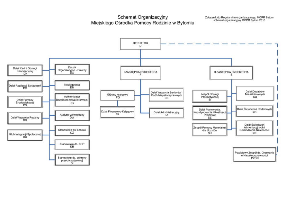 Schemat Organizacyjny Miejskiego Ośrodka Pomocy Rodzinie w Bytomiu Załącznik do Regulaminu organizacyjnego MOPR Bytom schemat organizacyjny MOPR Bytom 2016 DYREKTOR D Dział Kadr i Obsługi Kancelaryjnej DK Zespół Organizacyjno - Prawny DO Dział Realizacji Świadczeń PR Noclegownia DN Dział Pomocy Środowiskowej PS Dział Wsparcia Rodziny DD Klub Integracji Społecznej DU Administrator Bezpieczeństwa Informacji DY Audytor wewnętrzny DW Stanowisko ds. kontroli DZ I ZASTĘPCA DYREKTORA F Główny księgowy FG Dział Wsparcia Seniorów i Osób Niepełnosprawnych DS Dział Finansowo-Księgowy FK Dział Administracyjny FA II ZASTĘPCA DYREKTORA S Zespół Obsługi Informatycznej SI Dział Planowania, Koordynowania i Realizacji Projektów SE Zespół Pomocy Materialnej dla Uczniów SU Dział Dodatków Mieszkaniowych SD Dział Świadczeń Rodzinnych SR Dział Świadczeń Alimentacyjnych i Dochodzenia Należności SN Stanowisko ds. BHP DB Stanowisko ds. ochrony przeciwpożarowej DI Powiatowy Zespół ds. Orzekania o Niepełnosprawności PZON
