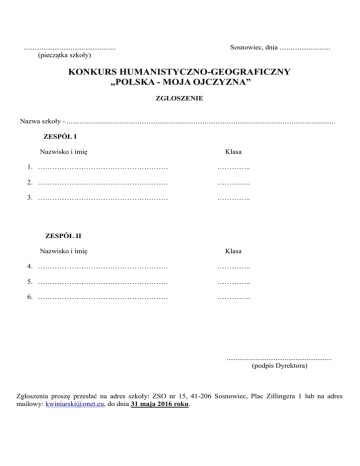 ................................................... (pieczątka szkoły) Sosnowiec, dnia ............................ KONKURS HUMANISTYCZNO-GEOGRAFICZNY „POLSKA - MOJA OJCZYZNA” ZGŁOSZENIE Nazwa szkoły - .................................................................................................................................................... ZESPÓŁ I Nazwisko i imię Klasa 1. ……………………………………………… ………….. 2. ……………………………………………… ………….. 3. ……………………………………………… ………….. ZESPÓŁ II Nazwisko i imię Klasa 4. ……………………………………………… ………….. 5. ……………………………………………… ………….. 6. ……………………………………………… ………….. .......................................................... (podpis Dyrektora) Zgłoszenia proszę przesłać na adres szkoły: ZSO nr 15, 41-206 Sosnowiec, Plac Zillingera 1 lub na adres mailowy: [email protected], do dnia 31 maja 2016 roku. REGULAMIN KONKURSU HUMANISTYCZNO-GEOGRAFICZNEGO „POLSKA - MOJA OJCZYZNA” POD PATRONATEM WICEMARSZAŁEK SEJMU RP BARBARY DOLNIAK 1. Organizatorem konkursu jest Zespół Szkół Ogólnokształcących nr 15 w Sosnowcu. 2. W konkursie mogą brać udział trzyosobowe zespoły uczniów z gimnazjów położonych na terenie Zagłębia i miast sąsiadujących z wyjątkiem Gimnazjum z Oddziałami Dwujęzycznymi nr 25 im. Stanisława Staszica wchodzącego w skład ZSO nr 15. Każde gimnazjum może wystawić maksymalnie dwa zespoły. 3. Konkurs składa się z dwóch etapów: I etap – test pisemny II etap – finał (quiz) 4. I Etap przeprowadzany polega na rozwiązaniu testu przygotowanego przez Komisję Konkursową powołaną przez Dyrektora Zespół Szkół Ogólnokształcących nr 15 w Sosnowcu. 5. Test składa się z kilkudziesięciu pytań z całego zakresu tematycznego (język polski, historia, geografia, system społeczny i ustrojowy Polski), a na jego rozwiązanie przeznacza się 45 minut. 6. Sprawdzenia testów dokonuje Komisja Konkursowa. 7. Do finału kwalifikuje się pięć najlepszych zespołów, które uzyskały największą liczbę punktów. 8. W razie równej ilości punktów uzyskanych przez uczniów o kolejności decyduje krótszy czas rozwiązywania testu. 9. Uczestnikom przysługuje prawo wglądu do swoich ocenionych prac i złożenia reklamacji do Komisji Konkursowej po ogłoszeniu wyników. Komisja rozpatruje odwołania w trybie natychmiastowym i bezzwłocznie informuje składającego odwołanie o swoim postanowieniu. Decyzja Komisji jest ostateczna. 10. Finał ma postać quizu. Quiz składa się z dwóch części. W pierwszej zawodnicy odpowiadają na cztery wylosowane przez siebie pytania – po jednym z zakresu języka polskiego, historii, geografii i wiedzy o społeczeństwie – z zestawu przygotowanego przez Komisję Konkursową. W drugiej części wybierają z zestawu pytań przygotowanych przez organizatorów cztery pytania i zadają je po jednym każdemu z przeciwników. W razie braku prawidłowej odpowiedzi zadający może sam jej udzielić i powiększyć w ten sposób swój zasób punktów. O kolejności zadawania pytań decyduje losowanie. Oceny odpowiedzi dokonuje Komisja Konkursowa, której decyzje są ostateczne. 11. O kolejności zajętych miejsc decyduje suma punktów uzyskanych na obydwu etapach konkursu. 12. W razie równej liczby punktów przeprowadza się dogrywkę na zasadach obowiązujących w drugiej części quizu przy czym każdy z uczestników dogrywki zadaje przeciwnikowi dwa pytania. W sytuacji, gdy nie wyłoni to zwycięzcy, przeprowadza się kolejne serie aż do skutku. Dyrektor ZSO nr 15 w Sosnowcu mgr Grzegorz Walotek SZCZEGÓŁOWY ZAKRES TEMATYCZNY KONKURSU 1. Język polski Literatura polska: - Henryk Sienkiewicz - „Krzyżacy” - Jan Kochanowski – fraszki: „O żywocie ludzkim”, „ O doktorze Hiszpanie”, „Na dom w Czarnolesie”, „Na nabożną”; pieśni: „Pieśń Świętojańska o Sobótce”, „Pieśń IX z Ksiąg Wtórych”; treny: V, VII, VIII. - Aleksander Fredro – „Zemsta” - Juliusz Słowacki – „Balladyna” - Adam Mickiewicz – sonety: „Stepy akermańskie”, „Burza”. - Aleksander Kamiński – „Kamienie na szaniec” - Adam Bahdaj – „Telemach w dżinsach” Nauka o języku: - fonetyka - rozbiór gramatyczny zdania - rozbiór logiczny zdania - słowotwórstwo 2. Historia Polski. - Polska pierwszych Piastów - Polska dzielnicowa i zjednoczona - Polska w dobie unii z Litwą - Polska i Litwa w czasach ostatnich Jagiellonów - społeczeństwo i ustrój Rzeczpospolitej Obojga Narodów - Rzeczpospolita Obojga Narodów i jej sąsiedzi w XVII wieku - Rzeczpospolita Obojga Narodów w XVIII wieku - Rzeczpospolita w dobie stanisławowskiej - walka o utrzymanie niepodległości w ostatnich latach XVIII wieku - sprawa polska w czasach napoleońskich - ziemie polskie po Kongresie Wiedeńskim - społeczeństwo dawnej Rzeczpospolitej w dobie powstań narodowych - życie pod zaborami - sprawa polska w I wojnie światowej 3. Geografia Polski - położenie środowisko geograficzne Polski - ludność Polski - geografia gospodarcza Polski - regiony geograficzne Polski 4. Ustrój społeczny i polityczny Polski - struktura społeczna i narodowa społeczeństwa polskiego - Rzeczpospolita Polska jako demokracja konstytucyjna - system wyborczy i partyjny w Polsce - władza ustawodawcza, wykonawcza i sądownicza w Polsce - samorząd terytorialny w Polsce - relacje Polski z innymi państwami - Polska w Unii Europejskiej PLANOWANY SCENARIUSZ KONKURSU 6 CZERWCA 2016 - godz. 8.30. – 9.00. - rejestracja - godz. 9.00. – powitanie uczestników - godz. 9.05. – 9.50. – test pisemny - godz. 10.00. – wykład Wicemarszałek Sejmu RP poseł Barbary Dolniak - godz. 11.00. – finał (quiz) - godz. 12.00. – ogłoszenie wyników konk