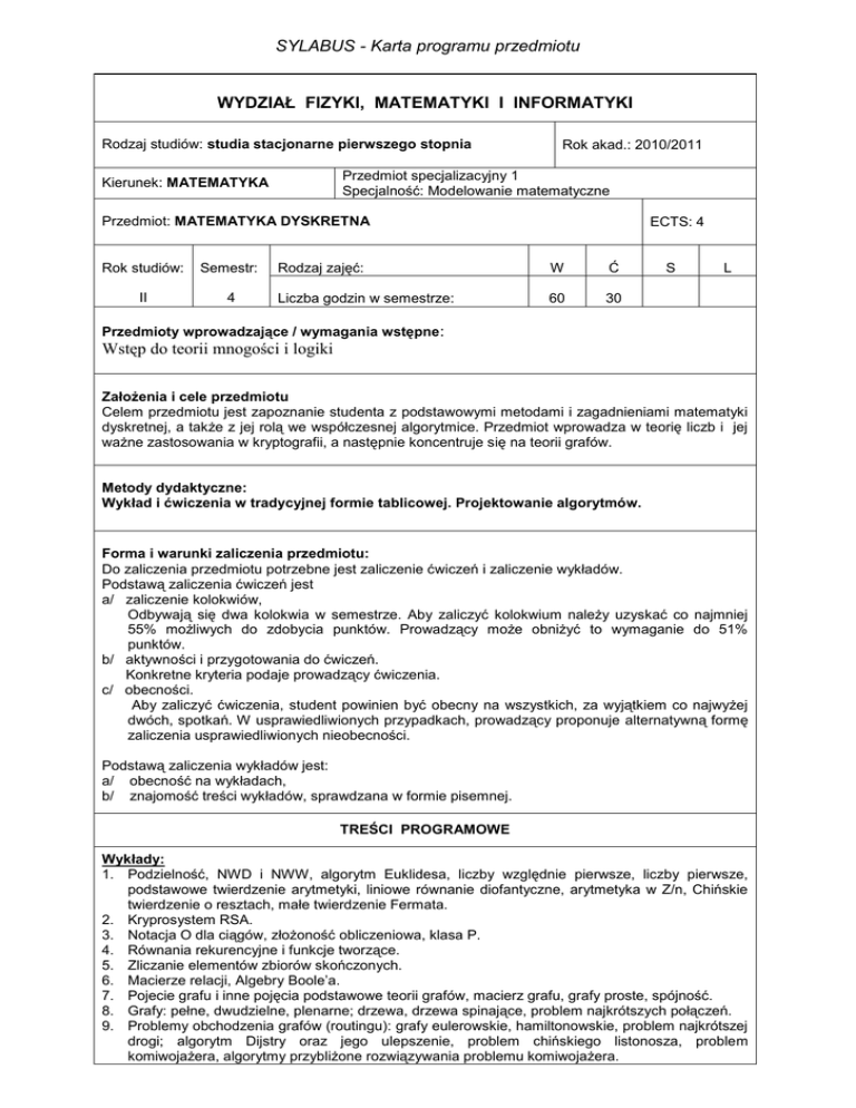 SYLABUS - Karta programu przedmiotu WYDZIAŁ FIZYKI, MATEMATYKI I INFORMATYKI Rodzaj studiów: studia stacjonarne pierwszego stopnia Rok akad.: 2010/2011 Przedmiot specjalizacyjny 1 Specjalność: Modelowanie matematyczne Kierunek: MATEMATYKA Przedmiot: MATEMATYKA DYSKRETNA Rok studiów: Semestr: II 4 ECTS: 4 Rodzaj zajęć: W Ć Liczba godzin w semestrze: 60 30 S L Przedmioty wprowadzające / wymagania wstępne: Wstęp do teorii mnogości i logiki Założenia i cele przedmiotu Celem przedmiotu jest zapoznanie studenta z podstawowymi metodami i zagadnieniami matematyki dyskretnej, a także z jej rolą we współczesnej algorytmice. Przedmiot wprowadza w teorię liczb i jej ważne zastosowania w kryptografii, a następnie koncentruje się na teorii grafów. Metody dydaktyczne: Wykład i ćwiczenia w tradycyjnej formie tablicowej. Projektowanie algorytmów. Forma i warunki zaliczenia przedmiotu: Do zaliczenia przedmiotu potrzebne jest zaliczenie ćwiczeń i zaliczenie wykładów. Podstawą zaliczenia ćwiczeń jest a/ zaliczenie kolokwiów, Odbywają się dwa kolokwia w semestrze. Aby zaliczyć kolokwium należy uzyskać co najmniej 55% możliwych do zdobycia punktów. Prowadzący może obniżyć to wymaganie do 51% punktów. b/ aktywności i przygotowania do ćwiczeń. Konkretne kryteria podaje prowadzący ćwiczenia. c/ obecności. Aby zaliczyć ćwiczenia, student powinien być obecny na wszystkich, za wyjątkiem co najwyżej dwóch, spotkań. W usprawiedliwionych przypadkach, prowadzący proponuje alternatywną formę zaliczenia usprawiedliwionych nieobecności. Podstawą zaliczenia wykładów jest: a/ obecność na wykładach, b/ znajomość treści wykładów, sprawdzana w formie pisemnej. TREŚCI PROGRAMOWE Wykłady: 1. Podzielność, NWD i NWW, algorytm Euklidesa, liczby względnie pierwsze, liczby pierwsze, podstawowe twierdzenie arytmetyki, liniowe równanie diofantyczne, arytmetyka w Z/n, Chińskie twierdzenie o resztach, małe twierdzenie Fermata. 2. Kryprosystem RSA. 3. Notacja O dla ciągów, złożoność obliczeniowa, klasa P. 4. Równania rekurencyjne i funkcje tworzące. 5. Zliczanie elementów zbiorów skończonych. 6. Macierze relacji, Algebry Boole’a. 7. Pojecie grafu i inne pojęcia podstawowe teorii grafów, macierz grafu, grafy proste, spójność. 8. Grafy: pełne, dwudzielne, plenarne; drzewa, drzewa spinające, problem najkrótszych połączeń. 9. Problemy obchodzenia grafów (routingu): grafy eulerowskie, hamiltonowskie, problem najkrótszej drogi; algorytm Dijstry oraz jego ulepszenie, problem chińskiego listonosza, problem komiwojażera, algorytmy przybliżone rozwiązywania problemu komiwojażera. 10. Redukcja problemu istnienia cyklu Hamiltona do problemu komiwojażera, uogólnienie: wielomianowa redukcja jednego problemu algorytmicznego do drugiego. Klasa NP. 11. Zastosowanie rozwiązania problemu najkrótszych połączeń do znajdowania dolnego ograniczenia rozwiązania problemu komiwojażera. 12. Grafy skierowane, sieci, przepływy w sieciach. 13. Problem kojarzenia małżeństw i jego zastosowanie. Ćwiczenia audytoryjne: 1. Wykorzystywanie relacji podzielności w zbiorze liczb całkowitych, stosowanie algorytmu Euklidesa, znajdowanie współczynników kombinacji liniowej liczb a i b, która daje NWD (a,b), przedstawianie liczb w systemach o różnych podstawach, rozwiązywanie liniowych równań diafantycznych, rozwiązywanie równań kongruencyjnych, zastosowanie małego twierdzenia Fermata. 2. Używanie kryptosystemu RSA do szyfrowania i podpisywania wiadomości. 3. Stosowanie notacji O dla ciągów, wyodrębnienie klas ciągów równoważnych ze względu na szybkość wzrostu, rozpoznawanie algorytmów wielomianowych. 4. Rozwiązywanie równań rekurencyjnych metodą przewidywań i metodą funkcji tworzących. Rozwiązywanie prostych zadań kombinatorycznych (zliczanie elementów zbiorów skończonych). 5. Proste zastosowanie teorii Boole’a, tłumaczenie własności relacji na język ich macierzy. 6. Zagadnienia praktyczne rozwiązywalne przy pomocy grafów, zadanie związane z lematem o uściskach dłoni, spójność, drogi, ścieżki, cykle, macierz kosztów. 7. Stosowanie algorytmów: Dijkstry, Fleury’ego, Kruskala, Prima, algorytm rozwiązywania problemu chińskiego listonosza, problem komiwojażera; algorytm dokładny i algorytmy przybliżone. 8. Stosowanie pojęć związanych z digrafami, znajdowanie minimalnych przekrojów i maksymalnych przepływów w sieciach. 9. Zastosowania problemu kojarzenia małżeństw. Wykaz literatury podstawowej: [1] Cz. Bagiński, Funkcje tworzące, http://aragorn.pb.bialystok.pl/~baginski/Pdf/F_tw.pdf. [2]J. A. Bondy, U. S. R. Murthy, Graph Theory with Applications, North-Holland 1976, dost [3] J. Gancarzewicz, Arytmetyka, Wydawnictwo UJ, Kraków 2000. [4] R. Graham, D. Knuth, O. Patashnik, Matematyka konkretna, PWN, Warszawa. [5] K. Ross, C. Wright, Matematyka dyskretna, PWN Warszawa. [6] R. Wilson, Wprowadzenie do teorii grafów, PWN Warszawa Wykaz literatury uzupełniającej: [1] J. A. Buchmann, Wprowadzenie do kryptografii, PWN, Warszawa 2006. [2]. E. Goodaire, M. Parmenter, Discrete Mathematics with Graph Theory, Pretince Hall 1998. [3] N. Koblitz, Wykłady z teorii liczb i kryptografii, WNT, Warszawa 1995. [4]W. Lipski, W. Marek, Analiza kombinatoryczna(BM 59), PWN, Warszawa 1986. [5] W. Narkiewicz, Teoria liczb, PWN, Warszawa 2003 Osoby odpowiedzialne za przedmiot: dr Katarzyna PAŁASIŃSKA, dr Artur PIĘKOSZ Zatwierdził: dr hab. Teresa WINIARSKA, prof. PK