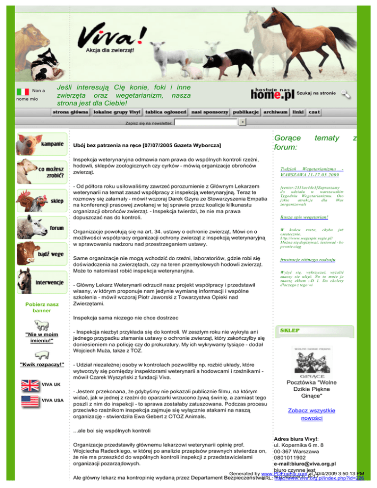 Non a nome mio Jeśli interesują Cię konie, foki i inne zwierzęta oraz wegetarianizm, nasza strona jest dla Ciebie! Zapisz się na newsletter: Szukaj na stronie » Ubój bez patrzenia na ręce [07/07/2005 Gazeta Wyborcza] Inspekcja weterynaryjna odmawia nam prawa do wspólnych kontroli rzeźni, hodowli, sklepów zoologicznych czy cyrków - mówią organizacje obrońców zwierząt. Pobierz nasz banner Gorące forum: tematy Tydzień Wegetarianizmu WARSZAWA 11-17.05.2009 - Od półtora roku usiłowaliśmy zawrzeć porozumienie z Głównym Lekarzem weterynarii na temat zasad współpracy z inspekcją weterynaryjną. Teraz te rozmowy się załamały - mówił wczoraj Darek Gzyra ze Stowarzyszenia Empatia na konferencji prasowej zwołanej w tej sprawie przez koalicje kilkunastu organizacji obrońców zwierząt. - Inspekcja twierdzi, że nie ma prawa dopuszczać nas do kontroli. [center:2351ac4de3]Zapraszamy do udziału w warszawskim Tygodniu Wegetarianizmu. Oto jakie atrakcje dla Was zorganizowali Organizacje powołują się na art. 34. ustawy o ochronie zwierząt. Mówi on o możliwości współpracy organizacji ochrony zwierząt z inspekcją weterynaryjną w sprawowaniu nadzoru nad przestrzeganiem ustawy. W końcu rusza, chyba już ostatecznie. http://www.wegespis.vegie.pl/ Można się dopisywać, testować - bo pewnie ciąg Same organizacje nie mogą wchodzić do rzeźni, laboratoriów, gdzie robi się doświadczenia na zwierzętach, czy na teren przemysłowych hodowli zwierząt. Może to natomiast robić inspekcja weterynaryjna. frustracje różnego rodzaju - Główny Lekarz Weterynarii odrzucił nasz projekt współpracy i przedstawił własny, w którym proponuje nam jedynie wymianę informacji i wspólne szkolenia - mówił wczoraj Piotr Jaworski z Towarzystwa Opieki nad Zwierzętami. z Rusza spis wegetarian! W yżyć się, wykrzyczeć, wyżalić znaczy sie ulżyć. No to może ja znaczę ekhem :-D 1. Do cholery dlaczego z tego wi Inspekcja sama niczego nie chce dostrzec "Nie w moim imieniu!" - Inspekcja niezbyt przykłada się do kontroli. W zeszłym roku nie wykryła ani jednego przypadku złamania ustawy o ochronie zwierząt, który zakończyłby się doniesieniem na policję czy do prokuratury. My ich wykrywamy tysiące - dodał Wojciech Muża, także z TOZ. "Kwik rozpaczy!" - Udział niezależnej osoby w kontrolach pozwoliłby np. rozbić układy, które wytworzyły się pomiędzy inspektorami weterynarii a hodowcami i rzeźnikami mówił Czarek Wyszyński z fundacji Viva. VIVA UK VIVA USA - Jestem przekonana, że gdybyśmy nie pokazali publicznie filmu, na którym widać, jak w jednej z rzeźni do oparzarki wrzucono żywą świnię, a zamiast tego poszli z nim do inspekcji - to sprawa zostałaby zatuszowana. Podczas procesu przeciwko rzeźnikom inspekcja zajmuje się wyłącznie atakami na naszą organizację - stwierdziła Ewa Gebert z OTOZ Animals. Pocztówka "Wolne Dzikie Piękne Ginące" Zobacz wszystkie nowości ...ale boi się wspólnych kontroli Adres biura Vivy!: ul. Kopernika 6 m. 8 00-367 Warszawa 0801011902 e-mail:[email protected] biuro czynne jest Generated by www.PDFonFly.com at 10/4/2009 3:50:13 PM godzinach: 9-17 Ale główny lekarz ma kontropinię wydaną przez Departament Bezpieczeństwa URL: w http://www.viva.org.pl/index.php?id=226 Organizacje przedstawiły głównemu lekarzowi weterynarii opinię prof. Wojciecha Radeckiego, w której po analizie przepisów prawnych stwierdza on, że nie ma przeszkód do wspólnych kontroli inspekcji z przedstawicielami organizacji pozarządowych. od poniedziałku do piątku Żywności i Weterynarii Ministerstwa Rolnictwa. napisz do nas - Nie mamy nic przeciwko wspólnym kontrolom, ale ta opinia nas wiąże zadeklarował "Gazecie" zastępca głównego lekarza Janusz Związek. Napisz na gg Zdumiało to Piotra Jakubowskiego, wicedyrektora tego departamentu. - To inspektorzy weterynarii mówili nam, że nie chcą robić wspólnych kontroli z przedstawicielami obrońców zwierząt, bo musieliby za nich brać odpowiedzialność. Nasza opinia rzeczywiście mówi o przeszkodach, ale nie jest wiążącą interpretacją prawa. Uważam, że przeszkody usunęłoby porozumienie, które może zawrzeć z organizacjami główny lekarz weterynarii. Trzeba by w nim zapisać, że w kontrolach mogą uczestniczyć tylko konkretne, przeszkolone wcześniej osoby, które miałyby status osób przybranych przez funkcjonariuszy publicznych do pomocy przy wykonywaniu obowiązków. Niech marszałek Senatu rozstrzygnie TOZ zwrócił się do marszałka Senatu o interpretację prawa do wspólnych kontroli. Wszystkie organizacje podpisały zaś protest w sprawie potraktowania ich propozycji współpracy przez głównego lekarza weterynarii, który zamierzają rozesłać do najwyższych władz. A w przyszłym parlamencie chcą walczyć o doprecyzowanie prawa. Konto: Fundacja Viva! KREDYT BANK S.A. VI O/Warszawa 53 1500 2080 1220 8000 0100 0000 KRS 0000135274 Wpłać dotację przez Internet! 0.00 zł Wpłać es serwisy.gazeta.pl/kraj/1,34308,2807438.html [webmaster] Prawa autorskie zastrzeżone, przeczytaj TUTAJ o kopiowaniu materiałów Fundacja Viva! 2004 Ratujemy konie skazane na rzeź i zwierzęta zaniedbywane przez swoich właścicieli. Prowadzimy kampanię przeciwko polowaniom na foki w Kanadzie. Propagujemy wegetarianizm jako najlepszy sposób na ograniczenie cierpienia zwierząt. Generated by www.PDFonFly.com at 10/4/2009 3:50:13 PM URL: http://www.viva.org.pl/index.php?id=226