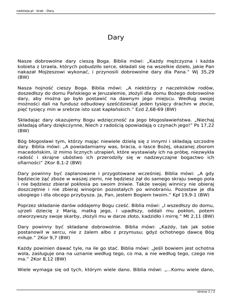 nadzieja.pl - brak - Dary Dary Nasze dobrowolne dary cieszą Boga. Biblia mówi: „Każdy mężczyzna i każda kobieta z Izraela, których pobudziło serce, składali się na wszelkie dzieło, jakie Pan nakazał Mojżeszowi wykonać, i przynosili dobrowolne dary dla Pana.” Wj 35,29 (BW) Nasza hojność cieszy Boga. Biblia mówi: „A niektórzy z naczelników rodów, doszedłszy do domu Pańskiego w Jeruzalemie, złożyli dla domu Bożego dobrowolne dary, aby można go było postawić na dawnym jego miejscu. Według swojej możności dali na fundusz odbudowy sześćdziesiąt jeden tysięcy drachm w złocie, pięć tysięcy min w srebrze isto szat kapłańskich.” Ezd 2,68-69 (BW) Składając dary okazujemy Bogu wdzięczność za Jego błogosławieństwa. „Niechaj składają ofiary dziękczynne, Niech z radością opowiadają o czynach jego!” Ps 17,22 (BW) Bóg błogosławi tym, którzy mając niewiele dzielą się z innymi i składają szczodre dary. Biblia mówi: „A powiadamiamy was, bracia, o łasce Bożej, okazanej zborom macedońskim, iż mimo licznych utrapień, które wystawiały ich na próbę, niezwykła radość i skrajne ubóstwo ich przerodziły się w nadzwyczajne bogactwo ich ofiarności” 2Kor 8,1-2 (BW) Dary powinny być zaplanowane i przygotowane wcześniej. Biblia mówi: „A gdy będziecie żąć zboże w waszej ziemi, nie będziesz żął do samego skraju swego pola i nie będziesz zbierał pokłosia po swoim żniwie. Także swojej winnicy nie obieraj doszczętnie i nie zbieraj winogron pozostałych po winobraniu. Pozostaw je dla ubogiego i dla obcego przybysza. Ja, Pan, jestem Bogiem twoim.” Kpł 19,9-1 (BW) Poprzez składanie darów oddajemy Bogu cześć. Biblia mówi: „I wszedłszy do domu, ujrzeli dziecię z Marią, matką jego, i upadłszy, oddali mu pokłon, potem otworzywszy swoje skarby, złożyli mu w darze złoto, kadzidło i mirrę.” Mt 2,11 (BW) Dary powinny być składane dobrowolnie. Biblia mówi: „Każdy, tak jak sobie postanowił w sercu, nie z żalem albo z przymusu; gdyż ochotnego dawcę Bóg miłuje.” 2Kor 9,7 (BW) Każdy powinien dawać tyle, na ile go stać. Biblia mówi: „Jeśli bowiem jest ochotna wola, zasługuje ona na uznanie według tego, co ma, a nie według tego, czego nie ma.” 2Kor 8,12 (BW) Wiele wymaga się od tych, którym wiele dano. Biblia mówi: „...Komu wiele dano, strona 1 / 2 nadzieja.pl - brak - Dary od tego wiele będzie się żądać, a komu wiele powierzono, od tego więcej będzie się wymagać.” Łk 12,48 (BW) Bóg błogosławi tym, którzy oddają dziesięciny i składają dary. Biblia mówi: „Czy człowiek może oszukiwać Boga? Bo wy mnie oszukujecie! Lecz wy pytacie: W czym cię oszukaliśmy? W dziesięcinach i daninach... Przynieście całą dziesięcinę do spichlerza, aby był zapas w moim domu, iw ten sposób wystawcie mnie na próbę! — mówi Pan Zastępów — czy wam nie otworzę okien niebieskich i nie wyleję na was błogosławieństwa ponad miarę.” Ml 3,8.10 (BW) Kto hojnie daje, wiele otrzyma. Biblia mówi: „Dawajcie, a będzie wam dane; miarę dobrą, natłoczoną, utrzęsioną i opływającą wsypią w zanadrza wasze. Odmierzą wam bowiem taką miarą, jaką wy mierzycie.” Łk 6,38 (BT) Bóg dał nam najwspanialszy dar. Biblia mówi: „Albowiem tak Bóg umiłował świat, że Syna swego jednorodzonego dał, aby każdy, kto weń wierzy, nie zginął, ale miał żywot wieczny.” J 3,16 (BW) *** Stosowane skróty: BW - Biblia Warszawska (tzw. Nowy Przekład) BT - Biblia Tysiąclecia BWP - Biblia Warszawsko-Praska (Biblia bpa Romaniuka) strona 2 / 2 Powered by TCPDF (www.tcpdf.org)