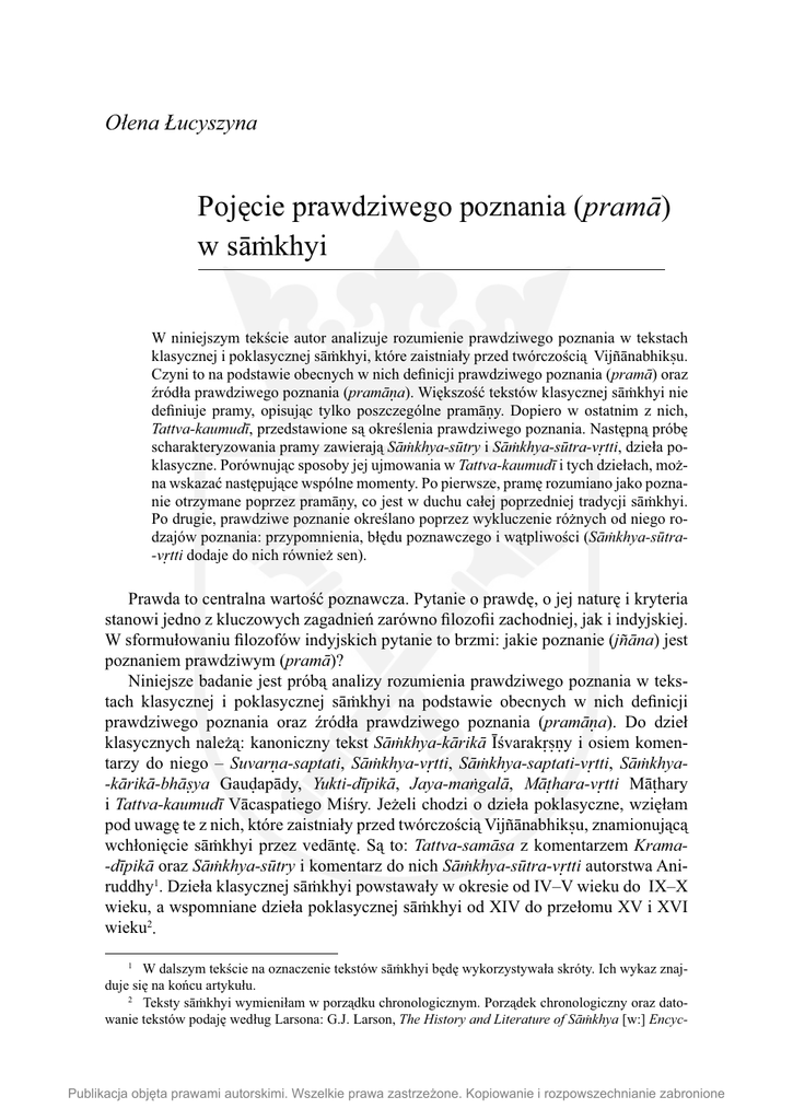 Ołena Łucyszyna Pojęcie prawdziwego poznania (pramā) w sāṁkhyi W niniejszym tekście autor analizuje rozumienie prawdziwego poznania w tekstach klasycznej i poklasycznej sāṁkhyi, które zaistniały przed twórczością Vijñānabhikṣu. Czyni to na podstawie obecnych w nich definicji prawdziwego poznania (pramā) oraz źródła prawdziwego poznania (pramāṇa). Większość tekstów klasycznej sāṁkhyi nie definiuje pramy, opisując tylko poszczególne pramāṇy. Dopiero w ostatnim z nich, Tattva-kaumudī, przedstawione są określenia prawdziwego poznania. Następną próbę scharakteryzowania pramy zawierają Sāṁkhya-sūtry i Sāṁkhya-sūtra-vṛtti, dzieła poklasyczne. Porównując sposoby jej ujmowania w Tattva-kaumudī i tych dziełach, można wskazać następujące wspólne momenty. Po pierwsze, pramę rozumiano jako poznanie otrzymane poprzez pramāṇy, co jest w duchu całej poprzedniej tradycji sāṁkhyi. Po drugie, prawdziwe poznanie określano poprzez wykluczenie różnych od niego rodzajów poznania: przypomnienia, błędu poznawczego i wątpliwości (Sāṁkhya-sūtra-vṛtti dodaje do nich również sen). Prawda to centralna wartość poznawcza. Pytanie o prawdę, o jej naturę i kryteria stanowi jedno z kluczowych zagadnień zarówno filozofii zachodniej, jak i indyjskiej. W sformułowaniu filozofów indyjskich pytanie to brzmi: jakie poznanie (jñāna) jest poznaniem prawdziwym (pramā)? Niniejsze badanie jest próbą analizy rozumienia prawdziwego poznania w tekstach klasycznej i poklasycznej sāṁkhyi na podstawie obecnych w nich definicji prawdziwego poznania oraz źródła prawdziwego poznania (pramāṇa). Do dzieł klasycznych należą: kanoniczny tekst Sāṁkhya-kārikā Īśvarakṛṣṇy i osiem komentarzy do niego – Suvarṇa-saptati, Sāṁkhya-vṛtti, Sāṁkhya-saptati-vṛtti, Sāṁkhya-kārikā-bhāṣya Gauḍapādy, Yukti-dīpikā, Jaya-maṅgalā, Māṭhara-vṛtti Māṭhary i Tattva-kaumudī Vācaspatiego Miśry. Jeżeli chodzi o dzieła poklasyczne, wzięłam pod uwagę te z nich, które zaistniały przed twórczością Vijñānabhikṣu, znamionującą wchłonięcie sāṁkhyi przez vedāntę. Są to: Tattva-samāsa z komentarzem Krama-dīpikā oraz Sāṁkhya-sūtry i komentarz do nich Sāṁkhya-sūtra-vṛtti autorstwa Aniruddhy1. Dzieła klasycznej sāṁkhyi powstawały w okresie od IV–V wieku do IX–X wieku, a wspomniane dzieła poklasycznej sāṁkhyi od XIV do przełomu XV i XVI wieku2. 1 W dalszym tekście na oznaczenie tekstów sāṁkhyi będę wykorzystywała skróty. Ich wykaz znajduje się na końcu artykułu. 2 Teksty sāṁkhyi wymieniłam w porządku chronologicznym. Porządek chronologiczny oraz datowanie tekstów podaję według Larsona: G.J. Larson, The History and Literature of Sāṁkhya [w:] Encyc- Publikacja objęta prawami autorskimi. Wszelkie prawa zastrzeżone. Kopiowanie i rozpowszechnianie zabronione 254 Ołena Łucyszyna Temat niniejszego artykułu jest tematem prawie niezbadanym. Spotkałam tylko jedną pracę poświęconą ogólnej definicji prawdziwego poznania (pramā) i jego źródła/instrumentu/środka/drogi/procedury osiągnięcia (pramāṇa) w sāṁkhyi. Jest to piętnastostronicowy rozdział książki Sh. Kumara, zatytułowany „Natura wiarygodnego poznania i jego środki”3. Autor wprawdzie omawia obecne w sāṁkhyi określenia prāmy i pramāṇy, ale w większej części swojego badania skupia się na zagadnieniu umiejscowienia prawdy, a nie na cechach, które odróżniają prawdę od innych rodzajów poznania (jñāna). Ponadto jego analizy tych cech nie można uznać za systematyczną. Teksty klasycznej sāṁkhyi poprzedzające TK, a także TS i KD nie definiują pramy. Wymieniają i opisują poszczególne pramāṇy (zob. kāriki 4, 5, 6 SK oraz komentarze do tych kārik, a także TS i KD 22), z których pochodzi (bądź dzięki którym odbywa się), mówiąc słowami autora kārik, „ustalenie przedmiotów prawdziwego poznania” (prameya-siddhi) (SK 4)4. Co jednak oznacza owo „ustalenie” (siddhi)? Ani Sāṁkhya-kārikā, ani klasyczne komentarze do niej poprzedzające Tattva-kaumudī, ani TS i KD nie dają wyjaśniającej odpowiedzi na to pytanie5. Teksty te nie zawierają również ogólnej definicji pramāṇy. Ich autorzy ograniczają się do nazywania pramāṇ „miarami” do mierzenia przedmiotów poznania; opierają się przy tym na etymologii słowa pramāṇa, którego podstawowym znaczeniem jest właśnie „miara” do mierzenia rożnych rzeczy (zob. np.: GB 4, YD 4, MV 4). Nieobecność ogólnej lopedia of Indian Philosophies, t. 4: Sāṁkhya. A Dualist Tradition in Indian Philosophy, red. G.J. Larson, R.Sh. Bhattacharya, MLBD Publishers, Delhi 1987, s. 14–18. 3 Sh. Kumar, Nature of Valid Knowledge and Its Means [w:] Sh. Kumar, Sāṁkhya-Yoga Epistemology, Eastern Book Linkers, Delhi 1984, s. 21–36. 4 Na teksty sāṁkhyi będę się powoływała według wydań (w porządku alfabetycznym): Aniruddha’s Commentary and the Original Parts of the Vedāntin Mahādeva’s Commentary to the Sāṁkhya Sūtras, red. R. Garbe, Baptist Mission Press, Calcutta 1888; Sāṁkhyakārikā. Māṭharavṛtti. Jayamaṅgalā, red. V.P. Sharma, S.Sh. Vangiya, Chowkhamba Sanskrit Series Office, Varanasi 1970; Sāṁkhyakārikā of Īśvarakṛṣṇa with the Commentary of Gauḍapādabhāṣya, red. i przeł. T.G. Mainkar, Oriental Book Agency, Poona 1972; Sāṁkhya-Saṅgraha. A Collection of the Works of Sāṁkhya Philosophy, red. V.P. Dvivedin, Chowkhamba Sanskrit Series Office, Benares 1920 (w tym zbiorze tekstów umieszczone są TS i KD); Sāṁkhya-Saptati-Vṛtti (V1), red. E.A. Solomon, Gujarat University, Ahmedabad 1973; Sāṁkhya-Vṛtti (V2), red. E.A. Solomon, Gujarat University, Ahmedabad 1973; Suvarṇasaptati Śāstra. Sāṁkhya-Kārikā-Saptati of Īśvara-Kṛṣṇa with a Commentary. Reconstructed into Sanskrit from the Chinese Trans