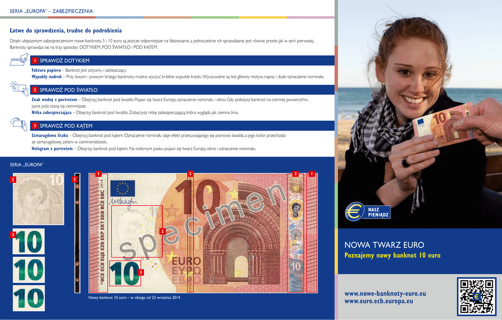 SERIA „EUROPA” – ZABEZPIECZENIA Łatwe do sprawdzenia, trudne do podrobienia Dzięki ulepszonym zabezpieczeniom nowe banknoty 5 i 10 euro są jeszcze odporniejsze na fałszowanie, a jednocześnie ich sprawdzanie jest równie proste jak w serii pierwszej. Banknoty sprawdza się na trzy sposoby: DOTYKIEM, POD ŚWIATŁO i POD KĄTEM. 1 SPRAWDŹ DOTYKIEM Faktura papieru – Banknot jest sztywny i szeleszczący. Wypukły nadruk – Przy lewym i prawym brzegu banknotu można wyczuć krótkie wypukłe kreski. Wyczuwalne są też: główny motyw, napisy i duże oznaczenie nominału. 2 SPRAWDŹ POD ŚWIATŁO Znak wodny z portretem – Obejrzyj banknot pod światło. Pojawi się twarz Europy, oznaczenie nominału i okno. Gdy położysz banknot na ciemnej powierzchni, jasne pola staną się ciemniejsze. Nitka zabezpieczająca – Obejrzyj banknot pod światło. Zobaczysz nitkę zabezpieczającą, która wygląda jak ciemna linia. 3 SPRAWDŹ POD KĄTEM Szmaragdowa liczba – Obejrzyj banknot pod kątem. Oznaczenie nominału daje efekt przesuwającego się pionowo światła, a jego kolor przechodzi ze szmaragdowej zieleni w ciemnoniebieski. Hologram z portretem – Obejrzyj banknot pod kątem. Na srebrnym pasku pojawi się twarz Europy, okno i oznaczenie nominału. SERIA „EUROPA” 2 1 2 3 1 2 2 3 NOWA TWARZ EURO Poznajemy nowy banknot 10 euro 3 Nowy banknot 10 euro – w obiegu od 23 września 2014 www.nowe-banknoty-euro.eu www.euro.ecb.europa.eu SERIA „EUROPA” – INFORMACJE OGÓLNE Pewny środek płatniczy Nowa twarz banknotów euro Banknoty euro weszły do obiegu w 2002 roku i od tego czasu stały się jednym z najpewniejszych środków płatniczych na świecie. Aby nadal cieszyły się takim zaufaniem, w serii „Europa” wykorzystano najnowsze osiągnięcia w technice produkcji banknotów. Mario Draghi Prezes Europejskiego Banku Centralnego Stopniowe wprowadzanie nowej serii Tradycyjnym motywem banknotów na całym świecie są portrety. Z badań wynika, że ludzie intuicyjnie rozpoznają i zapamiętują twarze. Dlatego też Eurosystem postanowił, że w nowej serii banknotów euro motywem znaku wodnego i hologramu będzie portret Europy – postaci z mitologii greckiej. Wizerunek ten pochodzi z liczącej sobie ponad dwa tysiące lat wazy znalezionej w południowych Włoszech, która obecnie znajduje się w paryskim Luwrze. Wybór padł na portret Europy, gdyż kojarzy się ona z nazwą naszego kontynentu, a zarazem nadaje banknotom ludzki wymiar. www.nbb.be www.bundesbank.de www.eestipank.ee www.centralbank.ie www.bankofgreece.gr www.bde.es www.banque-france.fr www.bancaditalia.it www.centralbank.gov.cy www.bank.lv www.bcl.lu www.centralbankmalta.org www.dnb.nl www.oenb.at www.bportugal.pt www.nbs.sk www.bsi.si www.bof.fi Seria „Europa” będzie wprowadzana przez kilka lat. W 2013 wszedł do obiegu nowy banknot 5 euro, a 23 września 2014 pojawi się nowe 10 euro. Banknoty z pierwszej serii przez pewien czas pozostaną w obiegu razem z nowymi. Gdy przestaną już być prawnym środkiem płatniczym, będzie je można bezterminowo wymieniać we wszystkich krajowych bankach centralnych należących do Eurosystemu. Szczegółowe informacje: www.nowe-banknoty-euro.eu PIERWSZA SERIA SERIA „EUROPA” Strona przednia Więcej informacji o banknotach i monetach euro można uzyskać w swoim banku centralnym lub w EBC: Strona odwrotna Strona przednia Europejski Bank Centralny Kaiserstrasse 29 60311 Frankfurt nad Menem Niemcy Strona odwrotna Tel. +49 69 1344 7455 / Faks +49 69 1344 7401 E-mail: [email protected] www.nowe-banknoty-euro.eu www.euro.ecb.europa.eu SERIA „EUROPA” – INFORMACJE OGÓLNE Pewny środek płatniczy Nowa twarz banknotów euro Banknoty euro weszły do obiegu w 2002 roku i od tego czasu stały się jednym z najpewniejszych środków płatniczych na świecie. Aby nadal cieszyły się takim zaufaniem, w serii „Europa” wykorzystano najnowsze osiągnięcia w technice produkcji banknotów. Mario Draghi Prezes Europejskiego Banku Centralnego Stopniowe wprowadzanie nowej serii Tradycyjnym motywem banknotów na całym świecie są portrety. Z badań wynika, że ludzie intuicyjnie rozpoznają i zapamiętują twarze. Dlatego też Eurosystem postanowił, że w nowej serii banknotów euro motywem znaku wodnego i hologramu będzie portret Europy – postaci z mitologii greckiej. Wizerunek ten pochodzi z liczącej sobie ponad dwa tysiące lat wazy znalezionej w południowych Włoszech, która obecnie znajduje się w paryskim Luwrze. Wybór padł na portret Europy, gdyż kojarzy się ona z nazwą naszego kontynentu, a zarazem nadaje banknotom ludzki wymiar. www.nbb.be www.bundesbank.de www.eestipank.ee www.centralbank.ie www.bankofgreece.gr www.bde.es www.banque-france.fr www.bancaditalia.it www.centralbank.gov.cy www.bank.lv www.bcl.lu www.centralbankmalta.org www.dnb.nl www.oenb.at www.bportugal.pt www.nbs.sk www.bsi.si www.bof.fi Seria „Europa” będzie wprowadzana przez kilka lat. W 2013 wszedł do obiegu nowy banknot 5 euro, a 23 września 2014 pojawi się nowe 10 euro. Banknoty z pierwszej serii przez pewien czas pozostaną w obiegu razem z nowymi. Gdy przestaną już być prawnym środkiem płatniczym, będzie je można bezterminowo wymieniać we wszystkich krajowych bankach centralnych należących do Eurosystemu. Szczegółowe informacje: www.nowe-banknoty-euro.eu PIERWSZA SERIA SERIA „EUROPA” Strona przednia Więcej informacji o banknotach i monetach euro można uzyskać w swoim banku centralnym lub w EBC: Strona odwrotna Strona przednia Europejski Bank Centralny Kaiserstrasse 29 60311 Frankfurt nad Menem Niemcy Strona odwrotna Tel. +49 69 1344 7455 / Faks +49 69 1344 7401 E-mail: [email protected] www.nowe-banknoty-euro.eu www.euro.ecb.europa.eu SERIA „EUROPA” – ZABEZPIECZENIA Łatwe do sprawdzenia, trudne do podrobienia Dzięki ulepszonym zabezpieczeniom nowe banknoty 5 i 10 euro są jeszcze odporniejsze na fałszowanie, a jednocześnie ich sprawdzan