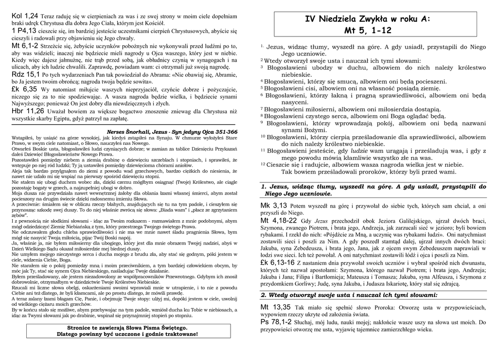 Kol 1,24 Teraz raduję się w cierpieniach za was i ze swej strony w moim ciele dopełniam braki udręk Chrystusa dla dobra Jego Ciała, którym jest Kościół. 1 P4,13 cieszcie się, im bardziej jesteście uczestnikami cierpień Chrystusowych, abyście się cieszyli i radowali przy objawieniu się Jego chwały. Mt 6,1-2 StrzeŜcie się, Ŝebyście uczynków poboŜnych nie wykonywali przed ludźmi po to, aby was widzieli; inaczej nie będziecie mieli nagrody u Ojca waszego, który jest w niebie. Kiedy więc dajesz jałmuŜnę, nie trąb przed sobą, jak obłudnicy czynią w synagogach i na ulicach, aby ich ludzie chwalili. Zaprawdę, powiadam wam: ci otrzymali juŜ swoją nagrodę. Rdz 15,1 Po tych wydarzeniach Pan tak powiedział do Abrama: «Nie obawiaj się, Abramie, bo Ja jestem twoim obrońcą; nagroda twoja będzie sowita». £k 6,35 Wy natomiast miłujcie waszych nieprzyjaciół, czyńcie dobrze i poŜyczajcie, niczego się za to nie spodziewając. A wasza nagroda będzie wielka, i będziecie synami NajwyŜszego; poniewaŜ On jest dobry dla niewdzięcznych i złych. Hbr 11,26 UwaŜał bowiem za większe bogactwo znoszenie zniewag dla Chrystusa niŜ wszystkie skarby Egiptu, gdyŜ patrzył na zapłatę. Nerses Šnorhali, Jezus - Syn jedyny Ojca 351-366 Wstąpiłeś, by usiąść na górze wysokiej, jak kiedyś zstąpiłeś na Synaju. W chmurze wyłoŜyłeś Stare Prawo, w swym ciele natomiast, o Słowo, nauczyłeś nas Nowego. Otwarłeś Boskie usta, błogosławiłeś ludzi czyniących dobrze; w zamian za tablice Dziesięciu Przykazań dałeś Dziewięć Błogosławieństw Nowego Prawa. Pozostawiłeś pomiędzy niebem a ziemią drabinę o dziewięciu szczeblach i stopniach, i sprawiłeś, Ŝe wstępuje po niej ród ludzki; Ty ją ustawiłeś pomiędzy dziewięcioma chórami aniołów. Aleja tak bardzo przylgnąłem do ziemi z powodu wad grzechowych, bardzo cięŜkich do niesienia, Ŝe nawet nie udało mi się wspiąć na pierwszy spośród dziewięciu stopni. Nie stałem się ubogi duchem wobec zła, dzięki czemu mógłbym osiągnąć (Twoje) Królestwo, ale ciągle pozostaję bogaty w grzech, a najzupełniej ubogi w dobro. Moja dusza nie przywdziała nawet wewnętrznej Ŝałoby dla oblania łzami własnej śmierci, abym został pocieszony na drugim świecie dzięki radosnemu imieniu Słowa. A przeciwnie: śmiałem się w obliczu rzeczy błahych, znajdujących się tu na tym padole, i cieszyłem się przynosząc szkodę swej duszy. To do niej właśnie zwrócą się słowa: „Biada wam” i „płacz ze zgrzytaniem zębów”. I z pewnością nie słodkimi słowami - idąc za Twoim rozkazem - rozmawiałem z mnie podobnymi, abym mógł odziedziczyć Ziemię Niebiańską z tym, który przestrzega Twojego świętego Prawa. Nie odczuwałem głodu chleba sprawiedliwości i nie ma we mnie nawet śladu pragnienia Słowa, bym mógł się nasycić Twoją miłością, pijąc Twój Boski napój. Ja, właśnie ja, nie byłem miłosierny dla ubogiego, który jest dla mnie obrazem Twojej nadziei, abyś w Dzień Wielkiego Sądu okazał miłosierdzie mej biednej duszy. Nie umyłem mojego nieczystego serca i ducha mojego z brudu zła, aby stać się godnym, póki jestem w ciele, widzenia Ciebie, Boga. Nie starałem się o pokój pomiędzy mną i moim przeciwnikiem, a tym bardziej człowiekiem obcym, by móc jak Ty, stać się synem Ojca Niebieskiego, naśladując Twoje działanie. Byłem prześladowany, ale jestem niezadowolony ze współpracowników Przewrotnego. Gdybym ich znosił dobrowolnie, otrzymałbym w dziedzictwie Twoje Królestwo Niebieskie. Rzucali mi liczne słowa obelgi, oskarŜeniami swoimi wprawiali mnie w utrapienie, i to nie z powodu Ciebie ani teŜ dlatego, Ŝe byli kłamcami, ale po prostu dlatego, Ŝe mówili prawdę. A teraz zalany łzami błagam Cię, Panie, i obejmuję Twoje stopy: ulŜyj mi, dopóki jestem w ciele, uwolnij od wielkiego cięŜaru moich grzechów. By w końcu stało się moŜliwe, abym przebywając na tym padole, wzniósł ducha ku Tobie w niebiosach, a idąc za Twymi słowami jak po drabinie, wspinał się przynajmniej stopień po stopniu. Stronice te zawierają Słowa Pisma Świętego. Dlatego powinny być uczczone i godnie traktowane! IV Niedziela Zwykła w roku A: Mt 5, 1-12 1. Jezus, widząc tłumy, wyszedł na górę. A gdy usiadł, przystąpili do Niego Jego uczniowie. 2 Wtedy otworzył swoje usta i nauczał ich tymi słowami: 3 Błogosławieni ubodzy w duchu, albowiem do nich naleŜy królestwo niebieskie. 4 Błogosławieni, którzy się smucą, albowiem oni będą pocieszeni. 5 Błogosławieni cisi, albowiem oni na własność posiądą ziemię. 6 Błogosławieni, którzy łakną i pragną sprawiedliwości, albowiem oni będą nasyceni. 7 Błogosławieni miłosierni, albowiem oni miłosierdzia dostąpią. 8 Błogosławieni czystego serca, albowiem oni Boga oglądać będą. 9 Błogosławieni, którzy wprowadzają pokój, albowiem oni będą nazwani synami BoŜymi. 10 Błogosławieni, którzy cierpią prześladowanie dla sprawiedliwości, albowiem do nich naleŜy królestwo niebieskie. 11 Błogosławieni jesteście, gdy ludzie wam urągają i prześladują was, i gdy z mego powodu mówią kłamliwie wszystko złe na was. 12 Cieszcie się i radujcie, albowiem wasza nagroda wielka jest w niebie. Tak bowiem prześladowali proroków, którzy byli przed wami. 1. Jezus, widząc tłumy, wyszedł na górę. A gdy usiadł, przystąpili do Niego Jego uczniowie. Mk 3,13 Potem wyszedł na górę i przywołał do siebie tych, których sam chciał, a oni przyszli do Niego. Mt 4,18-22 Gdy Jezus przechodził obok Jeziora Galilejskiego, ujrzał dwóch braci, Szymona, zwanego Piotrem, i brata jego, Andrzeja, jak zarzucali sieć w jezioro; byli bowiem rybakami. I rzekł do nich: «Pójdźcie za Mną, a uczynię was rybakami ludzi». Oni natychmiast zostawili sieci i poszli za Nim. A gdy poszedł stamtąd dalej, ujrzał innych dwóch braci: Jakuba, syna Zebedeusza, i br