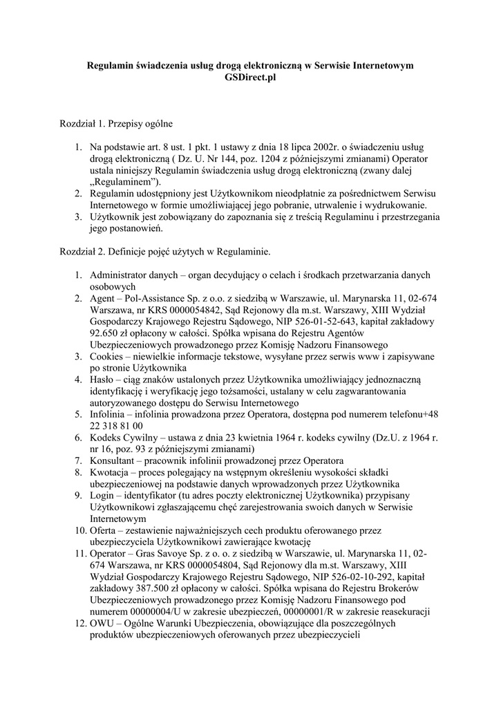 Regulamin świadczenia usług drogą elektroniczną w Serwisie Internetowym GSDirect.pl Rozdział 1. Przepisy ogólne 1. Na podstawie art. 8 ust. 1 pkt. 1 ustawy z dnia 18 lipca 2002r. o świadczeniu usług drogą elektroniczną ( Dz. U. Nr 144, poz. 1204 z późniejszymi zmianami) Operator ustala niniejszy Regulamin świadczenia usług drogą elektroniczną (zwany dalej „Regulaminem”). 2. Regulamin udostępniony jest Użytkownikom nieodpłatnie za pośrednictwem Serwisu Internetowego w formie umożliwiającej jego pobranie, utrwalenie i wydrukowanie. 3. Użytkownik jest zobowiązany do zapoznania się z treścią Regulaminu i przestrzegania jego postanowień. Rozdział 2. Definicje pojęć użytych w Regulaminie. 1. Administrator danych – organ decydujący o celach i środkach przetwarzania danych osobowych 2. Agent – Pol-Assistance Sp. z o.o. z siedzibą w Warszawie, ul. Marynarska 11, 02-674 Warszawa, nr KRS 0000054842, Sąd Rejonowy dla m.st. Warszawy, XIII Wydział Gospodarczy Krajowego Rejestru Sądowego, NIP 526-01-52-643, kapitał zakładowy 92.650 zł opłacony w całości. Spółka wpisana do Rejestru Agentów Ubezpieczeniowych prowadzonego przez Komisję Nadzoru Finansowego 3. Cookies – niewielkie informacje tekstowe, wysyłane przez serwis www i zapisywane po stronie Użytkownika 4. Hasło – ciąg znaków ustalonych przez Użytkownika umożliwiający jednoznaczną identyfikację i weryfikację jego tożsamości, ustalany w celu zagwarantowania autoryzowanego dostępu do Serwisu Internetowego 5. Infolinia – infolinia prowadzona przez Operatora, dostępna pod numerem telefonu+48 22 318 81 00 6. Kodeks Cywilny – ustawa z dnia 23 kwietnia 1964 r. kodeks cywilny (Dz.U. z 1964 r. nr 16, poz. 93 z późniejszymi zmianami) 7. Konsultant – pracownik infolinii prowadzonej przez Operatora 8. Kwotacja – proces polegający na wstępnym określeniu wysokości składki ubezpieczeniowej na podstawie danych wprowadzonych przez Użytkownika 9. Login – identyfikator (tu adres poczty elektronicznej Użytkownika) przypisany Użytkownikowi zgłaszającemu chęć zarejestrowania swoich danych w Serwisie Internetowym 10. Oferta – zestawienie najważniejszych cech produktu oferowanego przez ubezpieczyciela Użytkownikowi zawierające kwotację 11. Operator – Gras Savoye Sp. z o. o. z siedzibą w Warszawie, ul. Marynarska 11, 02674 Warszawa, nr KRS 0000054804, Sąd Rejonowy dla m.st. Warszawy, XIII Wydział Gospodarczy Krajowego Rejestru Sądowego, NIP 526-02-10-292, kapitał zakładowy 387.500 zł opłacony w całości. Spółka wpisana do Rejestru Brokerów Ubezpieczeniowych prowadzonego przez Komisję Nadzoru Finansowego pod numerem 00000004/U w zakresie ubezpieczeń, 00000001/R w zakresie reasekuracji 12. OWU – Ogólne Warunki Ubezpieczenia, obowiązujące dla poszczególnych produktów ubezpieczeniowych oferowanych przez ubezpieczycieli 13. Polisa – dokument wystawiony przez Agenta zgodnie z przepisami prawa, potwierdzający zawarcie umowy ubezpieczenia 14. Porównanie Ofert – zestawienie ofert różnych ubezpieczycieli na dany produkt ubezpieczeniowy stworzone przez Serwis Internetowy indywidualnie dla każdego Użytkownika w oparciu o podane przez niego informacje, umożliwiające wybór najkorzystniejszej dla niego oferty 15. Serwis Internetowy – stworzona przez Operatora platforma informatycznoinformacyjna, dostępna na stronach internetowych, stanowiąca zbiór dokumentów dynamicznych i statycznych, zawierających pliki graficzne, przeznaczona między innymi do porównywania ofert ubezpieczeniowych, prezentacji kwotacji, zawierania umów ubezpieczeniowych, dokonywania płatności oraz umożliwiająca Użytkownikom korzystanie z mechanizmów informatycznych i informacji opracowanych przez Operatora 16. System Teleinformatyczny – zespół współpracujących ze sobą urządzeń informatycznych i oprogramowania, zapewniających przetwarzanie i przechowywanie, a także wysyłanie i odbieranie danych poprzez sieci telekomunikacyjne za pomocą właściwego dla danego rodzaju sieci urządzenia końcowego w rozumieniu prawa telekomunikacyjnego 17. Środki Telekomunikacji Elektronicznej – rozwiązania techniczne, w tym urządzenia teleinformatyczne i współpracujące z nimi urządzenia programowe, umożliwiające indywidualne porozumiewanie się na odległość przy wykorzystaniu transmisji danych między systemami teleinformatycznymi, w szczególności poczta elektroniczna 18. Rejestracja – wprowadzenie do systemu teleinformatycznego Operatora danych niezbędnych do realizacji usług 19. Ubezpieczyciele – firmy ubezpieczeniowe, których produkty, kwotacje oraz warunki oferowanego ubezpieczenia prezentowane są w Serwisie Internetowym 20. Umowa Ubezpieczenia – umowa ubezpieczenia zawierana między Użytkownikiem a Ubezpieczycielem za pośrednictwem Agenta i z wykorzystaniem Serwisu Internetowego prowadzonego przez Operatora, zgodnie z postanowieniami Ogólnych Warunków Ubezpieczenia stosowanych przez właściwego Ubezpieczyciela 21. Ustawa o działalności ubezpieczeniowej – ustawa z dnia 22 maja 2003 r. o działalności ubezpieczeniowej (Dz.U. z 2003 r., nr 124 poz.1151 z późniejszymi zmianami) 22. Ustawa o ochronie danych osobowych – ustawa z dnia 29 sierpnia 1997 r. o ochronie danych osobowych (Dz.U. z 2002 r. nr 101, poz. 926 z późniejszymi zmianami) 23. Ustawa o świadczeniu usług drogą elektroniczną – ustawa z dnia 18 lipca 2002 r. o świadczeniu usług drogą elektroniczną (Dz.U. z 2002 r. nr 144, poz. 1204 z późniejszymi zmianami) 24. Ustawa o ubezpieczeniach obowiązkowych – ustawa z dnia 22 maja 2003 r. o ubezpieczeniach obowiązkowych, Ubezpieczeniowym Funduszu Gwarancyjnym i Polskim Biurze Ubezpieczycieli Komunikacyjnych (Dz.U. z 2003 r. nr 124, poz.1152 z późniejszymi zmianami) 25. Usługi – usługi świadczone przez Operatora drogą elektroniczną 26. Użytkownik –każda osoba posiadająca pełną zdolność do czynn