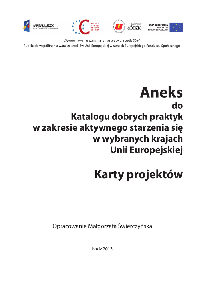 „Wyrównywanie szans na rynku pracy dla osób 50+” Publikacja współfinansowana ze środków Unii Europejskiej w ramach Europejskiego Funduszu Społecznego Aneks do Katalogu dobrych praktyk w zakresie aktywnego starzenia się w wybranych krajach Unii Europejskiej Karty projektów Opracowanie Małgorzata Świerczyńska Łódź 2013 1 Spis treści I grupa 4 „Skandynawska opieka” 4 DANIA5 Karta projektu DK 1 5 Karta projektu DK 2 7 Karta projektu DK 3 9 Karta projektu DK 4 12 SZWECJA15 Karta projektu SE 1 15 Karta projektu SE 2 18 Karta projektu SE 3 20 Karta projektu SE 4 22 II grupa24 „Zachodnioeuropejska rozmaitość”24 HOLANDIA25 Karta projektu NL 1 25 Karta projektu NL 2 27 Karta projektu NL 3 30 Karta projektu NL 4 32 WIELKA BRYTANIA 34 Karta projektu UK 1 34 Karta projektu UK 2 36 Karta projektu UK 3 38 Karta projektu UK 4 41 Karta projektu UK 5 43 III grupa45 „Śródziemnomorska droga”45 WŁOCHY46 Karta projektu IT 1 46 Karta projektu IT 2 48 Karta projektu IT 3 50 Karta projektu IT 4 52 Karta projektu IT 5 54 HISZPANIA57 Karta projektu ES 1 57 Karta projektu ES 2 60 2 Karta projektu ES 3 63 Karta projektu ES 4 66 Karta projektu ES 5 69 CYPR71 Karta projektu CY 1 71 Karta projektu CY 2 74 Karta projektu CY 3 78 Karta projektu CY 4 80 IV grupa83 „Środkowoeuropejska młoda demokracja”83 CZECHY84 Karta projektu CZ 1 84 Karta projektu CZ 2 87 Karta projektu CZ 3 89 Karta projektu CZ 4 91 Karta projektu CZ 5 93 BUŁGARIA95 Karta projektu BL 1 95 Karta projektu BL 2 97 Karta projektu BL 3 100 Karta projektu BL 4 102 RUMUNIA104 Karta projektu RU 1 104 Karta projektu RU 2 106 Karta projektu RU 3 109 Karta projektu RU 4 111 3 I grupa „Skandynawska opieka” 4 DANIA Karta projektu DK 1 Kraj Dania Tytuł projektu Kariera seniora – Aktywność osób starszych oraz doradztwo zawodowe przed emeryturą Senior Career – Active Ageing and Pre-Retirement Counselling Termin realizacji projektu 2010-2012 Ramy systemowe projektu Lifelong Learning Programme – Grundtvig Skala projektu – lokalny, regionalny, krajowy międzynarodowy Nazwa lidera Gmina Aarhus Aarhus Kommune Dane kontaktowe Adres Fredens Torv 6 8000 Århus C lidera tel. +45 86201777 e-mail [email protected] [email protected] WWW www.seniorforce.dk Status prawny lidera jednostka samorządu terytorialnego Dlaczego ten lider/konsorcjum? (posiadane zasoby) Szybko rozwijająca się gmina Aarhus zaczęła odczuwać skutki zmniejszającej się podaży siły roboczej na rynku duńskim. Wraz z lokalnym samorządem, poprzez aktywizację osób będących poza rynkiem pracy, chciała podtrzymać tempo swojego rozwoju. Inicjator projektu Gmina Aarhus Grupa docelowa Kto? (45+ czy dodatkowe kryteria) przeznaczony dla osób, które w niedalekiej przyszłości mają przejść na emeryturę. Liczba beneficjentów (50+ lub 45+) brak danych Uzasadnienie realizacji projektu Potrzeba rozwinięcia doradztwa dla osób przechodzących na emeryturę. Wartość projektu brak danych Kwota dofinansowania ze źródeł publicznych 15 000 € Źródło dofinansowania publicznego Lifelong Learning Programme – Grundtvig Opis projektu Cel ogólny Wymiana wiedzy na temat systemów emerytalnych w krajach partnerskich, a także spostrzeżeń i wyników badań dotyczących starszych pracowników odchodzących na emeryturę. Cele szczegółowe Wymiana wiedzy i doświadczeń w zakresie systemu doradztwa dla starszych pracowników zamierzających skorzystać z prawa do emerytury. Wymiana doświadczeń w zakresie sposobów poprawy i rozwoju poradnictwa dla starszych pracowników, z korzyścią dla pracowników w wieku 50+, przedsiębiorstw i społeczności. Rozwijanie współpracy nauki w celu rozpowszechniania najlepszych praktyk dla osób w wieku 50+ w zakresie doradztwa zawodowego. Promocja idei obowiązkowego przedemerytalnego doradztwa dla starszych pracowników w ramach UE. Działania Organizowanie cyklicznych spotkań w krajach partnerskimi, w których uczestnikami byli managerowie, szefowie firm oraz pracownicy z Aarhus (październik 2010), Mediolanu (luty 2011), Heraklion-Crete (czerwiec 2011), Warszawy (październik 2011), Berlina (2012). Stworzenie raportu: „Poradnictwo przedemerytalne – skrót do aktywności osób starszych” i zaprezentowanie jego wyników na konferencji w Berlinie w maju 2012. 5 Rezultaty „twarde” 38 osób postanowiło pracować dłużej. 44 osoby zadeklarowały chęć działania w charakterze wolontariuszy. 45 osób zadeklarowało chęć zmiany nawyków żywieniowych. „miękkie” Zwiększenie zainteresowania aktywnością zawodową. krótkookresowe Zwiększenie zainteresowania aktywizacją zawodową. długookresowe Wymiana wiedzy i doświadczeń w zakresie doradztwa dla starszych pracowników zamierzających skorzystać z prawa do emerytury. Wsparcie ze strony publicznej – inne niż wymienione wcześniej finansowe nie dotyczy Mocne strony projektu Wymiana wiedzy i doświadczeń na poziomie ponadnarodowym. Słabe strony projektu brak danych Bariery instytucjonalne projektu brak Stopień przenaszalności wysoki Koszt W jednostkach naturalnych (na osobę) Ocena słowna Skuteczność Przenaszalność niski (15 000 € dofinansowania łącznie) bardzo wysoka wysoka 5 5 4 brak danych Liczba punktów Łączna liczba punktów 14 6 Karta projektu DK 2 Kraj Dania Tytuł projektu Szpitalu w Aalborg – zarządzanie wiekiem Livsfasepolitik Aalborg Hospital – Age Management Termin realizacji projektu od 2006 r. Ramy systemowe projektu polityka wewnętrzna firmy Skala projektu – lokalny, regionalny, krajowy wewnątrz firmy Nazwa lidera Szpital w Aalborg Aalborg Hospital Dane kontaktowe Adres Hobrovej 18-22 Postboks 365, 9100 Aalborg lidera tel. +45 99321111 e-mail [email protected] WWW www.aalborgsygehus.rn.dk/Fakta+og+tal/English/ Status prawny lidera przedsiębiorstwo publiczne Dlaczego ten lider/konsorcjum? (posiadane zasoby) Szpital znajduje się w północnej części Jutlandii. Jest placówką opieki zdrowotnej