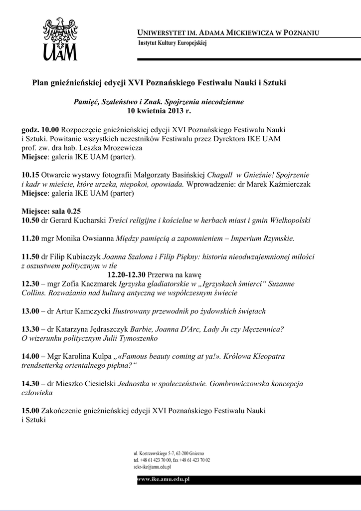 Instytut Kultury Europejskiej Plan gnieźnieńskiej edycji XVI Poznańskiego Festiwalu Nauki i Sztuki Pamięć, Szaleństwo i Znak. Spojrzenia niecodzienne 10 kwietnia 2013 r. godz. 10.00 Rozpoczęcie gnieźnieńskiej edycji XVI Poznańskiego Festiwalu Nauki i Sztuki. Powitanie wszystkich uczestników Festiwalu przez Dyrektora IKE UAM prof. zw. dra hab. Leszka Mrozewicza Miejsce: galeria IKE UAM (parter). 10.15 Otwarcie wystawy fotografii Małgorzaty Basińskiej Chagall w Gnieźnie! Spojrzenie i kadr w mieście, które urzeka, niepokoi, opowiada. Wprowadzenie: dr Marek Kaźmierczak Miejsce: galeria IKE UAM (parter) Miejsce: sala 0.25 10.50 dr Gerard Kucharski Treści religijne i kościelne w herbach miast i gmin Wielkopolski 11.20 mgr Monika Owsianna Między pamięcią a zapomnieniem – Imperium Rzymskie. 11.50 dr Filip Kubiaczyk Joanna Szalona i Filip Piękny: historia nieodwzajemnionej miłości z oszustwem politycznym w tle 12.20-12.30 Przerwa na kawę 12.30 – mgr Zofia Kaczmarek Igrzyska gladiatorskie w „Igrzyskach śmierci“ Suzanne Collins. Rozważania nad kulturą antyczną we współczesnym świecie 13.00 – dr Artur Kamczycki Ilustrowany przewodnik po żydowskich świętach 13.30 – dr Katarzyna Jędraszczyk Barbie, Joanna D'Arc, Lady Ju czy Męczennica? O wizerunku politycznym Julii Tymoszenko 14.00 – Mgr Karolina Kulpa „«Famous beauty coming at ya!». Królowa Kleopatra trendsetterką orientalnego piękna?“ 14.30 – dr Mieszko Ciesielski Jednostka w społeczeństwie. Gombrowiczowska koncepcja człowieka 15.00 Zakończenie gnieźnieńskiej edycji XVI Poznańskiego Festiwalu Nauki i Sztuki ul. Kostrzewskiego 5-7, 62-200 Gniezno tel. +48 61 423 70 00, fax +48 61 423 70 02 [email protected] www.ike.amu.edu.pl