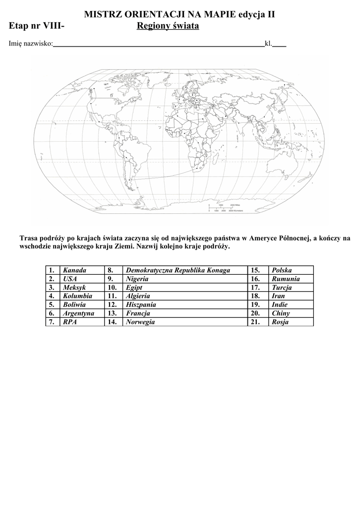 Etap nr VIII- MISTRZ ORIENTACJI NA MAPIE edycja II Regiony świata Imię nazwisko: kl. Trasa podróży po krajach świata zaczyna się od największego państwa w Ameryce Północnej, a kończy na wschodzie największego kraju Ziemi. Nazwij kolejno kraje podróży. 1. 2. 3. 4. 5. 6. 7. Kanada USA Meksyk Kolumbia Boliwia Argentyna RPA 8. 9. 10. 11. 12. 13. 14. Demokratyczna Republika Konaga Nigeria Egipt Algieria Hiszpania Francja Norwegia 15. 16. 17. 18. 19. 20. 21. Polska Rumunia Turcja Iran Indie Chiny Rosja
