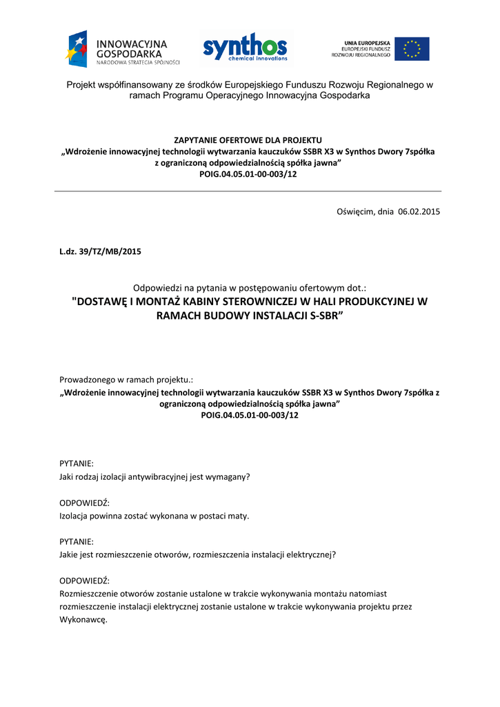 Projekt współfinansowany ze środków Europejskiego Funduszu Rozwoju Regionalnego w ramach Programu Operacyjnego Innowacyjna Gospodarka ZAPYTANIE OFERTOWE DLA PROJEKTU „Wdrożenie innowacyjnej technologii wytwarzania kauczuków SSBR X3 w Synthos Dwory 7spółka z ograniczoną odpowiedzialnością spółka jawna” POIG.04.05.01-00-003/12 Oświęcim, dnia 06.02.2015 L.dz. 39/TZ/MB/2015 Odpowiedzi na pytania w postępowaniu ofertowym dot.: "DOSTAWĘ I MONTAŻ KABINY STEROWNICZEJ W HALI PRODUKCYJNEJ W RAMACH BUDOWY INSTALACJI S-SBR” Prowadzonego w ramach projektu.: „Wdrożenie innowacyjnej technologii wytwarzania kauczuków SSBR X3 w Synthos Dwory 7spółka z ograniczoną odpowiedzialnością spółka jawna” POIG.04.05.01-00-003/12 PYTANIE: Jaki rodzaj izolacji antywibracyjnej jest wymagany? ODPOWIEDŹ: Izolacja powinna zostać wykonana w postaci maty. PYTANIE: Jakie jest rozmieszczenie otworów, rozmieszczenia instalacji elektrycznej? ODPOWIEDŹ: Rozmieszczenie otworów zostanie ustalone w trakcie wykonywania montażu natomiast rozmieszczenie instalacji elektrycznej zostanie ustalone w trakcie wykonywania projektu przez Wykonawcę. Projekt współfinansowany ze środków Europejskiego Funduszu Rozwoju Regionalnego w ramach Programu Operacyjnego Innowacyjna Gospodarka PYTANIE: Czy w kabinie będą montowane stoły sterownicze , czy tylko należy wycenić zakres podany w założenich pkt. 1 , 1.1-1.4 ODPOWIEDŹ: Montaż stołów znajduje się poza zakresem zapytania ofertowego. PYTANIE: Proszę o podanie sposobu ułożenia kabli elektrycznych w kabinie sterowniczej. ODPOWIEDŹ: W kabinie sterowniczej kable powinny być układane w korytkach PCV.
