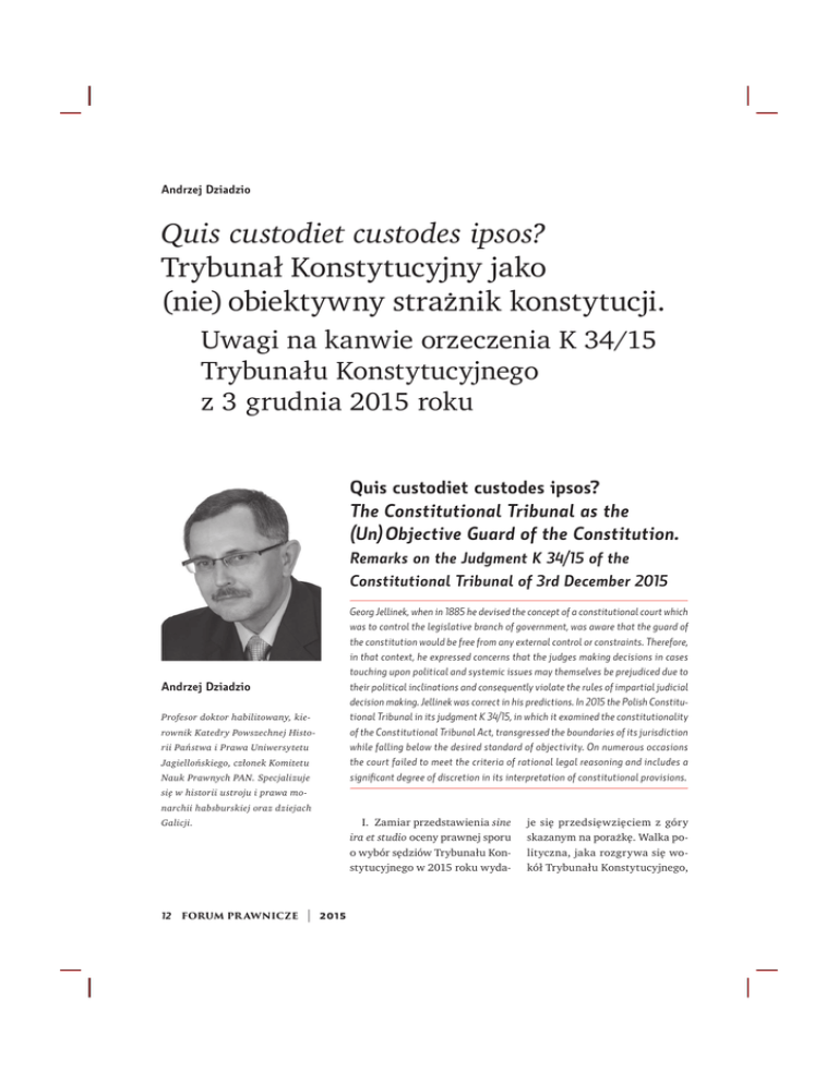Andrzej Dziadzio 4XLVFXVWRGLHWFXVWRGHVLSVRV" 7U\EXQDã.RQVW\WXF\MQ\MDNR QLHRELHNW\ZQ\VWUDˬQLNNRQVW\WXFML 8ZDJLQDNDQZLHRU]HF]HQLD. 7U\EXQDãX.RQVW\WXF\MQHJR ]JUXGQLDURNX Quis custodiet custodes ipsos? The Constitutional Tribunal as the (Un) Objective Guard of the Constitution. Remarks on the Judgment K 34/15 of the Constitutional Tribunal of 3rd December 2015 Andrzej Dziadzio Profesor doktor habilitowany, kierownik Katedry Powszechnej HistoULL3DˀVWZDL3UDZD8QLZHUV\WHWX -DJLHOORˀVNLHJRF]ãRQHN.RPLWHWX 1DXN3UDZQ\FK3$16SHFMDOL]XMH Georg Jellinek, when in 1885 he devised the concept of a constitutional court which was to control the legislative branch of government, was aware that the guard of the constitution would be free from any external control or constraints. Therefore, in that context, he expressed concerns that the judges making decisions in cases touching upon political and systemic issues may themselves be prejudiced due to their political inclinations and consequently violate the rules of impartial judicial decision making. Jellinek was correct in his predictions. In 2015 the Polish Constitutional Tribunal in its judgment K 34/15, in which it examined the constitutionality of the Constitutional Tribunal Act, transgressed the boundaries of its jurisdiction while falling below the desired standard of objectivity. On numerous occasions the court failed to meet the criteria of rational legal reasoning and includes a significant degree of discretion in its interpretation of constitutional provisions. VLʧZKLVWRULLXVWURMXLSUDZDPR- QDUFKLLKDEVEXUVNLHMRUD]G]LHMDFK Galicji. 12 FORUM PR AWNICZE | 2015 , =DPLDUSU]HGVWDZLHQLDsine LUDHWVWXGLRoceny prawnej sporu RZ\EyUVʧG]LyZ7U\EXQDãX.RQVW\WXF\MQHJRZURNXZ\GD- MHVLʧSU]HGVLʧZ]LʧFLHP]JyU\ VND]DQ\PQDSRUDˬNʧ:DONDSROLW\F]QDMDNDUR]JU\ZDVLʧZRNyã7U\EXQDãX.RQVW\WXF\MQHJR artykuły QLHXãDWZLDU]HF]RZHMG\VNXVML. .DˬG\Z\SRZLDGDMʙF\RSLQLʧZWHMVSUDZLHVWDMHVLʧ nolens volens uczestQLNLHPSROLW\F]QHJRVSRUXFRQLHMDNR]]DãRˬHQLD EXG]LSRGHMU]OLZR˒þZREHFSUH]HQWRZDQHJRSU]H]HˀZ\ZRGXSUDZQLF]HJR1LH]DOHˬQLHMHGQDNRG VLOQHJRXSROLW\F]QLHQLDG\VNXUVX²QDXNDSUDZDQLH PRˬHXQLNDþU]HF]RZHMDQDOL]\RU]HF]HQLD7U\EXQDãX.RQVW\WXF\MQHJRRFHQLDMʙFHJR]JRGQR˒þ].RQVW\WXFMʙ53SU]HSLVyZGRW\F]ʙF\FKZ\ERUXVʧG]LyZ NWyUHZSURZDG]LãDXVWDZDR7U\EXQDOH.RQVW\WXF\MQ\P]F]HUZFDURNX1GDOHMXVWDZDR7. =DVDGQHVWDMHVLʧ]ZãDV]F]DS\WDQLHF]\7U\EXQDã .RQVW\WXF\MQ\Z\SHãQLãQDOHˬ\FLHUROʧEH]VWURQQHJR LRELHNW\ZQHJRVWUDˬQLNDNRQVW\WXFML&]\VHQWHQFMD LX]DVDGQLHQLHZ\URNXQLHSR]RVWDZLDMʙFLHQLDZʙWSOLZR˒FLFRGRUDFMRQDOQR˒FLSUDZQLF]HJRZQLRVNRZDQLDSU]HSURZDG]RQHJRSU]H]VʧG]LyZ7U\EXQDãX .RQVW\WXF\MQHJR"'RSRVWDZLHQLDS\WDQLDRWRF]\ VʧG]LRZLH7U\EXQDãX.RQVW\WXF\MQHJR]DFKRZDOL EH]VWURQQR˒þZZ\SHãQLHQLXIXQNFMLRU]HF]QLF]HM VNãDQLDSRSLHUZV]HIDNWˬHSURMHNWXVWDZ\R7U\EXQDOH]RVWDãZFDãR˒FLSU]\JRWRZDQ\SU]H]MHJR XU]ʧGXMʙF\FKVʧG]LyZ2SRGUXJLH²RNROLF]QR˒þˬH ZZ\GDQLXZ\URNXXF]HVWQLF]\OLZ\ãʙF]QLHVʧG]LR 8VWDZD]GQLDF]HUZFDUR7U\EXQDOH.RQVW\WXF\MQ\P']8]USR] =RE''XGHN7U\EXQDã.RQVW\WXF\MQ\²QRZDUHJXODFMDVWDUH SUREOHP\Z30LNXOL$.XOLJ-.DUS*.XFDUHGUstroMH7UDG\FMDLSRUyZQDQLD.VLʧJDMXELOHXV]RZDGHG\NRZDQD SURIGUKDE0DULDQRZL*U]\ERZVNLHPXZVLHGHPG]LHVLʙWʙ URF]QLFʧXURG]LQ:DUV]DZDVLQ$XWRUSXEOLNDFML VWZLHUG]LãˬHÅIDNW\F]QLHSRUyZQDQLHREXWHNVWyZSU]HVãDQHJRSU]H]7U\EXQDã3UH]\GHQWRZLRUD]ZQLHVLRQHJRSU]H] 3UH]\GHQWDGR6HMPXZW\PX]DVDGQLHˀXND]XMHLFK]ELHˬQR˒þEOLVNʙLGHQW\F]QR˒FL)DNWWHQZ\ZRãDã]UyˬQLFRZDQH UHDNFMHRGSU]\]QDQLDFHORZR˒FLZQLNOLZHJRUR]ZDˬDQLD ZWRNXSUDFOHJLVODF\MQ\FKRSLQLLLSRVWXODWyZIRUPXãRZDQ\FKSU]H]VʧG]LyZ7U\EXQDãXSRSU]H]NU\W\F]QʙRFHQʧ SUDNW\NLXVWDODQLDSU]H]QLFKEU]PLHQLDSURMHNWRZDQHJR DNWXQRUPDW\ZQHJRF]\FKRþE\SRV]F]HJyOQ\FKMHGQRVWHN UHGDNF\MQ\FKSR]GHF\GRZDQʙGH]DSUREDWʧPHU\WRU\F]Qʙ ZLHZFKRG]ʙF\ZVNãDG7U\EXQDãX]UHNRPHQGDFML SDUWLLSROLW\F]Q\FKNWyUH]DGHF\GRZDã\RXFKZDOHQLX]DVNDUˬRQHMXVWDZ\ %H]VWURQQR˒þZZ\NRQ\ZDQLXSU]H]7U\EXQDã .RQVW\WXF\MQ\IXQNFMLVWUDˬQLNDNRQVW\WXFMLPXVL SR]RVWDZDþSR]DZV]HONLPLSRGHMU]HQLDPL-HGQ\P ]SRGVWDZRZ\FKLNRQLHF]Q\FKZDUXQNyZWHMEH]VWURQQR˒FLMHVWSOXUDOLVW\F]Q\SRGZ]JOʧGHPSROLW\F]Q\PL˒ZLDWRSRJOʙGRZ\PVNãDGRVRERZ\7U\EXQDãX7DNLHMZãD˒QLHLGHLGDMHZ\UD]DUWXVW .RQVW\WXFML53NWyU\MHVWV]HUV]\PUHÁHNVHPNOXF]RZHMGODSROVNLHMNRQVW\WXFML]DVDG\GHPRNUDFML OLEHUDOQHMLSDUODPHQWDUQHM:]JOʙG]DWHPQD]DVDGʧ SOXUDOL]PXSU]\REVDG]DQLXVWDQRZLVNDVʧG]LHJR7. OHJãX˪UyGHãSRQLˬV]\FKXZDJNWyU\FKFHOHPMHVW GRNRQDQLHNU\W\F]QHJRUR]ELRUXZ\URNX7.]GQLD JUXGQLDURNX3. 'ODQLNRJR]REVHUZDWRUyZVFHQ\SROLW\F]QHMQLH XOHJDZʙWSOLZR˒FLˬHSU]HSLV\XVWDZ\R7U\EXQDOH .RQVW\WXF\MQ\P]F]HUZFDSR]ZDODMʙFHQDZ\EyUSLʧFLXVʧG]LyZ7.ZURNXSU]H]yZF]HVQʙ ZLʧNV]R˒þSDUODPHQWDUQʙPLDã\QDFHOX]GRPLQRZDQLHSU]H]QLʙVNãDGXRVRERZHJRWHMLQVW\WXFMLQLHPDOZVWXSURFHQWDFK²JG\E\WRVLʧVWDãRZVNãDG]LH 7U\EXQDãXSR]RVWDãDE\W\ONRMHGQDRVREDQLHZ\EUDQDSU]H]WʧZLʧNV]R˒þ:SURZDG]RQ\GRXVWDZ\ QRZ\WHUPLQ]JãDV]DQLDNDQG\GDWyZQDVʧG]LHJR7. XPRˬOLZLãXVWʧSXMʙFHMHNLSLHVHMPRZHMZ\EyUWU]HFK VʧG]LyZQDPLHMVFHW\FKNWyU\FKNDGHQFMDZ\JDVDãD OLVWRSDGDURNX²ZWHQVSRVyEQDZ\EyUQLHMDNR]DUH]HUZRZDQRVRELHGQL:SU]HFLZQ\P Z\SDGNXXVWʧSXMʙFDNRDOLFMDU]ʙGRZDPRJãDE\QLH ]Gʙˬ\þ]GRNRQDQLHPZ\ERUXPDMʙFQDWR]DOHGZLH GZDGQL]JRGQLH]UHJXODPLQHP6HMPXWU]\G]LHVWRGQLRZ\WHUPLQ²VSU]HGXFKZDOHQLDXVWDZ\²GR ]JãRV]HQLDNDQG\GDWyZXSã\QʙãE\SD˪G]LHUQLND DRVWDWQLHSRVLHG]HQLH6HMPXXSã\ZDMʙFHMNDGHQFML SU]HZLG]LDQRQD²SD˪G]LHUQLND$QW\NRQVW\WXF\MQHG]LDãDQLDSRSU]HGQLHMNRDOLFMLU]ʙGRZHM² SRWZLHUG]RQHZZ\URNX7.]GQLDJUXGQLD roku²E\ã\QLHMDNRZLGRF]QHJRã\PRNLHPGODNDˬ- LSROLW\F]Qʙµ1LH]Z\NOHDNW\ZQH]DDQJDˬRZDQLHVLʧSUH]HVD LZLFHSUH]HVD7U\EXQDãX.RQVW\WXF\MQHJRF]\OLMHJR˒FLVãHJR NLHURZQLFWZDZSUDFHQDGXVWDZʙNWyUHMNRQVW\WXF\MQR˒þ PLDãRFHQLDþVDP7U\EXQDãU]XWXMHWDNˬHQDNZHVWLʧRELHNW\ZQR˒FLSR]RVWDã\FKMHJRVʧG]LyZ :\URN7U\EXQDãX.RQVW\WXF\MQHJR]GQLDJUXGQLDU V\JQDNW.']8]USR] : Z\URNX . 7U\EXQDã .RQVW\WXF\MQ\ Z\UD˪QLH VWZLHUG]LãˬHPHFKDQL]PZ\ERUXVʧG]LyZZSURZDG]RQ\ 2015 | FORUM PR AWNICZE 13 artykuły GHJRNWRZLFKRFHQLHQLHNLHURZDãVLʧZ]JOʧGDPL SROLW\F]Q\PL=]DVDG\GHPRNUDW\F]QHJRSDˀVW