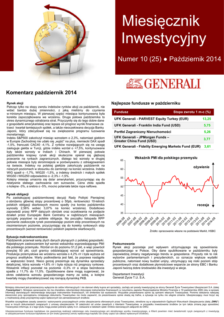Miesięcznik Inwestycyjny Numer 10 (25) ● Październik 2014 Komentarz październik 2014 Rynek obligacji Po zaskakującej październikowej decyzji Rady Polityki Pieniężnej o obniżeniu głównej stopy procentowej o 50pb, rentowności 10-letnich polskich obligacji skarbowych mocno spadły (na koniec października wynosiły 2,56% wobec 3,07% na koniec września). Dodatkowo zapowiedź przez RPP dalszych obniżek oraz oczekiwania na podjęcie działań przez Europejski Bank Centralny w najbliższych miesiącach sprzyjały popytowi na polskie obligacje. Na początku listopada RPP ponownie zaskoczyła rynek pozostawiając poziom stóp procentowych na niezmienionym poziomie, przyczyniając się do korekty rynkowych stóp procentowych (wzrost rentowności polskich papierów skarbowych). Sytuacja makroekonomiczna Październik przerwał serię złych danych płynących z polskiej gospodarki. Największym zaskoczeniem był wzrost wskaźnika wyprzedzającego PMI dla polskiego przemysłu. Wzrósł on do poziomu 51,2 pkt, a więc powrócił powyżej 50 pkt, czyli granicy oddzielającej wzrost od spowolniania. Produkcja przemysłowa we wrześniu wzrosła o 4,2% r/r i była wyższa od prognoz analityków. Warty podkreślenia jest fakt, że poprawa nastąpiła w większości branż. Nieco gorzej prezentuje się dynamika sprzedaży detalicznej, która wzrosła +1,6% r/r i była niższa niż prognozy rynkowe. Wskaźnik inflacji pozostał na poziomie -0,3% r/r a stopa bezrobocia spadła z 11,7% do 11,5%. Opublikowane dane mogą sugerować, że okres osłabienia wzrostu gospodarczego mamy za sobą, a kolejne kwartały mogą charakteryzować się rosnącą dynamiką PKB. Najlepsze fundusze w październiku Fundusz Stopa zwrotu 1 m-c (%) UFK Generali - PARVEST Equity Turkey (EUR) 13,25 UFK Generali - Franklin India Fund (USD) 5,75 Portfel Zagraniczny Nieruchomości 5,26 UFK Generali - JPMorgan Funds – Greater China Fund (USD) 3,77 UFK Generali - Fidelity Emerging Markets Fund (EUR) 3,61 65 Wskaźnik PMI dla polskiego przemysłu 60 ożywienie 55 50 45 40 recesja 35 20 06 20 -08 07 20 -02 07 20 -08 08 20 -02 08 20 -08 09 20 -02 09 20 -08 10 20 -02 10 20 -08 11 20 -02 11 20 -08 12 20 -02 12 20 -08 13 20 -02 13 20 -08 14 20 -02 14 -0 8 Rynek akcji Patrząc tylko na stopy zwrotu indeksów rynków akcji za październik, nie widać bardzo dużej zmienności, z jaką mieliśmy do czynienia w minionym miesiącu. W pierwszej części miesiąca kontynuowana była korekta zapoczątkowana we wrześniu. Druga połowa października to okres dynamicznego odrabiania strat. Przyczyniły się do tego dobre dane z gospodarki amerykańskiej oraz lepsze od prognoz wyniki finansowe za trzeci kwartał tamtejszych spółek, a także nieoczekiwana decyzja Banku Japonii, który zdecydował się na zwiększenie programu luzowania monetarnego. Indeks S&P500 zakończył miesiąc wzrostem o 2,3%, natomiast giełdom w Europie Zachodniej nie udało się „wyjść” na plus, niemiecki DAX spadł -1,5%, francuski CAC40 -4,1%. Z rynków rozwijających się na uwagę zasługuje giełda w Turcji, gdzie indeks wzrósł o +7,5%, kontynuowane były także wzrosty w Indiach i Chinach. W pierwszej połowie października krajowy rynek akcji skutecznie opierał się głębszej przecenie na rynkach zagranicznych, dlatego też wzrosty w drugiej połowie miesiąca były skromniejsze w porównywaniu z odreagowaniem na świecie. Indeksy na polskiej giełdzie zakończyły październik na niższych poziomach w stosunku do zamknięć na koniec września. Indeks WIG spadł o -1,7%, WIG20 -1,5%, a indeksy średnich i małych spółek WIG50 i WIG250 odpowiednio o -2,3% i -1,5%. Kolejny miesiąc umacnia się dolar amerykański, przyczyniając się do relatywnie słabego zachowania cen surowców. Cena złota spadła o kolejne -3%, a srebra o -5%, mocno potaniała także ropa naftowa. Źródło: opracowanie własne na podstawie Markit, HSBC Podsumowanie Rynek akcji pozostaje pod wpływem utrzymującego się spowolniania gospodarczego w Polsce. Oby dane opublikowane w październiku były zapowiedzią zmiany negatywnego trendu w gospodarce. Przyszły rok to rok wyborów parlamentarnych i prezydenckich, co oznacza większe wydatki publiczne, natomiast nowy budżet unijny, utrzymujący się niski poziom stóp procentowych oraz dodatkowe płynnościowe wsparcie ze strony EBC i Banku Japonii tworzą dobre środowisko dla inwestycji w akcje. Departament Inwestycji Generali Życie T.U. S.A. Niniejszy dokument jest przeznaczony wyłącznie do celów informacyjnych i nie stanowi oferty kupna ani sprzedaży, zachęty ani porady inwestycyjnej ze strony Generali Życie Towarzystwo Ubezpieczeń S.A. (dalej „Towarzystwo”). Niniejsze opracowanie nie ma charakteru rekomendacji dotyczącej instrumentów finansowych w rozumieniu zapisów Rozporządzenia Ministra Finansów z 19 października 2005 roku w sprawie informacji stanowiących rekomendacje dotyczące instrumentów finansowych, ich emitentów lub wystawców. Wszystkie prezentowane opinie są opiniami własnymi Towarzystwa. Pomimo dołożenia należytej staranności przy sporządzaniu niniejszego dokumentu Towarzystwo nie może zapewnić, że prezentowane opinie okażą się trafne, a sytuacja na rynku nie ulegnie zmianie. Ubezpieczający musi liczyć się z możliwością utraty przynajmniej części wpłaconych lub zainwestowanych środków. Wszelkie szczegółowe zasady zawarcia i wykonywania poszczególnych umów ubezpieczenia oferowanych przez Towarzystwo, określone są w odpowiednich Ogólnych Warunkach Ubezpieczenia (dalej „OWU”) oraz w innych dokumentach związanych z umową ubezpieczenia. W zależności od umów zawartych z klientami Towarzystwa, w przypadku inwestowania środków (w tym także zmianą jego sposobów) Towarzystwo informuje, iż z tego tytułu mogą zostać pobrane opłaty m.in. wskazane w tabelach opłat i limitów stanowiących załącznik do OWU. Ubezpieczeniowe fundusze kapitałowe nie g