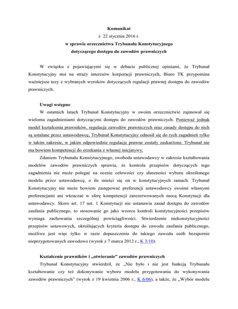Komunikat z 22 stycznia 2016 r. w sprawie orzecznictwa Trybunału Konstytucyjnego dotyczącego dostępu do zawodów prawniczych W związku z pojawiającymi się w debacie publicznej opiniami, że Trybunał Konstytucyjny stoi na straży interesów korporacji prawniczych, Biuro TK przypomina ważniejsze tezy z wybranych wyroków dotyczących regulacji prawnej dostępu do zawodów prawniczych. Uwagi wstępne W ostatnich latach Trybunał Konstytucyjny w swoim orzecznictwie zajmował się wieloma zagadnieniami dotyczącymi dostępu do zawodów prawniczych. Ponieważ jednak model kształcenia prawników, regulacja zawodów prawniczych oraz zasady dostępu do nich są ustalane przez ustawodawcę, Trybunał Konstytucyjny odnosił się do tych zagadnień tylko w takim zakresie, w jakim odpowiednie regulacje prawne zostały zaskarżone. Trybunał nie ma bowiem kompetencji do orzekania z własnej inicjatywy. Zdaniem Trybunału Konstytucyjnego, swoboda ustawodawcy w zakresie kształtowania modelów zawodów prawniczych sprawia, że kontrola przepisów dotyczących tego zagadnienia nie może polegać na ocenie celowości czy słuszności wyboru określonego modelu przez ustawodawcę, o ile mieści się on w konstytucyjnych ramach. Trybunał Konstytucyjny nie może bowiem zastępować preferencji ustawodawcy swoimi własnymi preferencjami ani wkraczać w sferę kompetencji zarezerwowanych mocą Konstytucji dla ustawodawcy. Skoro art. 17 ust. 1 Konstytucji nie ustanawia zasad dostępu do zawodów zaufania publicznego, to stosowanie go jako wzorca kontroli konstytucyjności przepisów wymaga zachowania szczególnej powściągliwości. Stwierdzenie niekonstytucyjności przepisów ustawowych, określających kryteria dostępu do zawodu zaufania publicznego, możliwe jest więc tylko w razie dopuszczenia do takiego zawodu osób bezspornie nieprzygotowanych zawodowo (wyrok z 7 marca 2012 r., K 3/10). Kształcenie prawników i „otwieranie” zawodów prawniczych Trybunał Konstytucyjny stwierdził, że „Nie było i nie jest funkcją Trybunału kształtowanie czy też dokonywanie wyboru modelu przygotowania do wykonywania zawodów prawniczych” (wyrok z 19 kwietnia 2006 r., K 6/06), a także, że „Wybór modelu 2 naboru do zawodów prawniczych należy do ustawodawcy. Konstytucja nie przesądza (…) trybu kształcenia teoretycznego oraz przygotowania praktycznego do wykonywania reglamentowanych zawodów prawniczych” (K 3/10). Trybunał Konstytucyjny wprost wyrażał aprobatę dla otwierania zawodów prawniczych, zaznaczał jednak, że musi ono odpowiadać wymaganiom poprawnej legislacji. Stwierdził m.in., że otwarcie zawodów prawniczych i zwiększenie dostępności (finansowej i terytorialnej, także dla mniej zamożnej części społeczeństwa) usług prawniczych, jest pożądane, ale musi następować drogą całościowych, wewnętrznie spójnych rozwiązań, które przejrzyście „ukształtują model prawniczego kształcenia zawodowego oraz zasady przepływu pomiędzy wysoko kwalifikowanymi zawodami prawniczymi” (K 6/06). Dlatego, dostrzegając racje przemawiające za otwarciem zawodów prawniczych dla jak najszerszej grupy osób o wysokich kwalifikacjach, wziął pod uwagę fakt, że niekonsekwentna i niespójna działalność ustawodawcy pośrednio szkodzi realizacji założonego celu. Chaos regulacyjny i „zdeformowana” ratio legis w rzeczywistości odsuwały bowiem w czasie możliwość osiągnięcia pożądanego celu (wyrok z 8 listopada 2006 r., K 30/06). Cel sprawowania pieczy przez samorządy zawodów prawniczych nad należytym wykonywaniem tych zawodów Trybunał Konstytucyjny podkreślił, że powierzenie samorządom zawodowym sprawowania pieczy nad należytym wykonywaniem zawodu zależy od decyzji ustawodawcy. Trybunał Konstytucyjny nie decyduje o rodzajach, zasięgu i zasadach wykonywania prawniczych zawodów zaufania publicznego jako zawodów reglamentowanych i takie regulacje − w zakresie, w jakim nie kolidują z Konstytucją − musi w pełni respektować. Z woli ustawodawcy: − utrzymana została wielość reglamentowanych zawodów prawniczych świadczących w zróżnicowanym zakresie kwalifikowane usługi prawnicze, − nie został wprowadzony (spotykany w innych państwach) jednolity system państwowego przygotowania do wykonywania zawodów prawniczych, − kształcenie odbywa się w trybie różnych aplikacji i zostało powierzone poszczególnym samorządom prawniczym, których organy mają prawo określać zasady odbywania odrębnych, aplikacji (K 6/06). Trybunał Konstytucyjny, w kontekście otwierania zawodów prawniczych, konsekwentnie przypominał konstytucyjny cel sprawowania przez samorządy zawodowe pieczy nad należytym wykonywaniem zawodów prawniczych (wyrok z 18 lutego 2004 r., 3 P 21/02). Zaznaczył m.in., że art. 17 ust. 1 Konstytucji – formułując wymóg działania „w granicach interesu publicznego i dla jego ochrony” – nakazuje priorytetowo traktować interes publiczny w ramach sprawowanej przez samorząd zawodowy pieczy. Podkreślił, że interes publiczny nie może być utożsamiany z interesem korporacji zawodowej czy też jej członków, i należy mu przyznać pierwszeństwo (K 6/06). Przypominał też, że nadanie niektórym zawodom charakteru zawodów zaufania publicznego oznacza, iż dopuszczalne są ograniczenia konstytucyjnej wolności dostępu do nich i ich wykonywania. Ograniczenia takie mają jednak służyć interesowi publicznemu (ich zakres powinien być odpowiedni do ochrony tego interesu) i nie mogą mieć na celu stworzenia przywilejów określonej grupie zawodowej (wyrok z 12 lutego 2013 r., K 6/12). Zakres kompetencji samorządów zawodów prawniczych do określania zasad naboru na aplikacje prawnicze Oceniając kompetencje samorządów zawodów prawniczych do określania zasad naboru na aplikacje, Trybunał Konstytucyjny stwierdził, że samo ustawowe powierzenie samorządowi adwokatów czy radców prawnych prowadzenia 