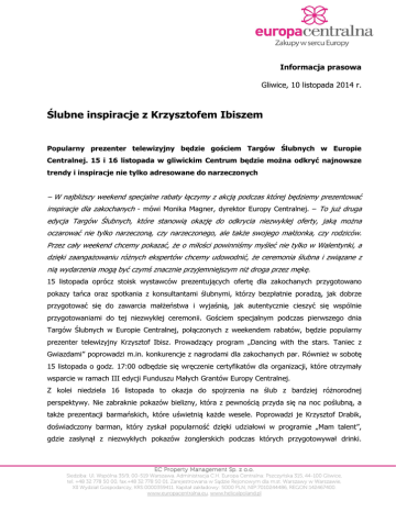 Informacja prasowa Gliwice, 10 listopada 2014 r. Ślubne inspiracje z Krzysztofem Ibiszem Popularny prezenter telewizyjny będzie gościem Targów Ślubnych w Europie Centralnej. 15 i 16 listopada w gliwickim Centrum będzie można odkryć najnowsze trendy i inspiracje nie tylko adresowane do narzeczonych – W najbliższy weekend specjalne rabaty łączymy z akcją podczas której będziemy prezentować inspiracje dla zakochanych - mówi Monika Magner, dyrektor Europy Centralnej. – To już druga edycja Targów Ślubnych, które stanowią okazję do odkrycia niezwykłej oferty, jaką można oczarować nie tylko narzeczoną, czy narzeczonego, ale także swojego małżonka, czy rodziców. Przez cały weekend chcemy pokazać, że o miłości powinniśmy myśleć nie tylko w Walentynki, a dzięki zaangażowaniu różnych ekspertów chcemy udowodnić, że ceremonia ślubna i związane z nią wydarzenia mogą być czymś znacznie przyjemniejszym niż droga przez mękę. 15 listopada oprócz stoisk wystawców prezentujących ofertę dla zakochanych przygotowano pokazy tańca oraz spotkania z konsultantami ślubnymi, którzy bezpłatnie poradzą, jak dobrze przygotować się do zawarcia małżeństwa i wyjaśnią, jak autentycznie cieszyć się wspólnie przygotowaniami do tej niezwykłej ceremonii. Gościem specjalnym podczas pierwszego dnia Targów Ślubnych w Europie Centralnej, połączonych z weekendem rabatów, będzie popularny prezenter telewizyjny Krzysztof Ibisz. Prowadzący program „Dancing with the stars. Taniec z Gwiazdami” poprowadzi m.in. konkurencje z nagrodami dla zakochanych par. Również w sobotę 15 listopada o godz. 17:00 odbędzie się wręczenie certyfikatów dla organizacji, które otrzymały wsparcie w ramach III edycji Funduszu Małych Grantów Europy Centralnej. Z kolei niedziela 16 listopada to okazja do spojrzenia na ślub z bardziej różnorodnej perspektywy. Nie zabraknie pokazów bielizny, która z pewnością przyda się na noc poślubną, a także prezentacji barmańskich, które uświetnią każde wesele. Poprowadzi je Krzysztof Drabik, doświadczony barman, który zyskał popularność dzięki udziałowi w programie „Mam talent”, gdzie zasłynął z niezwykłych pokazów żonglerskich podczas których przygotowywał drinki. EC Property Management Sp. z o.o. Siedziba: Ul. Wspólna 35/9, 00-519 Warszawa. Administracja C.H. Europa Centralna: Pszczyńska 315, 44-100 Gliwice, tel. +48 32 778 50 00, fax.+48 32 778 50 01. Zarejestrowana w Sądzie Rejonowym dla m.st. Warszawy w Warszawie, XII Wydział Gospodarczy, KRS:0000359411. Kapitał zakładowy: 5000 PLN, NIP:7010244486, REGON:142467400. www.europacentralna.eu, www.helicalpoland.pl Prezentacja stoisk adresowanych do zakochanych odbywają się w sobotę w godz. 9:00-21:00, a w niedzielę 10:00-20:00. Podczas targów czekają także atrakcje dla najmłodszych gości. Specjalna dyskoteka, gdzie dzieci mogą bezpiecznie bawić się pod opieką animatorów startuje w najbliższą sobotę i niedzielę o godz. 17:00 na piętrze restauracyjnym. Wstęp na mini disco, odbywające się na piętrze restauracyjnym, jest bezpłatny. --Centrum Handlowe Europa Centralna o powierzchni 67 tys. metrów kwadratowych jest jednym z największych tego typu obiektów komercyjnych w Polsce. Unikalny koncept galerii, oferuje klientom możliwość zrobienia wszystkich niezbędnych zakupów od artykułów spożywczych, przez materiały do budowy domu, po ubrania z najnowszych kolekcji. Położenie obiektu, przy jednym z największych węzłów autostradowych w Polsce (Gliwice-Sośnica), gdzie łączą się autostrady A1 i A4 i droga krajowa nr 44 oraz na obszarze gęsto zaludnionego Górnośląskiego Okręgu Przemysłowego, sprawia, że niemal 5 mln osób może w ciągu godziny dojechać tu na zakupy. Na miejscu skorzystać można z wypożyczalni parasoli, pomieszczeń dla rodziców z dziećmi, 600 miejsc siedzących dla klientów piętra restauracyjnego, paczkomatu, bezpłatnego wi-fi dostępnego na terenie całego Centrum oraz wielu bankomatów i punktów usługowych. Klienci mogą zostawić swój samochód na dużym, liczącym 2,3 tys. miejsc parkingu, a niezmotoryzowani dojadą na zakupy bezpłatnymi liniami autobusowymi. Wśród najemców są takie firmy jak: Saturn, Castorama, Tesco Extra, Jula, Ski Team, Sports Direct, Jysk, SMYK Megastore, RTV Euro AGD, New Yorker, Reserved, H&M, Cubus, Lindex, CCC, Bershka, Solar, Monnari, Clooud, Apart, TUI, Home and You, Super Pharm, Neckermann, Deichmann, City Sport, Mohito, Promod, Cortland Apple Premium Reseller, Stradivarius, Rossmann, TAKKO Fashion, Douglas, Alpenpark, ING Bank Śląski, Lilo, Henry Moore, Motherline, Bialcon, Dobrodzień i Kalwaria, AMT Studio, New York Hot Dogs, Esotiq, Nuna Lie, Restauracja Chińska, a dla najmłodszych - Kinderplaneta. Kontakt dla dziennikarzy: www.europacentralna.eu Helical Poland Sp. z o.o. ul. Wspólna 35/9 00-519 Warszawa Więcej informacji: Marta Chodkowska tel. 601 244 127 [email protected] Marketing Director C. H. Europa Centralna Katarzyna Lenartowicz tel. 501 699 261 Mind Progress Group Leasing: Marta Gołębiowska tel. 663 918 160 [email protected] Adam Piwek tel. 515 108 476 [email protected] Cook Communications Tomasz Rożek tel. 663 171 033 [email protected] [email protected] EC Property Management Sp. z o.o. Siedziba: Ul. Wspólna 35/9, 00-519 Warszawa. Administracja C.H. Europa Centralna: Pszczyńska 315, 44-100 Gliwice, tel. +48 32 778 50 00, fax.+48 32 778 50 01. Zarejestrowana w Sądzie Rejonowym dla m.st. Warszawy w Warszawie, XII Wydział Gospodarczy, KRS:0000359411. Kapitał zakładowy: 5000 PLN, NIP:7010244486, REGON:142467400. www.europacentralna.eu, www.helicalpoland.pl