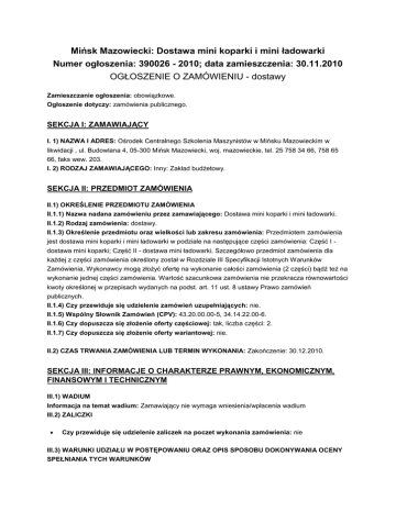 Mińsk Mazowiecki: Dostawa mini koparki i mini ładowarki Numer ogłoszenia: 390026 - 2010; data zamieszczenia: 30.11.2010 OGŁOSZENIE O ZAMÓWIENIU - dostawy Zamieszczanie ogłoszenia: obowiązkowe. Ogłoszenie dotyczy: zamówienia publicznego. SEKCJA I: ZAMAWIAJĄCY I. 1) NAZWA I ADRES: Ośrodek Centralnego Szkolenia Maszynistów w Mińsku Mazowieckim w likwidacji , ul. Budowlana 4, 05-300 Mińsk Mazowiecki, woj. mazowieckie, tel. 25 758 34 66, 758 65 66, faks wew. 203. I. 2) RODZAJ ZAMAWIAJĄCEGO: Inny: Zakład budżetowy. SEKCJA II: PRZEDMIOT ZAMÓWIENIA II.1) OKREŚLENIE PRZEDMIOTU ZAMÓWIENIA II.1.1) Nazwa nadana zamówieniu przez zamawiającego: Dostawa mini koparki i mini ładowarki. II.1.2) Rodzaj zamówienia: dostawy. II.1.3) Określenie przedmiotu oraz wielkości lub zakresu zamówienia: Przedmiotem zamówienia jest dostawa mini koparki i mini ładowarki w podziale na następujące części zamówienia: Część I dostawa mini koparki; Część II - dostawa mini ładowarki. Szczegółowo przedmiot zamówienia dla każdej z części zamówienia określony został w Rozdziale III Specyfikacji Istotnych Warunków Zamówienia, Wykonawcy mogą złożyć ofertę na wykonanie całości zamówienia (2 części) bądź też na wykonanie jednej części zamówienia. Wartość szacunkowa zamówienia nie przekracza równowartości kwoty określonej w przepisach wydanych na podst. art. 11 ust. 8 ustawy Prawo zamówień publicznych. II.1.4) Czy przewiduje się udzielenie zamówień uzupełniających: nie. II.1.5) Wspólny Słownik Zamówień (CPV): 43.20.00.00-5, 34.14.22.00-6. II.1.6) Czy dopuszcza się złożenie oferty częściowej: tak, liczba części: 2. II.1.7) Czy dopuszcza się złożenie oferty wariantowej: nie. II.2) CZAS TRWANIA ZAMÓWIENIA LUB TERMIN WYKONANIA: Zakończenie: 30.12.2010. SEKCJA III: INFORMACJE O CHARAKTERZE PRAWNYM, EKONOMICZNYM, FINANSOWYM I TECHNICZNYM III.1) WADIUM Informacja na temat wadium: Zamawiający nie wymaga wniesienia/wpłacenia wadium III.2) ZALICZKI Czy przewiduje się udzielenie zaliczek na poczet wykonania zamówienia: nie III.3) WARUNKI UDZIAŁU W POSTĘPOWANIU ORAZ OPIS SPOSOBU DOKONYWANIA OCENY SPEŁNIANIA TYCH WARUNKÓW III. 3.1) Uprawnienia do wykonywania określonej działalności lub czynności, jeżeli przepisy prawa nakładają obowiązek ich posiadania Opis sposobu dokonywania oceny spełniania tego warunku Zamawiający nie precyzuje w tym zakresie żadnych wymagań, których spełnianie o Wykonawca zobowiązany jest wykazać w sposób szczególny. III.3.2) Wiedza i doświadczenie Opis sposobu dokonywania oceny spełniania tego warunku Jeżeli Wykonawca będzie składać ofertę na jedną część zamówienia to musi wykazać się o następującą wiedzą i doświadczeniem odnoszącym się do danej części: Część I: Wykonawca musi wykazać się doświadczeniem, w wykonaniu (zakończeniu) w okresie ostatnich 3 lat przed upływem terminu składania ofert, a jeżeli okres prowadzenia działalności jest krótszy - w tym okresie, co najmniej 2 dostaw mini koparek, Część II: Wykonawca musi wykazać się doświadczeniem, w wykonaniu (zakończeniu) w okresie ostatnich 3 lat przed upływem terminu składania ofert, a jeżeli okres prowadzenia działalności jest krótszy - w tym okresie, co najmniej 2 dostaw mini ładowarek, Jeżeli Wykonawca będzie składać ofertę na całość zamówienia (na dwie części zamówienia) zobowiązany jest wykazać się następującą wiedzą i doświadczeniem: Wykonawca musi wykazać się doświadczeniem, w wykonaniu (zakończeniu) w okresie ostatnich 3 lat przed upływem terminu składania ofert, a jeżeli okres prowadzenia działalności jest krótszy - w tym okresie, co najmniej 1 dostawy mini koparki i co najmniej 1 dostawy mini ładowarki III.3.3) Potencjał techniczny Opis sposobu dokonywania oceny spełniania tego warunku Zamawiający nie precyzuje w tym zakresie żadnych wymagań, których spełnianie o Wykonawca zobowiązany jest wykazać w sposób szczególny. III.3.4) Osoby zdolne do wykonania zamówienia Opis sposobu dokonywania oceny spełniania tego warunku Zamawiający nie precyzuje w tym zakresie żadnych wymagań, których spełnianie o Wykonawca zobowiązany jest wykazać w sposób szczególny. III.3.5) Sytuacja ekonomiczna i finansowa Opis sposobu dokonywania oceny spełniania tego warunku Zamawiający nie precyzuje w tym zakresie żadnych wymagań, których spełnianie o Wykonawca zobowiązany jest wykazać w sposób szczególny. III.4) INFORMACJA O OŚWIADCZENIACH LUB DOKUMENTACH, JAKIE MAJĄ DOSTARCZYĆ WYKONAWCY W CELU POTWIERDZENIA SPEŁNIANIA WARUNKÓW UDZIAŁU W POSTĘPOWANIU ORAZ NIEPODLEGANIA WYKLUCZENIU NA PODSTAWIE ART. 24 UST. 1 USTAWY III.4.1) W zakresie wykazania spełniania przez wykonawcę warunków, o których mowa w art. 22 ust. 1 ustawy, oprócz oświadczenia o spełnieniu warunków udziału w postępowaniu, należy przedłożyć: wykaz wykonanych, a w przypadku świadczeń okresowych lub ciągłych również wykonywanych, dostaw lub usług w zakresie niezbędnym do wykazania spełniania warunku wiedzy i doświadczenia w okresie ostatnich trzech lat przed upływem terminu składania ofert albo wniosków o dopuszczenie do udziału w postępowaniu, a jeżeli okres prowadzenia działalności jest krótszy - w tym okresie, z podaniem ich wartości, przedmiotu, dat wykonania i odbiorców, oraz załączeniem dokumentu potwierdzającego, że te dostawy lub usługi zostały wykonane lub są wykonywane należycie III.4.2) W zakresie potwierdzenia niepodlegania wykluczeniu na podstawie art. 24 ust. 1 ustawy, należy przedłożyć: oświadczenie o braku podstaw do wykluczenia aktualny odpis z właściwego rejestru, jeżeli odrębne przepisy wymagają wpisu do rejestru, w celu wykazania braku podstaw do wykluczenia w oparciu o art. 24 ust. 1 pkt 2 ustawy, wystawiony nie wcześniej niż 6 miesięcy przed upływem terminu składania wniosków o dopuszczenie do udziału w postęp