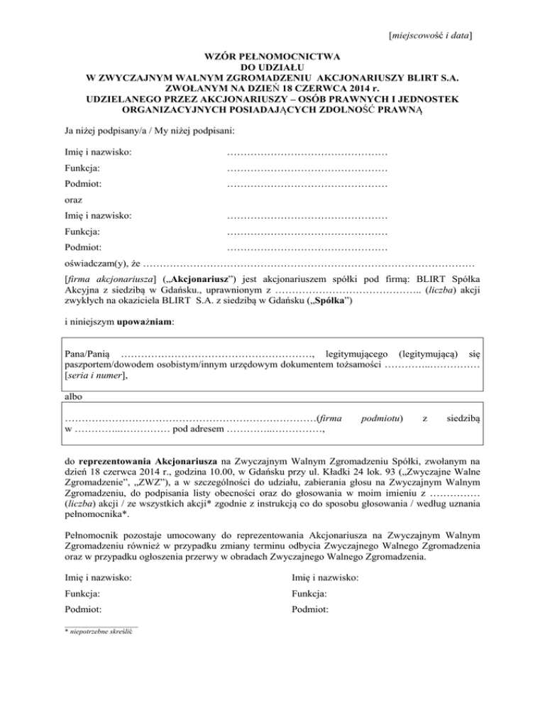 [miejscowość i data] WZÓR PEŁNOMOCNICTWA DO UDZIAŁU W ZWYCZAJNYM WALNYM ZGROMADZENIU AKCJONARIUSZY BLIRT S.A. ZWOŁANYM NA DZIEŃ 18 CZERWCA 2014 r. UDZIELANEGO PRZEZ AKCJONARIUSZY – OSÓB PRAWNYCH I JEDNOSTEK ORGANIZACYJNYCH POSIADAJĄCYCH ZDOLNOŚĆ PRAWNĄ Ja niżej podpisany/a / My niżej podpisani: Imię i nazwisko: ………………………………………… Funkcja: ………………………………………… Podmiot: ………………………………………… oraz Imię i nazwisko: ………………………………………… Funkcja: ………………………………………… Podmiot: ………………………………………… oświadczam(y), że ……………………………………………………………………………………… [firma akcjonariusza] („Akcjonariusz”) jest akcjonariuszem spółki pod firmą: BLIRT Spółka Akcyjna z siedzibą w Gdańsku., uprawnionym z …………………………………….. (liczba) akcji zwykłych na okaziciela BLIRT S.A. z siedzibą w Gdańsku („Spółka”) i niniejszym upoważniam: Pana/Panią …………………………………………………, legitymującego (legitymującą) się paszportem/dowodem osobistym/innym urzędowym dokumentem tożsamości …………..…………… [seria i numer], albo …………………………………………………………………(firma w …………..…………… pod adresem …………..……………, podmiotu) z siedzibą do reprezentowania Akcjonariusza na Zwyczajnym Walnym Zgromadzeniu Spółki, zwołanym na dzień 18 czerwca 2014 r., godzina 10.00, w Gdańsku przy ul. Kładki 24 lok. 93 („Zwyczajne Walne Zgromadzenie”, „ZWZ”), a w szczególności do udziału, zabierania głosu na Zwyczajnym Walnym Zgromadzeniu, do podpisania listy obecności oraz do głosowania w moim imieniu z …………… (liczba) akcji / ze wszystkich akcji* zgodnie z instrukcją co do sposobu głosowania / według uznania pełnomocnika*. Pełnomocnik pozostaje umocowany do reprezentowania Akcjonariusza na Zwyczajnym Walnym Zgromadzeniu również w przypadku zmiany terminu odbycia Zwyczajnego Walnego Zgromadzenia oraz w przypadku ogłoszenia przerwy w obradach Zwyczajnego Walnego Zgromadzenia. Imię i nazwisko: Imię i nazwisko: Funkcja: Funkcja: Podmiot: Podmiot: ____________________ * niepotrzebne skreślić INFORMACJA DLA AKCJONARIUSZA 1. W przypadku rozbieżności pomiędzy danymi akcjonariusza wskazanymi w pełnomocnictwie a danymi znajdującymi się na liście akcjonariuszy sporządzonej w oparciu o wykaz otrzymany od podmiotu prowadzącego depozyt papierów wartościowych (Krajowy Depozyt Papierów Wartościowych SA w Warszawie) i przekazanego Spółce zgodnie z art. 4063 Kodeksu spółek handlowych akcjonariusz może zostać niedopuszczony do udziału w Zwyczajnym Walnym Zgromadzeniu. 2. Zawiadomienie o udzieleniu lub odwołaniu pełnomocnictwa w postaci elektronicznej powinno zostać dokonane najpóźniej do godziny 12:00 w dniu poprzedzającym dzień Walnego Zgromadzenia. 3. Ryzyko związane z użyciem elektronicznej formy komunikacji leży po stronie akcjonariusza. 4. W celu weryfikacji ważności pełnomocnictwa udzielonego w postaci elektronicznej oraz w celu identyfikacji akcjonariusza i pełnomocnika, po otrzymaniu zawiadomienia o udzieleniu pełnomocnictwa w formie elektronicznej Spółki sprawdza, czy załączone zostały dokumenty w formie elektronicznej (skany) umożliwiające identyfikację i weryfikację akcjonariusza oraz pełnomocnika, a także czy w przypadku osób prawnych i jednostek organizacyjnych, czy zostały zachowane zasady reprezentacji tych podmiotów. Ponadto, Spółka ma prawo skomunikować się telefonicznie na numer wskazany przez akcjonariusza lub wysłać wiadomość poczty elektronicznej zwrotną w celu weryfikacji faktu udzielenia przez danego akcjonariusza pełnomocnictwa w postaci elektronicznej. 5. Wszelkie dokumenty przesyłane do Spółki drogą elektroniczną powinny być skonwertowane (zeskanowane) do formatu PDF. 6. Załączona instrukcja odnośnie sposobu głosowania nad poszczególnymi uchwałami w trakcie Zwyczajnego Walnego Zgromadzenia jest dokumentem poufnym, pomiędzy akcjonariuszem a jego pełnomocnikiem i nie powinna być ujawniona BLIRT zarówno przed jak i po odbyciu Zwyczajnego Walnego Zgromadzenia. Oddanie przez pełnomocnika głosu w sposób niezgodny z instrukcją udzieloną mu przez akcjonariusza nie wpływa na ważność głosowania. 7. Załączona instrukcja odnośnie sposobu głosowania nie służy do weryfikacji sposobu głosowania dokonywanego przez pełnomocnika w imieniu akcjonariusza. 8. Załączona instrukcja odnośnie sposobu głosowania nie zastępuje pełnomocnictwa udzielonego pełnomocnikowi przez akcjonariusza. 9. Korzystanie z instrukcji odnośnie sposobu głosowania udostępnionych przez Spółkę nie jest dla akcjonariusza obligatoryjne i nie jest warunkiem oddania głosu przez pełnomocnika obecnego na Zwyczajnym Walnym Zgromadzeniu.
