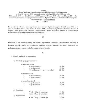 Uchwała Rady Wydziału Prawa i Administracji Uniwersytetu Jagiellońskiego z dnia 23 czerwca 2008 r. ze zmianami z dnia 6 października 2008 r., z dnia 24 listopada 2008 r., z dnia 29 czerwca 2009 r., z dnia 24 maja 2010 roku, oraz 30 maja 2011 roku w sprawie planu studiów i programu nauczania na Wydziale Prawa i Administracji Uniwersytetu Jagiellońskiego – kierunek Prawo Tekst jednolity Na podstawie § 4 ust. 1 uchwały Senatu Uniwersytetu Jagiellońskiego z dnia 31 maja 2006 r., z dnia 25 kwietnia 2007 r., oraz z dnia 25 marca 2009 r. w sprawie regulaminu studiów I stopnia, II stopnia oraz jednolitych studiów magisterskich, Rada Wydziału Prawa i Administracji Uniwersytetu Jagiellońskiego stanowi, co następuje: §1 Punktacji ECTS podlegają kursy zakończone egzaminem, seminaria, proseminaria, lektoraty z języków obcych, szkoły prawa obcego, poradnia prawna, praktyki, warsztaty. Punktacji nie podlegają zajęcia z wychowania fizycznego oraz ćwiczenia. §2 1. Zasady punktacji są następujące: 1) Wykłady grupy przedmiotów: a) obowiązkowych 60 g. (2 semestry) 45 g. (1semestr) 180 g. (2 semestry – prawo cywilne) 11 pkt 9 pkt 22 pkt b) podstawowych 60 g. (2 semestry) 45 g. (1 semestr) 9 pkt 7 pkt c) specjalizacyjnych 45 g. (1 semestr) 30 g. (1 semestr) 6 pkt 4 pkt 2) Seminaria 3) Proseminaria IV rok 60 g. (2 semestry) V rok 60 g. (2 semestry) III rok 60 g. (2 semestry) 4 pkt 20 pkt 2 pkt 4) Języki - obowiązkowy (jeden nowożytny) fakultatywny (łacina) język polski dla obcokrajowców 5) Szkoły Praw Obcych a) Szkoła Prawa Austriackiego (Wstęp do prawa austriackiego) b) Szkoła Prawa Francuskiego (Prawniczy język francuski – 2 pkt) (Wstęp do prawa francuskiego –18 pkt) c) Szkoła Prawa Amerykańskiego (Prawniczy język angielski – 2 pkt) (Wstęp do prawa amerykańskiego – 18 pkt) d) Szkoła Prawa Niemieckiego (Prawniczy język niemiecki – 2 pkt) (Wstęp do prawa niemieckiego – 18 pkt) 6) Poradnia Prawna 7) Praktyka jednomiesięczna 8 pkt 2 pkt 4 pkt 15 pkt 20 pkt 20 pkt 20 pkt 15 pkt 2 pkt 8) Warsztaty 2-9 pkt 9) Ćwiczenia 0 pkt - 60 g. (2 semestry) 30 g. (1 semestr) 120 g. (2 semestr – prawo cywilne) 10) Wykład wygłaszany w języku obcym otrzymuje 1 pkt dodatkowy. 2. Liczba godzin dydaktycznych na studiach niestacjonarnych wynosi co najmniej 60% godzin zaplanowanych dla studiów stacjonarnych. 3. Zajęcia na studiach niestacjonarnych odbywają się w piątki, soboty, niedziele zgodnie z harmonogramem zajęć. §3 1. Warunkiem zaliczenia studiów i dopuszczenia do egzaminu magisterskiego jest uzyskanie przez studenta w toku studiów 300 punktów oraz spełnienie warunków określonych w programie studiów dla danego roku. 2. Warunkiem zaliczenia roku jest uzyskanie co najmniej 60 punktów oraz spełnienie warunków określonych w programie studiów dla danego roku. 3. W przypadku uzyskania w terminie określonym w § 9 ust. 2 lub 3 regulaminu studiów co najmniej 50 punktów oraz spełnienia innych warunków określonych w programie studiów, student na swój wniosek uzyskuje wpis na kolejny rok, na warunkach określonych w § 10 regulaminu. W sytuacji określonej w ust. 3 dopuszcza się niezaliczenie tylko jednego przedmiotu lub zajęć obowiązkowych z grupy przedmiotów obowiązkowych (określonych w § 5 uchwały) albo z grupy przedmiotów podstawowych (określonych w § 6 uchwały). 5. Student, który stara się o uzyskanie wpisu na kolejny rok w trybie § 10 ust. 6, § 13 ust.1 i 3, oraz § 30, 30a i 33 Regulaminu studiów w UJ, składa odpowiedni wniosek przed rozpoczęciem roku akademickiego. W przypadku konieczności powtórzenia przedmiotów, student jest zobowiązany do wskazania we wniosku przedmiotów, które będzie powtarzał. 4. §4 Program studiów obejmuje 4 grupy przedmiotów: obowiązkowe, podstawowe, specjalizacyjne, fakultatywne. §5 1. Grupę przedmiotów obowiązkowych na kierunku prawo stanowią: 1) na roku I – 4 przedmioty: a) wstęp do prawoznawstwa – przedmiot jednosemestralny b) logika dla prawników – przedmiot jednosemestralny c) prawo konstytucyjne – przedmiot dwusemestralny d) jeden z trzech przedmiotów historycznoprawnych do wyboru przez studenta (historia państwa i prawa polskiego – przedmiot dwusemestralny, powszechna historia prawa – przedmiot dwusemestralny, prawo rzymskie – przedmiot dwusemestralny). Student w momencie składania deklaracji jest zobowiązany do określenia, który z tych trzech przedmiotów będzie dla niego obowiązkowy. 2) na roku II – 1 lub 2 przedmioty: a) prawo cywilne (przedmiot dwusemestralny) albo b) prawo karne (przedmiot dwusemestralny) i prawo administracyjne (przedmiot dwusemestralny). 3) na roku III – 1 lub 2 przedmioty: a) prawo cywilne (przedmiot dwusemestralny) albo b) prawo karne (przedmiot dwusemestralny) i prawo administracyjne (przedmiot dwusemestralny). 4) po zaliczeniu odpowiedniego przedmiotu z prawa materialnego cywilnego, karnego i administracyjnego, student jest zobowiązany do zaliczenia postępowania cywilnego, procesu karnego, postępowania administracyjnego i sądowoadministracyjnego (przedmioty dwusemestralne). 2. Warunkiem zaliczenia I roku jest uzyskanie przez studenta zaliczenia zajęć z wychowania fizycznego oraz szkolenia BHP. 3. Warunkiem zaliczenia II roku przez studentów obcokrajowców jest zdanie egzaminu z języka polskiego. 4. Warunkiem zaliczenia III roku na studiach stacjonarnych a IV roku na studiach niestacjonarnych jest zdanie egzaminu z języka obcego nowożytnego co najmniej na poziomie B2. 5. Warunkiem zaliczenia IV roku jest uzyskanie zaliczenia z seminarium magisterskiego. 6. Warunkiem zaliczenia V roku jest uzyskanie zaliczenia z seminarium magisterskiego przez złożenie pracy magisterskiej oraz zaliczenie praktyki zawodowej. 7. W toku studiów student studiów stacjonarnych zobowiązany jest do zdania jednego przedmiotu w języku obcym. 8. Przedmioty obowiązkowe jednosemestralne realizowane są w formie 45 godzin wyk