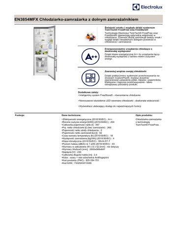 EN3854MFX Chłodziarko-zamrażarka z dolnym zamrażalnikiem Świeżość smaku i wyglądu dzięki systemom TwinTech® FrostFree oraz FreeStore® Technologie Electrolux TwinTech® FrostFree oraz FreeStore® zapewniają optymalną wilgotność w chłodziarce. Żywność dłużej zachowuje świeży smak i wygląd dzięki niezależnym obiegom powietrza w chłodziarce i zamrażarce. Energooszczędne urządzenie chłodzące o doskonałej wydajności Dzięki klasie energetycznej A++ to urządzenie łączy doskonałą wydajność z bardzo niskim zużyciem energii. Zaaranżuj wnętrze swojej chłodziarki Dzięki praktycznenu systemowi przechowywania na drzwiach CustomFlex®, możesz dowolnie zaaranżować ustawienie półek, klipsów i pojemników. Efektywne i logiczne przechowywanie - łatwo odnajdziesz potrzebny produkt. Dodatkowe zalety: • Inteligentny system FreeStore® - równomierne chłodzenie • Nowoczesne oświetlenie LED wewnatrz chłodziarki - doskonała widoczność • Wyświetlacz ułatwiający dostęp do najważniejszych funkcji Funkcje: Dane techniczne: Opis produktu: • Efektywność energetyczna (2010/30/EC) : A++ •Roczne zużycie energii [kWh] (2010/30/EC) : 254 •Całkowita pojemność netto [l] : 357 •Poj. netto chłodziarki [l] (bez zamrażarki) : 265 •Pojemność netto strefy chłodzenia : 0 •Pojemność netto zamrażalnika [l] : 92 •Czas wzrostu temperatury [h] (2010/30/EC) : 18 •Wydajność zamrażania [kg/24h] (2010/30/EC) : 4 •Klasa klimatyczna (2010/30/EC) : SN-N-ST-T •Poziom hałasu [dB(A) re 1 pW] (2010/30/EC) : 43 •Wymiary w zabudowie (W x S x G) [mm] : nie dotyczy •Wymiary WxSzxG [mm] : 2005x595x647 •Napięcie [V] : 230 •Całkowita długość kabla [m] : 2,4 •Kolor : szary + stal szlachetna Antifingeprint •Kod produktu (PNC) : 925 054 701 •Kod EAN : 7332543413348 Chłodziarko-zamrażarka z technologią TwinTech® FrostFree.