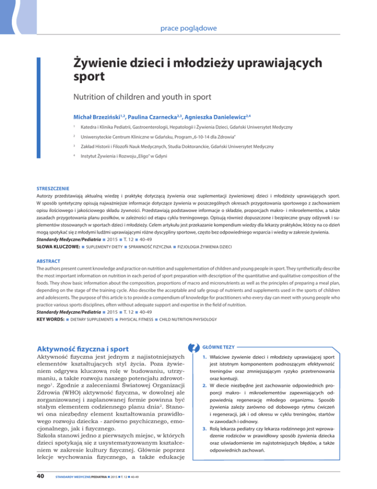 prace poglądowe Żywienie dzieci i młodzieży uprawiających sport Nutrition of children and youth in sport Michał Brzeziński1,2, Paulina Czarnecka2,3, Agnieszka Danielewicz2,4 Katedra i Klinika Pediatrii, Gastroenterologii, Hepatologii i Żywienia Dzieci, Gdański Uniwersytet Medyczny 1 Uniwersyteckie Centrum Kliniczne w Gdańsku, Program „6-10-14 dla Zdrowia” 2 Zakład Historii i Filozofii Nauk Medycznych, Studia Doktoranckie, Gdański Uniwersytet Medyczny 3 Instytut Żywienia i Rozwoju „Eligo” w Gdyni 4 STRESZCZENIE Autorzy przedstawiają aktualną wiedzę i praktykę dotyczącą żywienia oraz suplementacji żywieniowej dzieci i młodzieży uprawiających sport. W sposób syntetyczny opisują najważniejsze informacje dotyczące żywienia w poszczególnych okresach przygotowania sportowego z zachowaniem opisu ilościowego i jakościowego składu żywności. Przedstawiają podstawowe informacje o składzie, proporcjach makro- i mikroelementów, a także zasadach przygotowania planu posiłków, w zależności od etapu cyklu treningowego. Opisują również dopuszczone i bezpieczne grupy odżywek i suplementów stosowanych w sportach dzieci i młodzieży. Celem artykułu jest przekazanie kompendium wiedzy dla lekarzy praktyków, którzy na co dzień mogą spotykać się z młodymi ludźmi uprawiającymi różne dyscypliny sportowe, często bez odpowiedniego wsparcia i wiedzy w zakresie żywienia. Standardy Medyczne/Pediatria 2015 T. 12 40-49 SŁOWA KLUCZOWE: SUPLEMENTY DIETY SPRAWNOŚĆ FIZYCZNA FIZJOLOGIA ŻYWIENIA DZIECI ABSTRACT The authors present current knowledge and practice on nutrition and supplementation of children and young people in sport. They synthetically describe the most important information on nutrition in each period of sport preparation with description of the quantitative and qualitative composition of the foods. They show basic information about the composition, proportions of macro and micronutrients as well as the principles of preparing a meal plan, depending on the stage of the training cycle. Also describe the acceptable and safe group of nutrients and supplements used in the sports of children and adolescents. The purpose of this article is to provide a compendium of knowledge for practitioners who every day can meet with young people who practice various sports disciplines, often without adequate support and expertise in the field of nutrition. Standardy Medyczne/Pediatria 2015 T. 12 40-49 KEY WORDS: DIETARY SUPPLEMENTS PHYSICAL FITNESS CHILD NUTRITION PHYSIOLOGY Aktywność fizyczna i sport Aktywność fizyczna jest jednym z najistotniejszych elementów kształtujących styl życia. Poza żywieniem odgrywa kluczową rolę w budowaniu, utrzymaniu, a także rozwoju naszego potencjału zdrowotnego1. Zgodnie z zaleceniami Światowej Organizacji Zdrowia (WHO) aktywność fizyczna, w dowolnej ale zorganizowanej i zaplanowanej formie powinna być stałym elementem codziennego planu dnia2. Stanowi ona niezbędny element kształtowania prawidłowego rozwoju dziecka - zarówno psychicznego, emocjonalnego, jak i fizycznego. Szkoła stanowi jedno z pierwszych miejsc, w których dzieci spotykają się z usystematyzowanym kształceniem w zakresie kultury fizycznej. Głównie poprzez lekcje wychowania fizycznego, a także edukację 40 STANDARDY MEDYCZNE/PEDIATRIA 2015 T. 12 40-49 GŁÓWNE TEZY 1. Właściwe żywienie dzieci i młodzieży uprawiającej sport jest istotnym komponentem podnoszącym efektywność treningów oraz zmniejszającym ryzyko przetrenowania oraz kontuzji. 2. W diecie niezbędne jest zachowanie odpowiednich proporcji makro- i mikroelementów zapewniających odpowiednią regenerację młodego organizmu. Sposób żywienia zależy zarówno od dobowego rytmu ćwiczeń i regeneracji, jak i od okresu w cyklu treningów, startów w zawodach i odnowy. 3. Rolą lekarza pediatry czy lekarza rodzinnego jest wprowadzenie rodziców w prawidłowy sposób żywienia dziecka oraz uświadomienie im najistotniejszych błędów, a także odpowiednich zachowań. prace poglądowe zdrowotną prowadzoną przez cały okres nauczania szkolnego, zgodnie z obowiązującą podstawą programową3. Na tym etapie następuje również pierwsza selekcja uczniów do uprawiania bardziej zorganizowanej formy aktywności, jaką jest sport. W odróżnieniu od aktywności fizycznej, sport w swoim założeniu nie jest nastawiony na uzyskanie i utrzymanie potencjału zdrowotnego, ale na uzyskanie jak najlepszych wyników sprawności i wydolności fizycznej, co przenosi się na uzyskanie jak najlepszych rezultatów w danej dyscyplinie sportowej4. Czasem może to rodzić pytanie, czy sport nie stoi w opozycji z optymalnym rozwojem dziecka? Zgodnie z istniejącymi rekomendacjami oraz aktami prawnymi dzieci w poszczególnych grupach wiekowych powinny być dopuszczane do uprawiania sportów w określonych dyscyplinach i na określonym poziomie intensywności. Ogólne kryteria wiekowe do rozpoczęcia uprawiania dyscyplin sportowych są następujące, zgodnie z zaleceniami Polskiego Towarzystwa Medycyny Sportowej5: - do ukończenia 6. roku życia - wszystkie dyscypliny sportu oparte na naturalnych formach ruchu w formie gier i zabaw ruchowych, - od ukończenia 6. roku życia - dyscypliny sportu oparte na naturalnych formach ruchu, rozwijające koordynację ruchu, które nie przeciążają wybiórczo układu ruchu, - od ukończenia 8. roku życia - dyscypliny sportu rozwijające, oprócz zwinności, także szybkość i dynamikę ruchu, - od ukończenia 10. roku życia - dyscypliny sportu rozwijające wytrzymałość i siłę, - od ukończenia 13. roku życia - dyscypliny sportu, w których wprowadza się w pełnym zakresie trening wytrzymałościowy, - od ukończenia 15. roku życia - dyscypliny sportu, w których wprowadza się w pełnym zakresie statyczne ćwiczenia siłowe. Podstawową zasadą jest wspieranie optymalnego rozwoju fizycznego i psychicznego dziecka. Nie powinno się zby