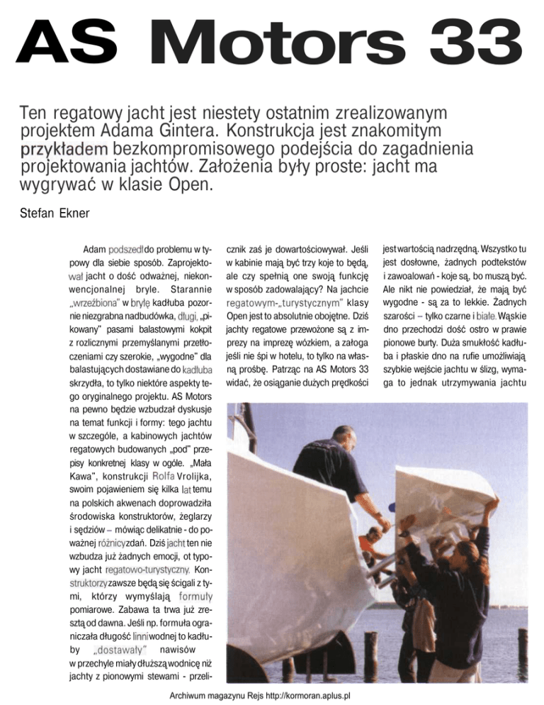 AS Motors 33 Ten regatowy jacht jest niestety ostatnim zrealizowanym projektem Adama Gintera. Konstrukcja jest znakomitym przykładem bezkompromisowego podejścia do zagadnienia projektowania jachtów. Założenia były proste: jacht ma wygrywać w klasie Open. Stefan Ekner Adam podszedł do problemu w typowy dla siebie sposób. Zaprojektował jacht o dość odważnej, niekonwencjonalnej bryle. Starannie „wrzeźbiona" w bryłę kadłuba pozornie niezgrabna nadbudówka, długi, „pikowany" pasami balastowymi kokpit z rozlicznymi przemyślanymi przetłoczeniami czy szerokie, „wygodne" dla balastujących dostawiane do kadłuba skrzydła, to tylko niektóre aspekty tego oryginalnego projektu. AS Motors na pewno będzie wzbudzał dyskusje na temat funkcji i formy: tego jachtu w szczególe, a kabinowych jachtów regatowych budowanych „pod" przepisy konkretnej klasy w ogóle. „Mała Kawa", konstrukcji Rolfa Vrolijka, swoim pojawieniem się kilka lat temu na polskich akwenach doprowadziła środowiska konstruktorów, żeglarzy i sędziów - mówiąc delikatnie - do poważnej różnicy zdań. Dziś jacht ten nie wzbudza już żadnych emocji, ot typowy jacht regatowo-turystyczny. Konstruktorzy zawsze będą się ścigali z tymi, którzy wymyślają formuły pomiarowe. Zabawa ta trwa już zresztą od dawna. Jeśli np. formuła ograniczała długość linni wodnej to kadłuby „dostawały" nawisów w przechyle miały dłuższą wodnicę niż jachty z pionowymi stewami - przeli- cznik zaś je dowartościowywał. Jeśli w kabinie mają być trzy koje to będą, ale czy spełnią one swoją funkcję w sposób zadowalający? Na jachcie regatowym-„turystycznym" klasy Open jest to absolutnie obojętne. Dziś jachty regatowe przewożone są z imprezy na imprezę wózkiem, a załoga jeśli nie śpi w hotelu, to tylko na własną prośbę. Patrząc na AS Motors 33 widać, że osiąganie dużych prędkości Archiwum magazynu Rejs http://kormoran.aplus.pl jest wartością nadrzędną. Wszystko tu jest dosłowne, żadnych podtekstów i zawoalowań - koje są, bo muszą być. Ale nikt nie powiedział, że mają być wygodne - są za to lekkie. Żadnych szarości - tylko czarne i białe. Wąskie dno przechodzi dość ostro w prawie pionowe burty. Duża smukłość kadłuba i płaskie dno na rufie umożliwiają szybkie wejście jachtu w ślizg, wymaga to jednak utrzymywania jachtu w stałym, niewielkim przechyle. Stateczność jachtu zapewnia załoga balastująca na szerokich skrzydłach (demontowanych do transportu) i szybrowa wąska płetwa z bulbem. Logiczną konsekwencją tak rozwiązanego balastu jest szybrowa płetwa sterowa rozpowszechniona w Polsce właśnie przez Adama na Ginie 730. Kadłub wykonany jako kompozytowa konstrukcja przekładkowa z pianki, epoksydu, szkła, kewlaru i węgla jest lekki i sztywny. Maszt o długości 14 m, blisko 6-metrowy bom oraz wysuwany bukszpryt, wystający 4,5 m przed stewę wykonano z kompozytu węglowego. Maszt z trzema piętrami salingów usztywnia i podtrzymuje prętowy takielunek. Grot o powierzchni 54 m2 z dużą strzałką tylnego liku, fok 21 m2-z likiem dolnym prowadzonym tuż nad pokładem dziobowym i monstrualny genaker o powierzchni 108 m2 -w rysunku bocznym ta piramida „płócien" pozostaje w doskonałej harmonii z futurystyczną formą kadłuba. Jacht AS MOTORS 33 na pewno będzie prowokował spory, budził ożywione dyskusje i kontrowersje, zarówno w kwestiach architektury jak i niektórych rozwiązań technicznych. Jedno jest pewne, koło tego jachtu nie da się przejść obojętnie. Fot. Magdalena Opis-Szykowna Rys. Marek Strauchold Archiwum magazynu Rejs http://kormoran.aplus.pl AS Motors 33 długość LOA 10 m długość KLW 9,6 m szerokość całkowita 4,6 m szerokość KLW 1 ,7 m zanurzenie 1,8 m wyporność 900 kg masa balastu 380 kg powierzchnia żagli podst. 75 m2 genaker 108 m2 Archiwum magazynu Rejs http://kormoran.aplus.pl
