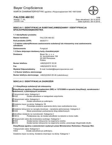 Bayer CropScience KARTA CHARAKTERYSTYKI zgodnie z Rozporządzeniem WE 1907/2006 FALCON 460 EC 1/16 Data aktualizacji: 29.10.2015 Data wydruku: 29.10.2015 Wersja 7 / PL 102000011280 SEKCJA 1: IDENTYFIKACJA SUBSTANCJI/MIESZANINY I IDENTYFIKACJA SPÓŁKI/PRZEDSIĘBIORSTWA 1.1 Identyfikator produktu Nazwa handlowa FALCON 460 EC Kod produktu (UVP) 06353711 1.2 Istotne zidentyfikowane zastosowania substancji lub mieszaniny oraz zastosowania odradzane Zastosowanie Fungicyd 1.3 Dane dotyczące dostawcy karty charakterystyki Dostawca Bayer Sp. z. o. o. Al. Jerozolimskie 158 02-326 Warszawa Polska Numer telefonu +48(0)22/572 35 00 Fax +48(0)22/572 36 03 Wydział Odpowiedzialny E-mail: [email protected] 1.4 Numer telefonu alarmowego Numer telefonu alarmowego +48(0)22/823 85 46 (całodobowy) SEKCJA 2: IDENTYFIKACJA ZAGROŻEŃ 2.1 Klasyfikacja substancji lub mieszaniny Klasyfikacja zgodna z Rozporządzeniem (WE) nr 1272/2008 w sprawie klasyfikacji, oznakowania i pakowania, z późniejszymi zmianami. Toksyczność ostra: Kategoria 4 H332 Działa szkodliwie w następstwie wdychania. Toksyczność ostra: Kategoria 4 H302 Działa szkodliwie po połknięciu. Działanie żrące na skórę: Kategoria 1B H314 Powoduje poważne oparzenia skóry oraz uszkodzenia oczu. Działanie toksyczne na narządy docelowe - narażenie jednorazowe: Kategoria 3 H335 Może powodować podrażnienie dróg oddechowych. Szkodliwe działanie na rozrodczość: Kategoria 2 H361d Podejrzewa się, że działa szkodliwie na dziecko w łonie matki. Toksyczność ostra dla środowiska wodnego: Kategoria 1 H400 Działa bardzo toksycznie na organizmy wodne. H410 Działa bardzo toksycznie na organizmy wodne, powodując długotrwałe skutki. Klasyfikacja zgodna z zezwoleniem wydanym przez Ministerstwo Rolnictwa i Rozwoju Wsi. Toksyczność ostra: Kategoria 4 H302 Działa szkodliwie po połknięciu. Działanie żrące na skórę, Działanie drażniące na skórę: Kategoria 1 Bayer CropScience KARTA CHARAKTERYSTYKI zgodnie z Rozporządzeniem WE 1907/2006 FALCON 460 EC Wersja 7 / PL 102000011280 2/16 Data aktualizacji: 29.10.2015 Data wydruku: 29.10.2015 Powoduje poważne oparzenia skóry oraz uszkodzenia oczu. H314 Toksyczność ostra: Kategoria 4 H332 Działa szkodliwie w następstwie wdychania. Szkodliwe działanie na rozrodczość: Kategoria 2 H361d Podejrzewa się, że działa szkodliwie na dziecko w łonie matki. Przewlekła toksyczność dla środowiska wodnego: Kategoria 1 H410 Działa bardzo toksycznie na organizmy wodne, powodując długotrwałe skutki. 2.2 Elementy oznakowania Oznakowanie zgodne z zezwoleniem wydanym przez Ministerstwo Rolnictwa i Rozwoju Wsi. Oznakowanie w zakresie dostawy/stosowania jest wymagane. Składniki stwarzające zagrożenie muszą być wymienione na etykiecie: Spiroksamina Tebukonazol Triadimenol Hasło ostrzegawcze: Niebezpieczeństwo Zwroty wskazujące rodzaj zagrożenia H302 H314 H332 H361d H410 EUH401 EUH208 Działa szkodliwie po połknięciu. Powoduje poważne oparzenia skóry oraz uszkodzenia oczu. Działa szkodliwie w następstwie wdychania. Podejrzewa się, że działa szkodliwie na dziecko w łonie matki. Działa bardzo toksycznie na organizmy wodne, powodując długotrwałe skutki. W celu uniknięcia zagrożeń dla zdrowia ludzi i środowiska, należy postępować zgodnie z instrukcją użycia. Zawiera spiroksaminę. Może powodować wystąpienie reakcji alergicznej. Zwroty wskazujące środki ostrożności P201 P261 P280 P312 P391 Przed użyciem zapoznać się ze specjalnymi środkami ostrożności. Unikać wdychania par. Stosować rękawice ochronne/ odzież ochronną/ ochronę oczu/ ochronę twarzy. W przypadku złego samopoczucia skontaktować się z OŚRODKIEM ZATRUĆ/lekarzem. Zebrać wyciek. 2.3 Inne zagrożenia Inne zagrożenia nie są znane. SEKCJA 3: SKŁAD/INFORMACJA O SKŁADNIKACH 3.2 Mieszaniny Charakterystyka chemiczna Koncentrat do sporządzania emulsji wodnej (EC) Spiroksamina 250 g/l, Tebukonazol 167 g/l, Triadimenol 43 g/l Bayer CropScience KARTA CHARAKTERYSTYKI zgodnie z Rozporządzeniem WE 1907/2006 FALCON 460 EC 3/16 Data aktualizacji: 29.10.2015 Data wydruku: 29.10.2015 Wersja 7 / PL 102000011280 Składniki stwarzające zagrożenie Zwroty wskazujące rodzaj zagrożenia zgodnie z Rozporządzeniem WE 1272/2008 Stężenie [%] 55219-65-3 259-537-6 Klasyfikacja Rozporządzenie (WE) NR 1272/2008 Skin Irrit. 2, H315 Acute Tox. 4, H332 Skin Sens. 1, H317 Aquatic Acute 1, H400 Aquatic Chronic 1, H410 Acute Tox. 4, H302 Acute Tox. 4, H312 Skin Irrit. 2, H315 Eye Irrit. 2, H319 STOT SE 3, H335 Aquatic Chronic 3, H412 Repr. 2, H361d Acute Tox. 4, H302 Aquatic Acute 1, H400 Aquatic Chronic 1, H410 Acute Tox. 4, H302 Aquatic Chronic 3, H412 104376-75-2 Aquatic Chronic 3, H412 > 1 i < 25 96-48-0 202-509-5 Acute Tox. 4, H302 Eye Dam. 1, H318 STOT SE 3, H336 > 1 i < 15 Nazwa Nr CAS / Nr WE / Nr rejestracji REACH Spiroksamina 118134-30-8 N,N-Dimetylodekanoamid 14433-76-2 238-405-1 Tebukonazol 107534-96-3 403-640-2 Triadimenol Eter alkiloarylopoliglikolowy gamma-Butyrolakton 25,2 > 20 16,8 4,3 Dalsze informacje Spiroksamina Tebukonazol 118134-30-8 107534-96-3 Współczynnik M: 10 (acute) Współczynnik M: 1 (acute), 10 (chronic) Pełny tekst zwrotów H przytoczonych w tej Sekcji znajduje się w Sekcji 16. SEKCJA 4: ŚRODKI PIERWSZEJ POMOCY 4.1 Opis środków pierwszej pomocy Porady ogólne Natychmiast zdjąć całą zanieczyszczoną odzież i usunąć w bezpieczny sposób. Usunąć z zagrożonej strefy. Ułożyć i transportować poszkodowanego w stabilnej pozycji (bocznej ustalonej). W przypadku awarii lub jeżeli źle się poczujesz, niezwłocznie zasięgnij porady lekarza – jeżeli to możliwe, pokaż etykietę. Wdychanie Przenieść na świeże powietrze. Zapewnić poszkodowanemu ciepło i spokój. Natychmiast wezwać lekarza lub powiadomić ośrodek toksykologiczny. Bayer CropScience KARTA CHARAKTERYSTYKI zgodnie z Rozporządzeniem WE 1907/2006 FALCON 460 EC 4/16 Data aktualizacji: 29.