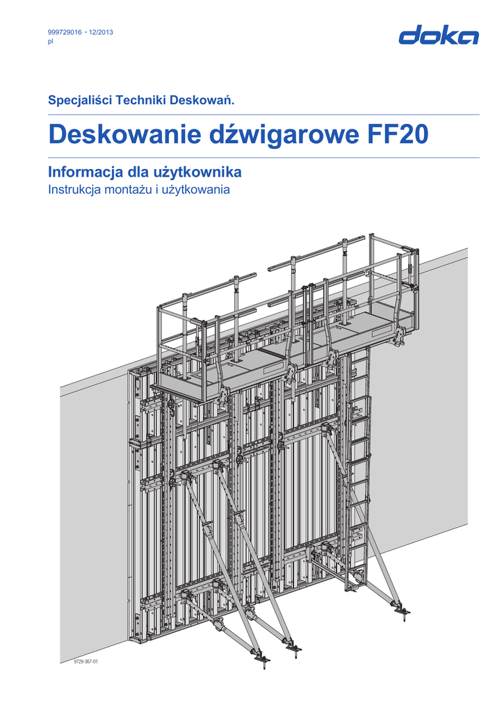 999729016 - 12/2013 pl Specjaliści Techniki Deskowań. Deskowanie dźwigarowe FF20 Informacja dla użytkownika Instrukcja montażu i użytkowania 9729-367-01 Wstęp Informacja dla użytkownika Deskowanie dźwigarowe FF20 Wstęp © by Doka Industrie GmbH, A-3300 Amstetten 2 999729016 - 12/2013 Informacja dla użytkownika Deskowanie dźwigarowe FF20 Wstęp Spis treści 4 4 7 8 Wstęp Podstawowe wskazówki bezpieczeństwa Eurokody i Doka Zakres usług firmy Doka 10 10 11 Deskowanie ścienne Opis produktu Przykłady montażu na leżąco elementów FF20 Raster systemowy Instrukcja montażu i użytkowania dla deskowania na wysokość pomieszczenia Instrukcja montażu i użytkowania dla wysokiego deskowania Element FF20 - opis szczegółowy Łączenie elementów System ściągów Dopasowanie długości przez wyrównanie Łączenie piętrowe elementów FF20 elementów Utworzenie narożnika pod kątem prostym Narożniki ostre i rozwarte Deskowanie czołowe Połączenia ścian Wypory ukośne Pomost betoniarski z pojedynczymi konsolami Pomosty betoniarskie Barierka zabezpieczająca System drabinek Przenoszenie za pomocą dźwigu Transportowanie, układanie w stosy i składowanie Pojemniki uniwersalne Doka 12 14 17 20 22 23 24 26 28 32 34 35 36 40 44 50 54 58 60 61 999729016 - 12/2013 66 66 67 70 72 76 80 82 84 88 94 95 98 Deskowanie ścienne z systemem pomostów Xsafe plus System pomostów Xsafe plus Instrukcja montażu i użytkowania System pomostów Pomosty Xsafe plus Akcesoria pomostu Xsafe plus Montaż Xsafe plus-pomostu na deskowaniu Wejścia drabinkowe Wypory ukośne Przepisy dotyczące zespołu elementów Deskowanie czołowe Przenoszenie za pomocą dźwigu Transportowanie, układanie w stosy i składowanie 100 100 Dalsze możliwości zastosowania FF20 w kombinacji z . . . 102 102 104 105 Ogólnie Czyszczenie i pielęgnacja Obarierowanie budowli Planowanie deskowania przy pomocy programu Tipos-Doka 106 Przegląd produktów 3 Wstęp Informacja dla użytkownika Deskowanie dźwigarowe FF20 Podstawowe wskazówki bezpieczeństwa Wstęp Grupy użytkowników Uwagi dotyczące tej instrukcji ▪ Dokument ten skierowany jest do osób, które pra- ▪ Dokument ten może służyć jako ogólnie obowiązu- ▪ ▪ ▪ ▪ cują z opisanym produktem/systemem firmy Doka. Zawiera on informacje dotyczące montażu opisanego systemu oraz jego zastosowania zgodnego z przeznaczeniem. Wszystkie osoby, które pracują z danym produktem, muszą być zaznajomione z zawartością tego dokumentu i zawartymi w nim wskazówkami bezpieczeństwa. Osoby, które nie potrafią czytać lub mogą przeczytać i zrozumieć ten dokument jedynie z dużym trudem, muszą zostać pouczone i przeszkolone przez klienta. Klient musi zapewnić, że informacje udostępnione przez firmę Doka (np.: informacje dla użytkownika, instrukcje montażu i użytkowania, instrukcje obsługi, plany itd.) są dostępne i aktualne, zostały one podane do wiadomości i są do dyspozycji użytkowników w miejscu wykorzystania produktu. W niniejszej dokumentacji technicznej i zawartych w niej schematach użycia deskowań Doka pokazuje środki bezpieczeństwa pracy służące bezpiecznemu stosowaniu produktów firmy Doka w przedstawionych zastosowaniach. W każdym przypadku użytkownik jest zobowiązany w całym projekcie do zapewnienia przestrzegania krajowych ustaw, norm i przepisów oraz, o ile to konieczne, do podjęcia dodatkowych bądź innych odpowiednich środków służących bezpieczeństwu pracy. Ocena zagrożenia ▪ ▪ Planowanie ▪ Zapewnić bezpieczne miejsca pracy przy używaniu ▪ 4 deskowania (np.: przy montażu, demontażu, przebudowie, przemieszczaniu, itp). Należy zapewnić bezpieczny dostęp do miejsc pracy! Odstępstwa od danych znajdujących się w niniejszej instrukcji lub zastosowania wykraczające poza te dane wymagają szczególnego statycznego udowodnienia oraz uzupełniającej instrukcji montażu. Przepisy / ochrona pracy ▪ W celu bezpiecznego, pod względem technicznym, ▪ Klient jest odpowiedzialny za zestawienie, dokumentację, zastosowanie oraz rewizję oceny zagrożenia na każdym placu budowy. Instrukcja ta może służyć jako materiał pomocniczy w opracowaniu oceny ryzyka zawodowego, a w szczególności, jako źródło informacji o potencjalnych zagrożeniach występujących przy użytkowaniu i eksploatacji produktu, ale jako Instrukcja Użytkowania nie zastępuje oceny ryzyka zawodowego i nie wyczerpuje informacji o wszystkich zagrożeniach, które mogą wystąpić podczas użytkowania i eksploatacji produktu. jąca instrukcja montażu i użytkowania, a także zostać włączony do specyficznej dla danego placu budowy dokumentacji techniczno-ruchowej. Rysunki przedstawione w tym dokumencie są częściowymi stanami montażowymi i dlatego nie zawsze są kompletne z punktu widzenia bezpieczeństwa technicznego. Nie wszystkie urządzenia BHP są na nich pokazane, co nie zwalnia Klienta z używania ich zgodnie z obowiązującymi przepisami. Dalsze wskazówki bezpieczeństwa i ostrzeżenia są wyszczególnione w poszczególnych rozdziałach! ▪ stosowania naszych produktów należy przestrzegać obowiązujących w danym kraju i państwie przepisów bhp oraz innych przepisów bezpieczeństwa w aktualnej wersji. Po upadku osoby lub uderzeniu jakiegoś przedmiotu w element systemu ochrony bocznej, element ten może być dalej wykorzystywany tylko po sprawdzeniu przez fachowca. 999729016 - 12/2013 Informacja dla użytkownika Deskowanie dźwigarowe FF20 Obowiązuje dla wszystkich faz zastosowania Wstęp Montaż ▪ Materiał/system musi zostać sprawdzony przez ▪ Klient musi zadbać, aby montaż i demontaż, przesta- ▪ ▪ ▪ ▪ ▪ ▪ ▪ wianie i użytkowanie produktu zgodnie z przeznaczeniem były wykonywane i nadzorowane zgodnie z obowiązującymi ustawami, normami i przepisami przez fachowy personel. Zdolność działania tych osób nie może być ograniczona przez wpływ alkoholu, leków lub narkotyków.