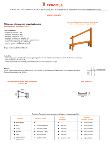 ul.Techniczna 2, 05-500 Piaseczno, tel./fax 22 845 62 75, tel. kom. 501-130-598, email: [email protected], www pergola.com.pl KARTA PRODUKTU Wizualizacja produktu ma charakter przyk³adowy. Kolory i detale urz¹dzenia mog¹ siê ró¿niæ. Wieszak z ³aweczk¹ przedszkolaka nr katalogowy producenta UZ.05 Dane techniczne: - d³ugoœæ urz¹dzenia: 1700 - szerokoœæ urz¹dzenia: 390 - wysokoœæ urz¹dzenia: 1555 - wysokoœæ swobodnego upadku: 445 - strefa bezpieczeñstwa: brak strefy bezpieczenstwa - rodzaj nawierzchni: zgodnie z Tablic¹ 1 - produkt zgodny z PN-EN1176-1:2009 Grupa wiekowa u¿ytkowników: 3+ Materia³y: - konstrukcja wykonana z belek z drewna iglastego 90 x 90 mm zabezpieczonych preparatem do drewna z lakierem, - monta¿ na kotwach stalowych, - zakoñczenia belek drewnianych przykryte kapturkami z tworzywa sztucznego, Monta¿: Wyrób zwi¹zany z gruntem na sta³e poprzez montowanie na prefabrykatach lub poprzez betonowanie na mokro. G³êbokoœæ posadowienia: -0,50 m. rzut poziomy ze stref¹ bezpieczeñstwa skala 1:100 500 poziom gruntu rzut pionowy 390 1125 1555 1410 445 1700 Tablica 1. Powszechnie stosowane materia³y amortyzuj¹ce upadek. materia³ wielkoœæ ziarna gruboœæ minimalna krytyczna wysokoœæ upadku darñ, gleba - - <= 1000 mm kora od 20 do 80 mm 200 mm <= 2000 mm wióry od 5 do 30 mm 200 mm <= 2000 mm piasek od 0,2 do 2 mm 200 mm <= 2000 mm ¿wir od 2 do 8 mm 200 mm <= 2000 mm nawierzchnie syntetyczne zgodnie z HIC zgodnie z HIC wg badania
