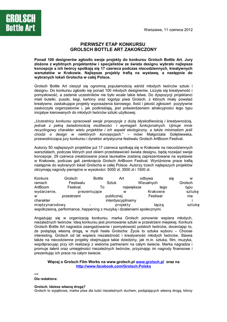 Warszawa, 11 czerwca 2012 PIERWSZY ETAP KONKURSU GROLSCH BOTTLE ART ZAKOŃCZONY Ponad 100 designerów zgłosiło swoje projekty do konkursu Grolsch Bottle Art. Jury złożone z wybitnych projektantów i specjalistów ze świata designu wybrało najlepsze koncepcje a ich twórcy spotkają się 17 czerwca podczas niecodziennych, kreatywnych warsztatów w Krakowie. Najlepsze projekty trafią na wystawę, a następnie do wybranych lokali Grolscha w całej Polsce. Grolsch Bottle Art cieszył się ogromną popularnością wśród młodych twórców sztuki i designu. Do konkursu zgłosiło się ponad 100 młodych designerów. Liczyła się kreatywność i pomysłowość, a zadanie uczestników nie było wcale takie łatwe. Do dyspozycji projektanci mieli butelki, puszki, kegi, kartony oraz logotyp piwa Grolsch, z których miały powstać kreatywne, zaskakujące projekty wyposażenia barowego. Ilość i jakość zgłoszeń pozytywnie zaskoczyła organizatorów i, jak podkreślają, jest potwierdzeniem atrakcyjności tego typu inicjatyw kierowanych do młodych twórców sztuki użytkowej. „Uczestnicy konkursu opracowali swoje propozycje z dużą błyskotliwością i kreatywnością, jednak z pełną świadomością możliwości i wymagań funkcjonalnych. Ujmuje mnie recyclingowy charakter wielu projektów i ich aspekt ekologiczny, a także minimalizm jeśli chodzi o design w niektórych koncepcjach.” – mówi Małgorzata Gołębiewska, przewodnicząca jury konkursu i dyrektor artystyczna festiwalu Grolsch ArtBoom Festival. Autorzy 50 najlepszych projektów już 17 czerwca spotkają się w Krakowie na niecodziennych warsztatach, podczas których pod okiem przedstawicieli świata designu, będą rozwijać swoje koncepcje. 29 czerwca zrealizowane prace laureatów zostaną zaprezentowane na wystawie w Krakowie, podczas gali zamknięcia Grolsch ArtBoom Festival. Wyróżnione prace trafią następnie do wybranych lokali Grolscha w całej Polsce. Autorzy trzech najlepszych projektów otrzymają nagrody pieniężne w wysokości: 5000 zł, 3500 zł i 1500 zł. Konkurs Grolsch Bottle Art odbywa się ramach Festiwalu Sztuk Wizualnych ArtBoom Festival. To największe tego wydarzenie, prezentujące w Krakowie w przestrzeni publicznej. Festiwal charakter interdyscyplinarny międzynarodowy projekty łączą współczesną, performance, happening z muzyką i działaniami społecznymi. w Grolsch typu sztukę̨ ma i sztukę̨ Angażując się w organizację konkursu, marka Grolsch ponownie wspiera młodych, niezależnych twórców. Ideą konkursu jest promowanie sztuki w przestrzeni miejskiej. Konkurs Grolsch Bottle Art nagradza zaangażowanie i pomysłowość polskich twórców, doceniając to, że podążają własną drogą, w myśl hasła Grolscha: Życie to sztuka wyboru – Choose interesting. Grolsch od lat wspiera niezależność i kreatywność młodych twórców. Stawia także na niecodzienne projekty obejmujące takie dziedziny, jak m.in. sztuka, film, muzyka, współpracując przy ich realizacji z wieloma partnerami na całym świecie. Marka nagradza i promuje talent oraz umiejętności niezależnych twórców, przyznając im nagrody finansowe i prezentując ich prace na całym świecie. Więcej o Grolsch Film Works na www.grolsch.pl www.grolsch.pl oraz na http://www.facebook.com/Grolsch.Polska *** Dla redaktora: Grolsch. Idziesz własną drogą? Grolsch to wyjątkowa, marka piwa dla ludzi niezależnych duchem, podążających własną drogą, którzy doceniają nie tylko jego wyśmienity smak ale przede wszystkim jego oryginalność i zaangażowanie. Grolsch powstaje w jednym z najnowocześniejszych i najbardziej ekologicznych browarów w Europie, w holenderskim mieście Enschede. Swój doskonały smak zawdzięcza unikalnej technice warzenia w niskiej temperaturze. Grolsch to najwyższej jakości holenderskie piwo typu lager, zawierające 5% alkoholu i 11,3% ekstraktu. Najlepiej smakuje podawane w temperaturze 6-8 C. Grolsch to marka dystrybuowana przez Kompanię Piwowarską od sierpnia 2009 roku. Grolsch w Polsce patronuje niezależnym wydarzeniom artystycznym, angażując się także w działania, których celem jest wspieranie niestandardowego sposobu myślenia. Kompania Piwowarska - Lider branży piwowarskiej w Polsce Kompania Piwowarska jest największym przedsiębiorstwem piwowarskim w Polsce. Kilkusetletnie doświadczenia w warzeniu piwa, nowoczesne technologie i rygorystyczne przestrzeganie zasad produkcji na światowym poziomie gwarantują najwyższą jakość naszych produktów. Do portfela marek KP należą najpopularniejsze polskie piwa - m.in. Tyskie, Żubr, Lech, Dębowe Mocne, Redd's, a także międzynarodowe marki premium: Pilsner Urquell, Grolsch oraz Peroni Nastro Azzurro. Kompania Piwowarska (utworzona w 1999 roku) posiada trzy browary (w Tychach, Poznaniu i Białymstoku) oraz czternaście oddziałów handlowych na terenie całego kraju. Kompania Piwowarska prowadzi także działalność społeczną nastawioną na walkę z wykluczeniem społecznym na tle ubóstwa oraz programy edukacyjne popularyzujące odpowiedzialność i umiar w konsumowaniu alkoholu. Wielkość sprzedaży osiągniętej przez KP w roku finansowym zakończonym 31 marca 2010 r. wyniosła 14,6 mln hektolitrów piwa. SABMiller – jeden z największych na świecie producentów piwa Kompania Piwowarska jest częścią jednego z największych na świecie producentów piwa - SABMiller plc. Grupa produkuje lub dystrybuuje piwo na sześciu kontynentach, a jej ogólnoświatowy portfel obejmuje międzynarodowe piwa premium, takie jak Grolsch, Miller Genuine Draft, Peroni Nastro Azzurro czy Pilsner Urquell oraz czołowe marki lokalne, takie jak Aquila, Castle, Miller Lite, Snow czy Tyskie. SABMiller jest jedną z największych na świecie (poza USA) firm rozlewających produkty CocaColi. W roku finansowym zakończonym 31 marca 2009 SABMiller osiągnął przychody w wysokości 25,3 mld USD oraz wypracował zysk brutto w 