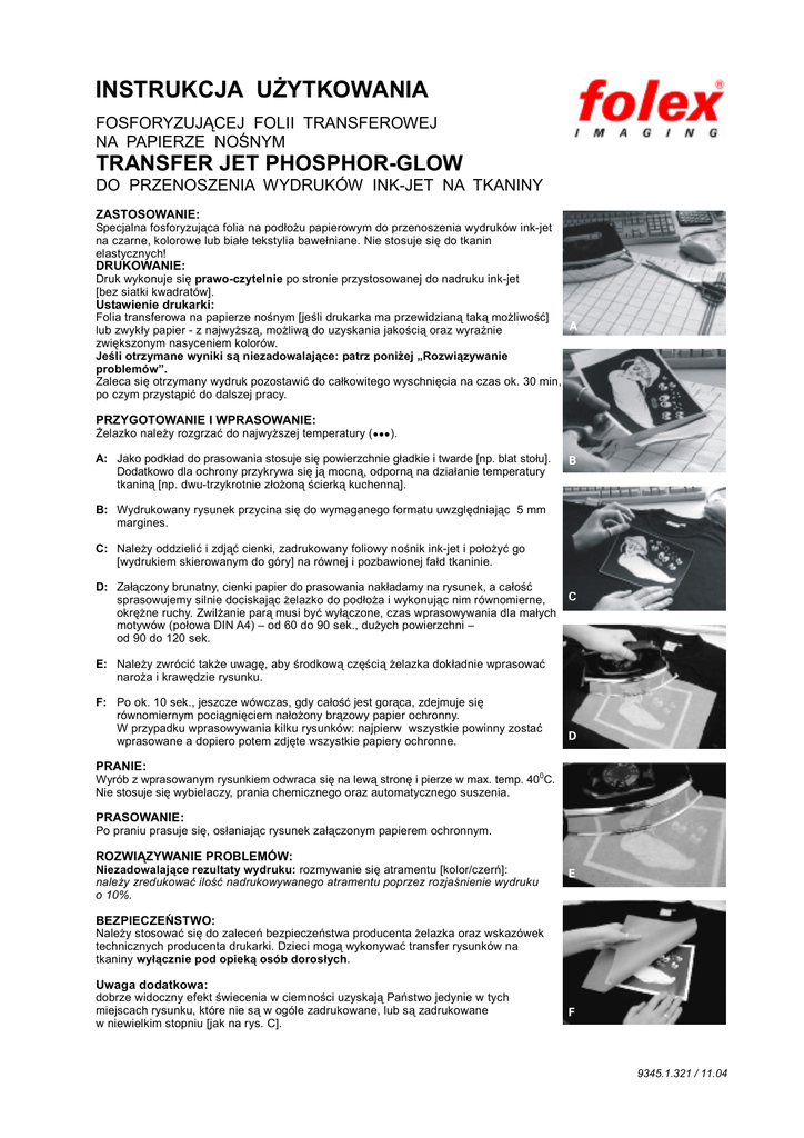 INSTRUKCJA U YTKOWANIA FOSFORYZUJ CEJ FOLII TRANSFEROWEJ NA PAPIERZE NO NYM TRANSFER JET PHOSPHOR-GLOW DO PRZENOSZENIA WYDRUKÓW INK-JET NA TKANINY ZASTOSOWANIE: Specjalna fosforyzuj(ca folia na pod+o,u papierowym do przenoszenia wydruków ink-jet na czarne, kolorowe lub bia+e tekstylia bawe+niane. Nie stosuje si5 do tkanin elastycznych! DRUKOWANIE: Druk wykonuje si5 prawo-czytelnie po stronie przystosowanej do nadruku ink-jet [bez siatki kwadratów]. Ustawienie drukarki: Folia transferowa na papierze no:nym [je:li drukarka ma przewidzian( tak( mo,liwo:;] A lub zwyk+y papier - z najwy,sz(, mo,liw( do uzyskania jako:ci( oraz wyra<nie zwi5kszonym nasyceniem kolorów. Je+li otrzymane wyniki s- niezadowalaj-ce: patrz poni/ej „Rozwi-zywanie problemów”. Zaleca si5 otrzymany wydruk pozostawi; do ca+kowitego wyschni5cia na czas ok. 30 min, po czym przyst(pi; do dalszej pracy. PRZYGOTOWANIE I WPRASOWANIE: @elazko nale,y rozgrza; do najwy,szej temperatury (BBB). A: Jako podk+ad do prasowania stosuje si5 powierzchnie g+adkie i twarde [np. blat sto+u]. Dodatkowo dla ochrony przykrywa si5 j( mocn(, odporn( na dzia+anie temperatury tkanin( [np. dwu-trzykrotnie z+o,on( :cierk( kuchenn(]. B B: Wydrukowany rysunek przycina si5 do wymaganego formatu uwzgl5dniaj(c 5 mm margines. C: Nale,y oddzieli; i zdj(; cienki, zadrukowany foliowy no:nik ink-jet i po+o,y; go [wydrukiem skierowanym do góry] na równej i pozbawionej fa+d tkaninie. D: Za+(czony brunatny, cienki papier do prasowania nak+adamy na rysunek, a ca+o:; sprasowujemy silnie dociskaj(c ,elazko do pod+o,a i wykonuj(c nim równomierne, okr5,ne ruchy. Zwil,anie par( musi by; wy+(czone, czas wprasowywania dla ma+ych motywów (po+owa DIN A4) – od 60 do 90 sek., du,ych powierzchni – od 90 do 120 sek. C E: Nale,y zwróci; tak,e uwag5, aby :rodkow( cz5:ci( ,elazka dok+adnie wprasowa; naro,a i kraw5dzie rysunku. F: Po ok. 10 sek., jeszcze wówczas, gdy ca+o:; jest gor(ca, zdejmuje si5 równomiernym poci(gni5ciem na+o,ony br(zowy papier ochronny. W przypadku wprasowywania kilku rysunków: najpierw wszystkie powinny zosta; wprasowane a dopiero potem zdj5te wszystkie papiery ochronne. D PRANIE: Wyrób z wprasowanym rysunkiem odwraca si5 na lew( stron5 i pierze w max. temp. 400C. Nie stosuje si5 wybielaczy, prania chemicznego oraz automatycznego suszenia. PRASOWANIE: Po praniu prasuje si5, os+aniaj(c rysunek za+(czonym papierem ochronnym. ROZWI6ZYWANIE PROBLEMÓW: Niezadowalaj-ce rezultaty wydruku: rozmywanie si5 atramentu [kolor/czerN]: nale y zredukowa ilo nadrukowywanego atramentu poprzez rozja nienie wydruku o 10%. E BEZPIECZE9STWO: Nale,y stosowa; si5 do zaleceN bezpieczeNstwa producenta ,elazka oraz wskazówek technicznych producenta drukarki. Dzieci mog( wykonywa; transfer rysunków na tkaniny wy:-cznie pod opiek- osób doros:ych. Uwaga dodatkowa: dobrze widoczny efekt :wiecenia w ciemno:ci uzyskaj( PaNstwo jedynie w tych miejscach rysunku, które nie s( w ogóle zadrukowane, lub s( zadrukowane w niewielkim stopniu [jak na rys. C]. F 9345.1.321 / 11.04