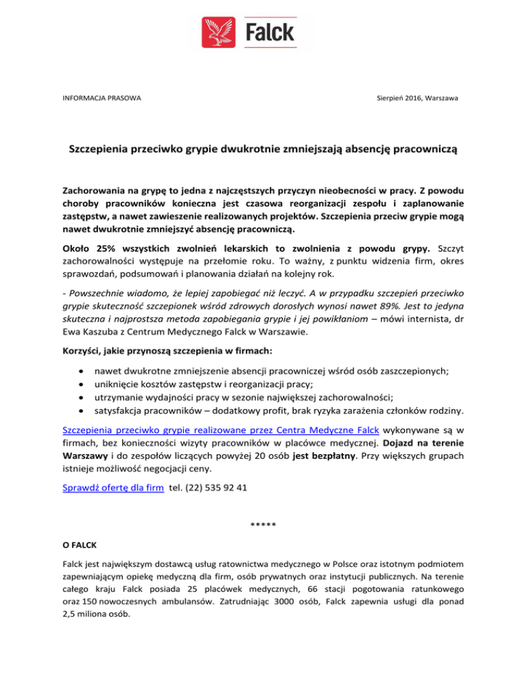 INFORMACJA PRASOWA Sierpień 2016, Warszawa Szczepienia przeciwko grypie dwukrotnie zmniejszają absencję pracowniczą Zachorowania na grypę to jedna z najczęstszych przyczyn nieobecności w pracy. Z powodu choroby pracowników konieczna jest czasowa reorganizacji zespołu i zaplanowanie zastępstw, a nawet zawieszenie realizowanych projektów. Szczepienia przeciw grypie mogą nawet dwukrotnie zmniejszyć absencję pracowniczą. Około 25% wszystkich zwolnień lekarskich to zwolnienia z powodu grypy. Szczyt zachorowalności występuje na przełomie roku. To ważny, z punktu widzenia firm, okres sprawozdań, podsumowań i planowania działań na kolejny rok. - Powszechnie wiadomo, że lepiej zapobiegać niż leczyć. A w przypadku szczepień przeciwko grypie skuteczność szczepionek wśród zdrowych dorosłych wynosi nawet 89%. Jest to jedyna skuteczna i najprostsza metoda zapobiegania grypie i jej powikłaniom – mówi internista, dr Ewa Kaszuba z Centrum Medycznego Falck w Warszawie. Korzyści, jakie przynoszą szczepienia w firmach: nawet dwukrotne zmniejszenie absencji pracowniczej wśród osób zaszczepionych; uniknięcie kosztów zastępstw i reorganizacji pracy; utrzymanie wydajności pracy w sezonie największej zachorowalności; satysfakcja pracowników – dodatkowy profit, brak ryzyka zarażenia członków rodziny. Szczepienia przeciwko grypie realizowane przez Centra Medyczne Falck wykonywane są w firmach, bez konieczności wizyty pracowników w placówce medycznej. Dojazd na terenie Warszawy i do zespołów liczących powyżej 20 osób jest bezpłatny. Przy większych grupach istnieje możliwość negocjacji ceny. Sprawdź ofertę dla firm tel. (22) 535 92 41 ***** O FALCK Falck jest największym dostawcą usług ratownictwa medycznego w Polsce oraz istotnym podmiotem zapewniającym opiekę medyczną dla firm, osób prywatnych oraz instytucji publicznych. Na terenie całego kraju Falck posiada 25 placówek medycznych, 66 stacji pogotowania ratunkowego oraz 150 nowoczesnych ambulansów. Zatrudniając 3000 osób, Falck zapewnia usługi dla ponad 2,5 miliona osób. Działalność operacyjna spółki podzielona jest na dwie części: ratownictwo medyczne oraz nowoczesna opieka medyczna. Więcej informacji na stronie www.falck.pl Kontakt dla mediów: Marta Bujakiewicz Neuron Agencja Public Relations e: [email protected] t: 664 125 433