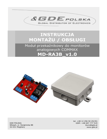 INSTRUKCJA MONTAŻU / OBSŁUGI Moduł przekaźnikowy do monitorów analogowych COMMAX MD-RA3B_v1.0 GDE POLSKA Włosań, ul. Świątnicka 88 32-031 Mogilany tel. +48 12 256 50 25(35) GSM: +48 697 777 519 [email protected] www.gde.pl MD-RA-3B UWAGA! Niniejsza instrukcja powinna być przeczytana przed montażem. Moduł Przekaźnikowy MD-RA3B Przeznaczenie Moduł przekaźnikowy MD-RA3B przeznaczony jest do stosowania w instalacjach niskonapięciowych. Umożliwia sterowanie dodatkowymi urządzeniami za pomocą przycisków wbudowanych w monitory COMMAX. Współpracuje prawidłowo z większością monitorów analogowych COMMAX serii CDV-xxx, CMV-xxx, DPV-xxx (dla monitorów CDV-70UX dedykowany moduł MD-RA1X). Przy odpowiednim podłączeniu moduł może być stosowany zamiennie z poprzednimi wersjami czyli MD-RA1, MD-RA4. Moduł może być stosowany do sterowania urządzeniami o max poborze do 3A (nie zależnie od opisu na przekaźnikach), zapewnia separację galwaniczną obwodu sterującego od wykonawczych (przekaźniki). Zaleca się załączanie/sterowanie tylko obwodami o napięciu bezpiecznym (nie zależnie od opisu na przekaźnikach). Do załączania/sterowania urządzeniami o wyższym napięciu i/lub prądzie należy stosować dodatkowe zewnętrzne układy przekaźnikowe/stycznikowe - odpowiednio dobrane do parametrów odbiorników. W moduł został wbudowany układ uaktywniający dodatkowe wejście w monitorach (KAM2) generujący czarny ekran oraz 2 oddzielne układy czasowe przekaźnikowe (1-30s) wyzwalane w tym samym czasie. Opis wyprowadzeń -2- MD-RA-3B Montaż Moduł dostarczany jest w puszce elektrycznej natynkowej IP44 lub więcej (zalecana gdy układ narażony jest na uszkodzenia typu zapylenie i wilgoć). Układ (płytka z elektroniką) umożliwia przykręcenie (unieruchomienie) w dostarczonej obudowie, wkręt mocujący znajduje się w zestawie. Należy unikać montażu w pobliżu urządzeń i przewodów elektrycznych mogących zakłócać prawidłową pracę modułu (np. silniki, napędy, przetwornice napięć, agregaty itp.) Moduł może zwiększyć funkcjonalność monitorów COMMAX (sterowanie bramami, oświetleniem), może być wyzwalany zewnętrznymi przyciskami lub sygnałem z monitorów oraz jako uniwersalny układ czasowy z dwoma oddzielnymi przekaźnikami sterowany napięciowo (np. podtrzymanie obwodu elektrozaczepu). Funkcjonalność i przykładowe zastosowanie modułu opisano w poniższych przykładach. Po poprawnym podłączeniu wg dowolnego schematu poniżej należy odłączyć i ponownie załączyć zasilanie wszystkich monitorów w systemie. Test Moduł przekaźnikowy można przed zamontowaniem przetestować (w takim trybie układ może też normalnie działać), schemat podłączenia poniżej: -podłączamy napięcie zasilania, dioda „DZ” powinna świecić, odczekać kilka sekund, układ przechodzi w tryb czuwania -załączyć dowolny „SW” na 2-5s układ powinien zareagować czyli załączyć D1 oraz D2 jednocześnie powinny zadziałać obwody przekaźnikowe, czas podtrzymania przekaźników jest regulowany przez PR1 oraz PR2 -po zakończeniu czasu podtrzymania przekaźników diody D1 oraz D2 są wyłączone, układ przechodzi w tryb ponownego czuwania. -3- MD-RA-3B Przykłady zastosowań, schemat 1.0 Typowe podłączenie jeśli instalacja zawiera monitor 1szt + kamera 1szt (wykorzystany jeden przekaźnik) -4- MD-RA-3B Przykłady zastosowań, schemat 1.1 Typowe podłączenie jeśli instalacja zawiera monitor 1szt + kamera 1szt (wykorzystane dwa przekaźniki) -5- MD-RA-3B Przykłady zastosowań, schemat 1.2 Podłączenie jeśli instalacja zawiera monitor 1szt + kamera 1szt , dodatkowo ustawiany czas podtrzymania elektrozaczepu oraz przycisk wyjścia -6- MD-RA-3B Przykłady zastosowań, schemat 1.3 Sterowanie dwoma bramami + furtka -7- MD-RA-3B Przykłady zastosowań, schemat 2 Sterowanie dwoma bramami oraz funkcja interkomu, kamera 1 przyciskowa + 2 monitory (monitory muszą posiadać funkcję interkomu monitor-monitor) -8- MD-RA-3B Przykłady zastosowań, schemat 3 Sterowanie bramą, kamera dwu abonentowa (DRC-2UC) Zaleca się zasilanie modułu i kamery z tego samego zasilacza (zmniejsza to możliwość przypadkowego uruchamiania napędu bramy podczas awarii zasilania- włączanie/wyłączanie monitora bezpośrednio z sieci 230V) -9- MD-RA-3B Przykłady zastosowań, schemat 4 Sterowanie bramą, 2 monitory z funkcją interkomu, kamera jedno abonentowi - 10 - MD-RA-3B Przykłady zastosowań, schemat 5 Sterowanie bramą-widok z kamery CCTV, funkcja interkomu - 11 - MD-RA-3B Przykłady zastosowań, schemat 6 Sterowanie bramą, Sterowanie bramą, kamera „n” abonentowa - 12 - MD-RA-3B Przykłady zastosowań, schemat 7 Sterowanie 2 bramami + 1 furtką - 13 - MD-RA-3B Przykłady zastosowań, schemat 8 Sterowanie 3 bramami + 1 furtką + funkcja interkomu - 14 - MD-RA-3B Opis działania wg schematu 8 -aby otworzyć furtkę (elektrozaczep) musi być aktywne AUDIO i VIDEO z KAMERY 2 (aktywacja funkcji przez przycisk “KLUCZ”) -aby otworzyć BRAMĘ 1 musi być aktywne AUDIO i VIDEO z KAMERY 1 (aktywacja funkcji przez przycisk “INTERKOM”) -aby otworzyć BRAMĘ 2 musi być aktywne AUDIO i VIDEO z KAMERY 2 (aktywacja funkcji przez przycisk “INTERKOM”) -aby otworzyć BRAMĘ 3 musi być aktywne AUDIO i VIDEO z KAMERY 1 (aktywacja funkcji przez przycisk “KLUCZ”) Jeśli nie jest aktywny podgląd z KAM1 lub z KAM2 na dowolnym monitorze uaktywnienie przycisku “INTERKOM” załącza funkcję monitorami (ale nie otwiera żadnej bramy). interkomu pomiędzy Dane techniczne Zasilanie Pobór prądu (max) Napięcie sterujące Obciążalność obwodów wykonawczych (max) Zalecana temperatura pracy Wymiary (mm) Waga 12V (11-14V) z monitorów COMMAX lub zasilacza czuwanie 5mA, praca 200mA 6-12VDC + sygnał modulowany z monitora 3A 50VAC -10ºC ~ +40ºC Płytka z elektroniką 55x50 Obudowa natynkowa zatrzaskowa 75x75x38 W zależności od wersji sama płytka z elektr