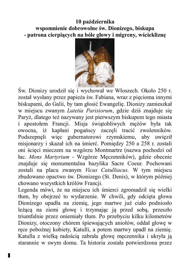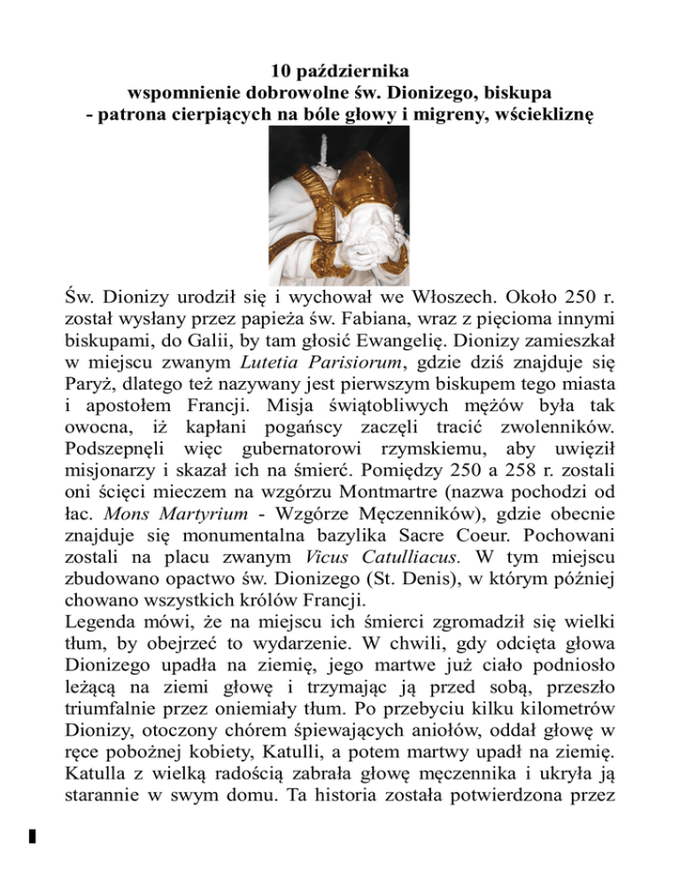 10 października wspomnienie dobrowolne św. Dionizego, biskupa - patrona cierpiących na bóle głowy i migreny, wściekliznę Św. Dionizy urodził się i wychował we Włoszech. Około 250 r. został wysłany przez papieża św. Fabiana, wraz z pięcioma innymi biskupami, do Galii, by tam głosić Ewangelię. Dionizy zamieszkał w miejscu zwanym Lutetia Parisiorum, gdzie dziś znajduje się Paryż, dlatego też nazywany jest pierwszym biskupem tego miasta i apostołem Francji. Misja świątobliwych mężów była tak owocna, iż kapłani pogańscy zaczęli tracić zwolenników. Podszepnęli więc gubernatorowi rzymskiemu, aby uwięził misjonarzy i skazał ich na śmierć. Pomiędzy 250 a 258 r. zostali oni ścięci mieczem na wzgórzu Montmartre (nazwa pochodzi od łac. Mons Martyrium - Wzgórze Męczenników), gdzie obecnie znajduje się monumentalna bazylika Sacre Coeur. Pochowani zostali na placu zwanym Vicus Catulliacus. W tym miejscu zbudowano opactwo św. Dionizego (St. Denis), w którym później chowano wszystkich królów Francji. Legenda mówi, że na miejscu ich śmierci zgromadził się wielki tłum, by obejrzeć to wydarzenie. W chwili, gdy odcięta głowa Dionizego upadła na ziemię, jego martwe już ciało podniosło leżącą na ziemi głowę i trzymając ją przed sobą, przeszło triumfalnie przez oniemiały tłum. Po przebyciu kilku kilometrów Dionizy, otoczony chórem śpiewających aniołów, oddał głowę w ręce pobożnej kobiety, Katulli, a potem martwy upadł na ziemię. Katulla z wielką radością zabrała głowę męczennika i ukryła ją starannie w swym domu. Ta historia została potwierdzona przez 1 wielu świadków. Św. Dionizy należy do tzw. Czternastu Świętych Wspomożycieli. W ikonografii atrybutami św. Dionizego są łańcuch i kajdany, mitra, ścięta głowa trzymana w rękach. Modlitwy do św. Dionizego: Boże, Ty wysłałeś świętego Dionizego i jego Towarzyszy, aby głosili poganom Twoją Ewangelię, i dałeś im niewzruszoną stałość w męczeństwie, spraw, abyśmy za ich przykładem mądrze oceniali doczesne powodzenie i nie bali się żadnych przeciwności. Amen. Litania do Świętych Czternastu Wspomożycieli Kyrie elejson, Chryste elejson, Kyrie elejson. Chryste usłysz nas, Chryste wysłuchaj nas. Ojcze z nieba Boże, zmiłuj się nad nami. Synu Odkupicielu świata Boże, zmiłuj się nad nami. Duchu Święty Boże, zmiłuj się nad nami. Święta Trójco jedyny Boże, zmiłuj się nad nami. Święta Maryjo, módl się za nami. Święty Józefie, Pocieszycielu wszystkich strapionych i w nędzy będących, módl się za nami. Święty Michale, wielki Patronie konających, Wszyscy święci Aniołowie Stróżowie i wszystkie Chóry anielskie, módlcie się za nami. Wszyscy święci Patriarchowie i Prorocy, Wszyscy święci Apostołowie i Ewangeliści, Wszyscy święci Męczennicy i Wyznawcy, Wszyscy święci Biskupi i Doktorzy Kościoła, Wszyscy święci Kapłani i Diakoni, Wszyscy święci Zakonnicy i Pustelnicy, Wszystkie święte Dziewice i Wdowy, Wszyscy święci wybrani Wspomożyciele, Święty Jerzy , Rycerzu wiary, bohaterze cnoty, módl się za nami, Święty Błażeju, ozdobo stanu kapłańskiego i miłosierny Ojcze ubogich, Święty Erazmie, wielki miłośniku Boga, 2 Święty Pantaleonie, cudowny lekarzu chorych, Święty Wicie, szczególny Patronie anielskiej cnoty, Święty Krzysztofie, Patronie podróżujących, Święty Dionizy, światłości uczonych, Święty Cyriaku, postrachu duchów piekielnych, Święty Achacy, wielki czcicielu krzyża Chrystusowego, Święty Eustachy, wzorze chrześcijańskiej cierpliwości, Święty Idzi, patronie pustelników, Święta Małgorzato, pogromcicielko szatana, Święta Barbaro, patronko konających, Święta Katarzyno, patronko chrześcijańskiej nauki, Wszyscy Święci i Wybrani Pańscy, módlcie się za nami, Bądź nam miłościw, przepuść nam Panie. Bądź nam miłościw, wysłuchaj nas Panie. Od wszelkiego złego, wybaw nas Panie. Od grzechu każdego, Od gniewu Twego, Od powietrza, głodu, ognia i wojny, Od piorunów i gwałtownej niepogody, Od nagłej a niespodziewanej śmierci, Od potępienia wiekuistego, Przez świętą Tajemnicę Wcielenia Twego, Przez zasługi Najświętszej Panny, Przez zasługi i mękę Czternastu Świętych Wspomożycieli, W dzień sądu Twego, My grzeszni Ciebie prosimy, wysłuchaj nas. Abyś nam grzechy nasze przepuścić raczył, prosimy Cię, Abyś nas do prawdziwej pokuty doprowadzić raczył, Abyś nas za przyczyną Czternastu Świętych Wspomożycieli we wszelakich potrzebach wysłuchać raczył, Abyś za przyczyną św. Jerzego wiarę naszą pomnożyć raczył, Abyś za przyczyną św. Błażeja naszą nadzieję umocnić raczył, Abyś za przyczyną św. Erazma miłość Boga w nas zapalić raczył, Abyś za przyczyną św. Pantaleona w serca nasze miłość ku bliźnim wlać raczył, Abyś za przyczyną św. Wita duszę naszą szatą godową łaski poświęcającej przyozdobić raczył, 3 Abyś za przyczyną św. Katarzyny od grzechu wszelkiego ochronić raczył, Abyś nam za przyczyną św. Dionizego pokój sumienia dać raczył, Abyśmy za przyczyną św. Cyriaka wolę Twoją Przenajświętszą chętnie wypełniali, Abyś nam za przyczyną św. Achacego śmierć szczęśliwą dać raczył, Abyś nam za przyczyną św. Euchstazego świętej cnoty cierpliwości udzielić raczył, Abyś nam za przyczyną św. Idziego w dzień Sądu Ostatecznego miłosiernym być raczył, Abyś nas za przyczyną św. Małgorzaty Dziewicy i męczennicy od ognia piekielnego zachować raczył, Abyś nam za przyczyną św. Barbary, Dziewicy i męczennicy, łaski św. Sakramentu przed śmiercią udzielić raczył, Abyś nam za przyczyną św. Katarzyny, Dziewicy i męczennicy, utrapienia osładzać i do radości niebieskich dopuścić raczył, Jezu Synu Boga żywego, Baranku Boży, który gładzisz grzechy świata, przepuść nam Panie! Baranku Boży, który 