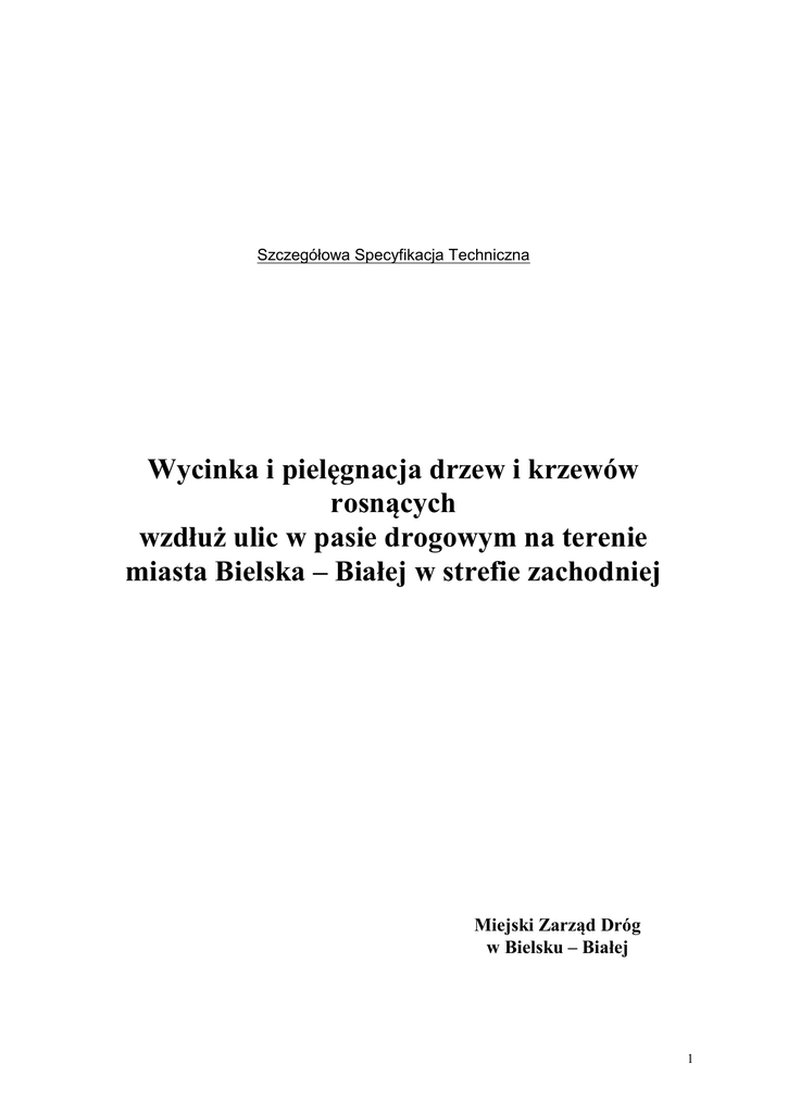 Szczegółowa Specyfikacja Techniczna Wycinka i pielęgnacja drzew i krzewów rosnących wzdłuż ulic w pasie drogowym na terenie miasta Bielska – Białej w strefie zachodniej Miejski Zarząd Dróg w Bielsku – Białej 1 Oznaczenie sprawy SZCZEGÓŁOWA SPECYFIKACJA TECHNICZNA _____________________________________________________________________________ Obejmująca podstawowy zakres prac w zakresie wycinki i pielęgnacji drzew i krzewów rosnących wzdłuż ulic w pasie drogowym na terenie miasta Bielska-Białej w strefie zachodniej. _________________________________________________________________________________________________________ I. Przedmiot zamówienia I.1 Przedmiotem zamówienia jest prowadzenie prac z zakresu wycinki i pielęgnacji drzew i krzewów rosnących wzdłuż ulic na terenie miasta Bielska-Białej w strefie zachodniej. W skład zakresu wchodzą drzewa i krzewy rosnące w pasie drogowym na zachód od rzeki Białej do granic administracyjnych miasta Bielska-Białej. I.2 Zakres prac : Ustalenia zawarte w niniejszej specyfikacji dotyczą zasad prowadzenia prac związanych z wycinką i pielęgnacją drzew i krzewów. Szczegółowo zakres prac określa pkt. III niniejszej specyfikacji / Opis Prac / II. Realizacja prac II.1 Zlecanie prac przez Zamawiającego Wykonawca przystępuje do realizacji prac na podstawie wystawianych przez Zamawiającego zleceń cząstkowych które określają : - szczegółową lokalizację prac - zakres prac do wykonania - orientacyjną wartość prac - termin zakończenia prac - osobę odpowiedzialną ze strony Zamawiającego za należyte i kompleksowe wykonanie (w tym rozliczenie) niniejszej umowy - uwagi dodatkowe dotyczące sposobu realizacji Wzór zlecenia stanowi załącznik nr 1 do niniejszej specyfikacji. Wykonawca ma obowiązek wyznaczenia ze swej strony osoby lub osób upoważnionych do kontaktów z właściwymi służbami Zamawiającego i odbierania zleceń. Wymieniona w ofercie upoważniona osoba(by) ma obowiązek kontaktowania się z Zamawiającym o ustalonej przez Inspektora MZD terminie celem : - odebrania zleceń - udzielenia informacji o aktualnie prowadzonych w danym dniu pracach - zgłaszania wykonanych prac do odbioru Odbiór zlecenia osoba upoważniona kwitowała będzie na kopii zlecenia własnym podpisem wraz z datą odbioru. 2 II.2 Realizacja prac II.2.1. Przystąpienie do realizacji prac Wykonawca realizuje prace w zakresie określonym w zleceniu. Jeżeli w zleceniu określono ,,pilne” lub ( w przypadku awarii w pasie drogowym – powalenie drzewa, odłamanie konara itp. ) zlecenia udzielono ustnie ( telefonicznie ), Wykonawca ma obowiązek przystąpienia do docelowej realizacji prac nie później niż do 1 godziny od chwili jego otrzymania, w pozostałych przypadkach w terminie 3 dni od odebrania zlecenia. Wykonawca ponosi pełną odpowiedzialność za szkody i straty materialne powstałe na skutek nie podjęcia lub nie zakończenia prac w ustalonym terminie. II.2.2. Technologia Technologię wykonywania prac określa rozdz. III niniejszej specyfikacji /Opis Prac/. W przypadku realizacji prac nie ujętych w niniejszej specyfikacji technologia wykonania zostanie określona w zleceniu . Wykonawca ma obowiązek każdorazowego zabezpieczania terenu prac . Zabezpieczenia należy wykonywać zgodnie z obowiązującą Instrukcją Oznakowania Tymczasowego . II.2.3. Wymagania dotyczące sprzętu Wykonawca powinien posiadać następujący sprzęt do realizacji prac ( własny bądź dzierżawiony) sprzęt wymagany - własny - piły łańcuchowe 3szt. ( w tym 2szt. o mocy minimum 4 KM ) - frezarka do pni sprzęt wymagany własny lub dzierżawiony - środki transportu (samochód ciężarowy ) - rozdrabniacz do gałęzi - zwyżka II.2.4. Materiały Nie występują II.2.5. Dyspozycyjność Wykonawcy Wykonawca jest zobowiązany do wykonywania w sytuacjach awaryjnych koniecznych prac interwencyjnych . Przez sytuacje awaryjne rozumie się wszelkie nagle powstałe uszkodzenia drzew stwarzające realne zagrożenie dla ludzi i mienia oraz ruchu drogowego a także powstałe w wyniku klęsk żywiołowych i poważnych zdarzeń drogowych. Przez prace interwencyjne rozumie się wszelkie podejmowane działania w zakresie oznakowania tymczasowego, odcinania złamanych konarów lub usuwania powalonych drzew na pas drogowy w zakresie zapewniającym bezpieczeństwo dla uczestników ruchu. Powyższe dotyczy głównie zdarzeń powstałych po godzinach pracy lub w dni wolne od pracy. Wykonawca jest zobowiązany do przedłożenia Zamawiającemu informacji o wytypowanym pracowniku wraz z numerem telefonu, który będzie miał obowiązek przyjmowania zgłoszeń o powstałych sytuacjach awaryjnych po godzinach pracy oraz w dni wolne od pracy i niezwłocznej realizacji koniecznych prac. Przedłożone informacje o osobie pracownika oraz numerze telefonu mogą zmieniać się w ciągu trwania umowy jednakże w takich przypadkach Wykonawca ma obowiązek wcześniejszego powiadomienia o tym Zamawiającego w formie pisemnej. 3 II.3. Uprawnienia Pracownicy obsługujący piły łańcuchowe zobowiązani są do posiadania uprawnień pilarza. Pracownicy pracujący w koronach drzew zobowiązani są do posiadania dodatkowo uprawnień wysokościowych. Wykonawca zobowiązany jest do posiadania uprawnień konserwatora zabytków do wykonywania pielęgnacji drzew rosnących w strefie objętej ochroną konserwatorską. Uwaga – wymagana ilość pracowników - minimum 4 osoby - pracownicy powinni posiadać ubezpieczenie NW. II.4. Pomiary i pojęcia Średnica pnia przy frezowaniu powinna być mierzona na wysokości szyi korzeniowej. Średnica pnia przy zabiegach pielęgnacyjnych i wycince drzew powinna być mierzona na wysokości 1,3 m. Pod pojęciem prześwietlenia rozumie się usunięcie gałęzi w koronie do 30 % masy korony zachowując naturalny pokrój korony dla danego gatunku. Pod pojęciem redukcji rozumie się: a – redukcja wysokości korony drzewa o 1/3 b – redukc