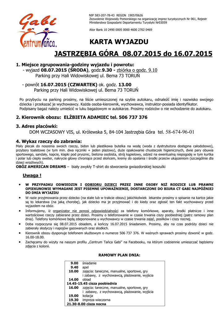 NIP 583-207-78-43 REGON 190570626 Zezwolenie Wojewody Pomorskiego na organizację imprez turystycznych Nr 061, Rejestr Ministerstwa Gospodarki Departamentu Turystyki Nr03059 Alior Bank 10 2490 0005 0000 4600 2702 0469 KARTA WYJAZDU JASTRZĘBIA GÓRA 08.07.2015 do 16.07.2015 1. Miejsce zgrupowania-godziny wyjazdu i powrotu: - wyjazd 08.07.2015 (ŚRODA), godz.9.30 - zbiórka o godz. 9.10 Parking przy Hali Widowiskowej ul. Bema 73 TORUŃ - powrót 16.07.2015 (CZWARTEK) ok. godz. 13.00 Parking przy Hali Widowiskowej ul. Bema 73 TORUŃ Po przybyciu na parking prosimy, na liście umieszczonej na szybie autokaru, odnaleźć imię i nazwisko swojego dziecka i przekazać je wychowawcy. Każda osoba-kierownik, wychowawca, instruktor-posiada identyfikator. Podpisany bagaż należy umieścić w luku bagażowym w autokarze. Prosimy rodziców o nie wchodzenie do autokaru. 2. Kierownik obozu: ELŻBIETA ADAMIEC tel. 506 737 376 3. Adres placówki: DOM WCZASOWY VIS, ul. Królewska 5, 84-104 Jastrzębia Góra tel. 58-674-96-01 4. Wykaz rzeczy do zabrania: Mały plecak do noszenia swoich rzeczy, bidon lub plastikowa butelka na wodę (woda z dystrybutora dostępna całodobowo), przybory toaletowe (w tym min. dwa ręczniki + jeden plażowy), duże opakowanie chusteczek higienicznych, dwie pary obuwia sportowego, sandały, kapcie, klapki pod prysznic, bielizna osobista, strój kąpielowy, odzież na ewentualną niepogodę w tym kurtka i polar lub ciepły sweter, nakrycie głowy chroniące przed słońcem, kremy do opalania i środki przeciw ukąszeniom (szczególnie dla dzieci wrażliwych). OBÓZ AMERICAN DREAMS – biały zwykły T-shirt do stworzenia gwiazdorskiej koszulki Uwaga ! ● ● ● ● ● ● W PRZYPADKU ODWIEDZIN I ODBIORU DZIECI PRZEZ INNE OSOBY NIŻ RODZICE LUB PRAWNI OPIEKUNOWIE WYMAGANE JEST PISEMNE UPOWAŻNIENIE, DOSTARCZONE DO BIURA CT GABI NAJPÓŹNIEJ DO DNIA WYJAZDU W razie przyjmowania przez dziecko (na stałe lub w trakcie obozu) jakichkolwiek lekarstw prosimy o spisanie na kartce jakie są to lekarstwa (na jaką chorobę), jak dziecko ma je przyjmować i do kiedy oraz zgłosić ten fakt wychowawcy przed wyjazdem na obóz. Informujemy, iż organizator nie ponosi odpowiedzialności za telefony komórkowe, aparaty, środki płatnicze i inne wartościowe rzeczy zabierane przez dzieci. Prosimy o telefonowanie w czasie trwania ciszy poobiedniej (patrz ramowy plan dnia). Telefony komórkowe będą zdeponowane u wychowawcy w czasie trwania zajęć, posiłków i ciszy nocnej. Doba rozpoczyna się 08.07.2015 obiadem, a kończy 16.07.2015 śniadaniem. Prosimy, aby na czas podróży dzieci nie zabierały słodyczy i napojów gazowanych oraz słodkich. Kierownik obozu dysponuje telefonem służbowym o numerze 506 737 376. W ważnych sprawach prosimy dzwonić w godz. 16.00-18.00. Zachęcamy do wizyty na naszym profilu „Centrum Tańca Gabi” na Facebooku, na którym codziennie umieszczać będziemy zdjęcia z kolonii. RAMOWY PLAN DNIA: śniadanie apel zajęcia: taneczne, manualne, sportowe, gry i zabawy, z wychowawcą, plażowanie, wyjścia 14.00 obiad 14.45-15.45 cisza poobiednia 16.00 zajęcia: taneczne, manualne, sportowe, gry i zabawy, z wychowawcą, plażowanie, wyjścia 19.00 kolacja 19.30 impreza wieczorna 21.30-8.00 cisza nocna 9.00 9.40 10.00