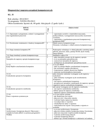 Diagnostyka i naprawa urządzeń komputerowych KL. II DZIAŁ Temat Czas Rok szkolny: 2014/2015 Nr programu: TI/PZS1/PG/2012 Okres kształcenia: łącznie ok. 60 godz. lekcyjnych (2 godz./tydz.) 1-2. Zapoznanie z programem, celami i wymaganiami oraz regulaminem pracowni 2 3-4. Powtórzenie wiadomości z budowy komputeraPC 2 5-6. Etapy montażu komputera PC 2 7-8. Etapy instalacji systemu komputerowego 9-10. Narzędzia do naprawy sprzętu komputerowego 2 2 11-12. Kody błędów uruchamiania komputera 2 13-14. Uszkodzenia sprzętowe komputera 2 15-16. Uszkodzenia sprzętowe notebooka 2 17-18. Praca z rejestrem systemowym 2 19-20. Archiwizacja i kompresja danych. Pakowanie i rozpakowywanie plików za pomocą programów – WinRar 2 Zakres treści - zapoznanie uczniów z materiałem nauczania, podręcznikiem, wymaganiami nauczyciela, kryteriami oceniania, - zapoznanie z regulaminem pracowni komputerowej, przepisami BHP Skład zestawu komputerowego. Elementy wchodzące w skład zestawu komputerowego Podzespoły wchodzące w skład jednostki centralnej (płyta główna, procesor, karty, pamięć RAM, dysk twardy, stacje dysków, Instalacja z płyty CD - jakie narzędzia stosuje się do naprawy sprzętu - co to są narzędzia specjalistyczne - zastosować narzędzia do naprawy - posługiwać się narzędziami specjalistycznymi co to jest BIOS - jakie są rodzaje błędów uruchamiania komputera - jak rozróżniać sygnały dźwiękowe - rozpoznawać sygnały akustyczne błędów - stosować się do przepływu sterowania jakie elementy zamienne wymagane są do naprawy uszkodzeń - jakie elementy wymagane są do uruchomienia komputera - zna typowe uszkodzenia komputera - przygotować narzędzia i podzespoły do naprawy sprzętu -naprawić typowe uszkodzenia komputera jaki sprzęt wymagany jest do naprawy notebooka - zna typowe uszkodzenia notebooka -dobrać sprzęt do naprawy notebooka - naprawić typowe uszkodzenia notebooka co to jest rejestr systemu - jak zbudowany jest rejestr - jaka jest role i znaczenie rejestru - wykonać kopię zapasową rejestru - wyszukać dane w rejestrze - zmodyfikować dane w rejestrze - zoptymalizować rejestr i korzystanie z rejestru w systemie - co to jest archiwizacja i kompresja - jaka jest różnica między kompresją stratną i bezstratną - jakie jest znaczenie współczynnika kompresji - wykonać archiwizację danych - wykonać kompresję danych - dobrać typ i format kompresji w zależności od zadania 1 Czas DZIAŁ Temat Zakres treści 21-22 Rodzaje kopii zapasowych i ich cechy. Metody zapisu plików na nośnikach 2 - jakie są typów kopii zapasowych - jakie są strategie tworzenia kopii zapasowych - jakie urządzenia są przeznaczone do tworzenia kopii zapasowych - jakie są zasady bezpiecznego posługiwania się danymi - jakie są różnice między rodzajami kopii zapasowych - na czym polegają strategie tworzenia kopii zapasowych - jak przebiega procedura tworzenia kopii zapasowych zbiorów lokalnych stworzyć kopię zapasową danych - wybrać pliki i foldery, dla których należy wykonać kopię zapasową - jak przebiega procedura odtwarzania danych z kopii zapasowych i przywracania systemu 23-24. Tworzenie kopii zapasowej systemu 2 25-26. Przywracanie systemu i danych z kopii zapasowej 2 27-28. Instalowanie i obsługa programów diagnostycznych i monitorujących pracę systemu 2 - co to jest oprogramowanie diagnostyczne i oprogramowanie monitorujące - jaka jest różnica między oprogramowaniem diagnostycznym i oprogramowaniem monitorującym - zainstalować oprogramowanie diagnostyczne i monitorujące pracę systemu 29-30. Rodzaje i zasady działania wirusów komputerowych Usuwanie wirusów 2 31-32. Instalacja i konfiguracja programów antywirusowych i antyspyware 2 33-34. Włączanie aktualizacji systemu 2 35-36. Naprawa błędów związanych z uruchamianiem programów 2 37-38. Procedury naprawy błędów na dysku 2 39-40. Procedury naprawy aplikacji 2 jakie są rodzaje „niechcianego oprogramowania” - jakie są różnice pomiędzy rodzajami „niechcianego oprogramowania” - jakie są fazy działania wirusa komputerowego - jakie są metody dołączania się wirusa do nosiciela - zainstalować program antywirusowy i antyspyware - zaktualizować program antywirusowy i antyspyware - usunąć wirusy i inne rodzaje „niechcianego oprogramowania” przy pomocy programu antywirusowego - co to jest aktualizacja systemu - jaka jest rola aktualizacji sytemu i jej wpływ na bezpieczeństwo - wykonać aktualizację systemu - włączyć automatyczną aktualizację systemu - zaplanować proces aktualizacji systemów w firmie - tworzyć skróty do plików, folderów, aplikacji i lokalizacji sieciowych - uruchamiać aplikacje z prawami administratora - uruchamiać aplikacje w trybie zgodności - zidentyfikować w systemie procesy wymagające określonego poziomu priorytetu - wykonać skanowanie dysku i naprawę błędów - wykonać defragmentację dysku - wykonać oczyszczanie dysku ze zbędnych plików - zaplanować wykonanie procedur naprawy błędów na dysku - wykonać aktualizację aplikacji - zainstalować i odinstalować wtyczki w przeglądarce - zainstalować obsługę języka Java w systemie - zainstalować przeglądarkę dokumentów pdf w systemie - przypisać aplikację, za pomocą której będą uruchamiane pliki z określonym rozszerzeniem 2 Czas DZIAŁ Temat Zakres treści 41-42. Uszkodzenia urządzeń peryferyjnych 2 - naprawić typowe uszkodzenia urządzeń peryferyjnych - zapobiegać występowaniu uszkodzeń 43-44. Harmonogram naprawy 2 - wykonać przegląd sprzętu - przeprowadzić wywiad na temat uszkodzenia 45-46. Testowanie i diagnostyka komputerów 2 47-48. Odzyskiwanie utraconych danych 2 49-50. Wskazania dla użytkownika po naprawie 2 - testować komputery - posługiwać się oprogramowaniem do testowania komputerów - posługiwać się oprogramowaniem do odzyskiwania danych - odzyskiwać utracone dane - jakich zasad należy przestrzeg