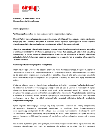 Warszawa, 26 października 2013 II Forum Importu Równoległego Informacja prasowa Polskiego społeczeństwa nie stać na ignorowanie importu równoległego Mimo iż Polacy zarabiają zdecydowanie mniej, muszą płacić za leki innowacyjne więcej niż Niemcy, Brytyjczycy czy Duńczycy. Wszystko z powodu braku regulacji stymulujących rozwój importu równoległego, który Europejczykom przynosi rocznie miliardy Euro oszczędności. Obecnie o dystrybucji równoległej (import i eksport równoległy) rozmawia się przede wszystkim w kontekście niedoborów produktów leczniczych na rynku. Tymczasem, jak udowodnili uczestnicy tegorocznego II Forum Importu Równoległego - dzieje się tak niesłusznie, a handel równoległy potrzebuje dziś dodatkowego wsparcia ustawodawcy, by rozwijać się z korzyścią dla pacjentów i budżetu państwa. Nie ma importu równoległego bez oszczędności Import równoległy w Polsce to obecnie około 1% rynku farmaceutycznego. Pacjentom, szpitalom i NFZ przynosi oszczędności na poziomie ponad 100 mln złotych rocznie. Jeśli ustawodawca przychyli się do postulatów importerów równoległych i potraktuje import jako pełnoprawnego uczestnika rynku farmaceutycznego oszczędności dla pacjentów i wpływy do kasy NFZ Będą wielokrotnie wyższe. Większość leków z importu równoległego podlegała do końca 2011 roku tzw. "refundacji ułomnej" na podstawie ówcześnie obowiązującego przepisu art. 38 ust. 5 ustawy o świadczeniach opieki zdrowotnej finansowanych ze środków publicznych, który pozwalał wydać lek tańszy niż ten przepisany na recepcie, nawet jeśli lek ten nie znajdował się na wykazie. Przepis ten został pominięty w ustawie o refundacji leków, środków spożywczych specjalnego przeznaczenia oraz wyrobów medycznych, co z dnia na dzień uniemożliwiło sprzedaż dziesiątek tańszych produktów z importu równoległego. Rynek importu równoległego cechuje się dużą dynamiką zarówno od strony zaopatrzenia, jak i sprzedaży. Importerzy równolegli poddawani są naciskom firm farmaceutycznych, które ograniczają dostępność źródeł zakupu (np. poprzez wprowadzenie "podwójnych cen", czy stosowania modelu dystrybucji bezpośredniej do aptek) oraz wpływają na rynek sprzedaży poprzez stosowane wybiórczych tymczasowych obniżek cen na leki podlegające konkurencji ze strony importu. Tak znaczna dynamika rynku oraz polityka producentów często uniemożliwia wprowadzenie leku z importu równoległego na rynek po dopisaniu do wykazu w terminie 180 dni (ponieważ w praktyce oznaczać to może tak daleko idące zmiany rynkowe) oraz wykorzystanie naturalnej przewagi leków z importu, jaką jest okazja konkurowania w sposób najbardziej dynamiczny (tj. wykorzystując możliwości dostaw w okresie dostępności produktów w krajach zakupu). Proponowane przez dystrybutorów równoległych zmiany zmierzają do uproszczenia zasad wydawania decyzji refundacyjnych dla produktów z importu równoległego w celu maksymalizacji korzyści Narodowego Funduszu Zdrowia i pacjentów – powiedział podczas II Forum Importu Równoległego Tomasz Dzitko, Prezes Stowarzyszenia Importerów Równoległych Produktów Leczniczych. Zakres proponowanych zmian obejmuje: − − − − − brak zobowiązania importerów równoległych do zapewnienia ciągłości dostaw leków poprzez zrozumienie specyfiku importu równoległego jako sektora o ograniczonym dostępie produktów (importer nie jest producentem, jest dystrybutorem) automatyczny wpis na listę leków refundowanych bez negocjacji w cenie o 10% - 15% niższej od produktu referencyjnego obecnego na liście wprowadzenie mechanizmu wspierającego wydawanie leków z importu równoległego w aptekach (a nie jedynie przepisu nakładającego obowiązek informowania o tańszych odpowiednikach co stanowi przepis wspierający sprzedaż leków generycznych) skrócenie czasu oczekiwania na decyzję refundacyjną, uproszczenie procedury rozpatrywania wniosków i obniżenie opłaty za wniosek, co pozwoli wprowadzać na listy więcej tańszych produktów wycofanie się z proponowanego ograniczenia eksportu równoległego i arbitralnego wpisywania przez GIF leków na listę produktów z zakazem wywozu Podobne regulacje wspierające sprzedaż leków z importu równoległego istnieją w wielu krajach europejskich, znacznie bogatszych od Polski, której na obniżeniu wydatków na leki powinno zależeć zdecydowanie bardziej. W Wielkiej Brytanii obowiązuje system kontroli zysków, który zakłada ustalenie maksymalnych oraz minimalnych zysków dla firm bez różnicowania cen ze względu na wartość terapeutyczną leku. Apteki są tam pod dużą presja z racji rozbudowanego systemu dystrybucji bezpośredniej pokrywającego około 50% rynku. Zwrot kwoty refundacji aptece zależy od tego, czy w jej obrocie wskazany procent stanowią leki z importu równoległego i generyki. We Francji lek oceniany jest pod kątem wartości terapeutycznej oraz skuteczności klinicznej. Importerzy równolegli, podobnie jak producenci, muszą prowadzić negocjacje cenowe oferując zazwyczaj cenę sprzedaży w aptece niższą o 5% w stosunku do produktu referencyjnego. Dodatkowo oferują rabaty zakupowe kompensując w ten sposób sprzedaż tańszego produktu. W Niemczech apteka jest zobowiązana przez prawo do wygenerowania co najmniej 5% swojego obrotu tańszymi lekami z importu równoległego. Produkty te jednak muszą być o 15% tańsze od referencyjnych (lub 15€ gdy lek kosztuje powyżej 100€) gdy mają być wliczane do obowiązkowego obrotu. Na Łotwie cena w aptece niższa o 10% wymagana jest przez prawo. W Danii pacjent z kolei otrzymuje refundację do ceny produktu z importu. Jeśli chce otrzymać referencyjny musi z własnej kieszeni dopłacić różnicę. W Danii, Niemczech i Szwecji apteki mają obowiązek informować pacjentów o dostępności produktu z importu równoległego. W Holandii, Norwegii i Wielkiej Brytan