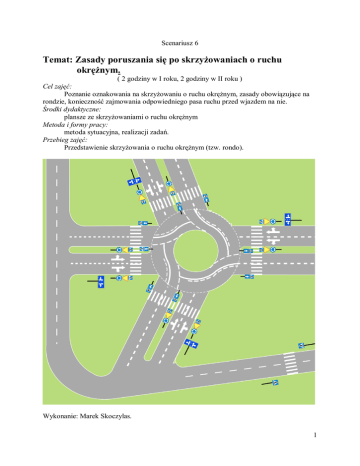 Scenariusz 6 Temat: Zasady poruszania się po skrzyżowaniach o ruchu okrężnym. ( 2 godziny w I roku, 2 godziny w II roku ) Cel zajęć: Poznanie oznakowania na skrzyżowaniu o ruchu okrężnym, zasady obowiązujące na rondzie, konieczność zajmowania odpowiedniego pasa ruchu przed wjazdem na nie. Środki dydaktyczne: plansze ze skrzyżowaniami o ruchu okrężnym Metoda i formy pracy: metoda sytuacyjna, realizacji zadań. Przebieg zajęć: Przedstawienie skrzyżowania o ruchu okrężnym (tzw. rondo). Wykonanie: Marek Skoczylas. 1 Wśród kierowców krąży błędne przekonanie, że przed wjazdem na rondo nie należy sygnalizować swojego kierunku jazdy, jedynie przy zjeździe z niego. W myśl zasad obowiązujących na skrzyżowaniach, mamy obowiązek sygnalizować o swoich zamiarach zmiany kierunku ruchu. Przed wjazdem na rondo, w sytuacji, gdy zamierzamy opuścić je trzecim zjazdem, sygnalizujemy lewym kierunkowskazem; pierwszym zjazdem – prawym kierunkowskazem. Nie sygnalizujemy jeżeli zamierzamy jechać prosto. Istotną rzeczą jest zajmowanie odpowiedniego pasa ruchu. Niektórzy kierowcy, bez względu, którym zjazdem będą opuszczać rondo, trzymają się prawego pasa ruchu. Jest to swojego rodzaju asekuranctwo. Nowe oznaczenia - poziome i pionowe – jednoznacznie nakazują nam zajmować odpowiedni pas. Jedynie pojazdy opuszczające rondo drugim zjazdem mogą zajmować dowolny pas. Zastosowanie się wszystkich kierowców do tej zasady zmniejszyłoby oczekiwanie, zwłaszcza w godzinach szczytu. W polu widzenia mamy sąsiedni lewy pas ruchu (wlot drogi z lewej strony) i część ronda za tym pasem. Obserwując pojazdy znajdujące się na rondzie nadjeżdżające z lewej strony jesteśmy w stanie bezbłędnie ocenić, w którym momencie jadący pojazd zamierza zjechać ze skrzyżowania. Pomocna jest obserwacja kierunkowskazów nadjeżdżających aut. 2
