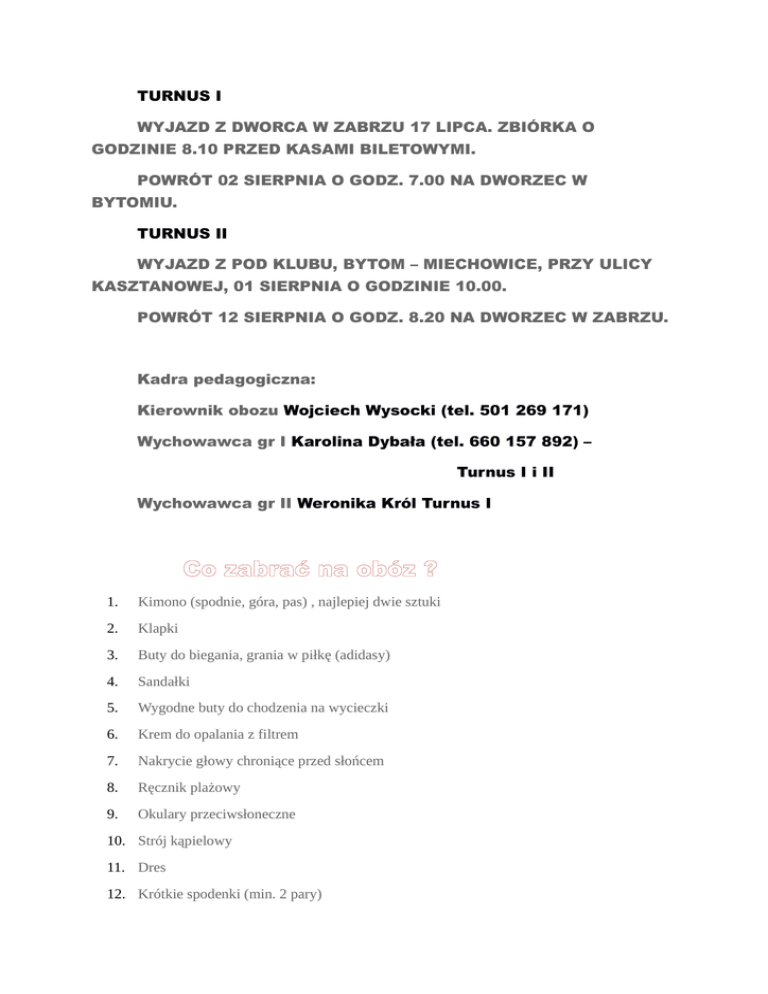 TURNUS I WYJAZD Z DWORCA W ZABRZU 17 LIPCA. ZBIÓRKA O GODZINIE 8.10 PRZED KASAMI BILETOWYMI. POWRÓT 02 SIERPNIA O GODZ. 7.00 NA DWORZEC W BYTOMIU. TURNUS II WYJAZD Z POD KLUBU, BYTOM – MIECHOWICE, PRZY ULICY KASZTANOWEJ, 01 SIERPNIA O GODZINIE 10.00. POWRÓT 12 SIERPNIA O GODZ. 8.20 NA DWORZEC W ZABRZU. Kadra pedagogiczna: Kierownik obozu Wojciech Wysocki (tel. 501 269 171) Wychowawca gr I Karolina Dybała (tel. 660 157 892) – Turnus I i II Wychowawca gr II Weronika Król Turnus I Co zabrać na obóz ? 1. Kimono (spodnie, góra, pas) , najlepiej dwie sztuki 2. Klapki 3. Buty do biegania, grania w piłkę (adidasy) 4. Sandałki 5. Wygodne buty do chodzenia na wycieczki 6. Krem do opalania z filtrem 7. Nakrycie głowy chroniące przed słońcem 8. Ręcznik plażowy 9. Okulary przeciwsłoneczne 10. Strój kąpielowy 11. Dres 12. Krótkie spodenki (min. 2 pary) 13. Bielizna na każdy dzień + zapas 14. Ciepła bluza/ polar 15. Kurtka przeciwdeszczowa 16. Koszulki (T-shirts) na każdy dzień + zapas (dziewczynki dodatkowo koszulki pod kimono) 17. Spodnie typu jeans 18. Przybory do mycia 19. Lekarstwa (w uzasadnionych przypadkach) z adnotacją dla lekarza o dawkowaniu zapakowane w podpisanej reklamówce lub papierowej torebce. 20. Worki na brudne rzeczy. 21. Legitymacja szkolna 22. Pieniądze na drobne wydatki zapakowane w podpisanej kopercie i rozmienione na banknoty 10zł i 20zł (proponowane 10 zł /dzień pobytu) Koperty i lekarstwa proszę oddać odpowiedniemu wychowawcy na zbiórce przed wyjazdem. Ramowy rozkład dnia z jednym treningiem : 07:30 – 08:30 pobudka, rozruch poranny 08:30 – 09:00 toaleta poranna, przygotowanie do śniadania 09:00 – 09:30 śniadanie 09:30 – 10:00 sprzątanie, przygotowanie do zajęć 10:00 – 14:00 zajęcia programowe 14:00 – 16:00 obiad, cisza poobiednia 16:30 – 18:15 trening 18:15 – 18:30 przygotowanie do kolacji 18:30 – 19:15 kolacja 19:30 – 21:00 zajęcia programowe (lub trening przygotowujący do egzaminu na stopnie kyu) 21:10 – 21:45 przygotowanie do ciszy nocnej 21:45 – 07:00 cisza nocna. Ramowy rozkład dnia bez treningu : 08:15 - pobudka, 08:30 – 09:00 toaleta poranna, przygotowanie do śniadania 09:00 – 09:30 śniadanie 09:30 – 10:00 sprzątanie, przygotowanie do zajęć 10:00 – 14:00 zajęcia programowe 14:00 – 16:00 obiad, cisza poobiednia 16:30 – 18:15 zajęcia programowe 18.15-18.30 przygotowania do kolacji 18:30 – 19:15 kolacja 19.30 – 21:00 zajęcia programowe 21:10 – 21:45 przygotowanie do ciszy nocnej 21:45 – 07:00 cisza nocna.