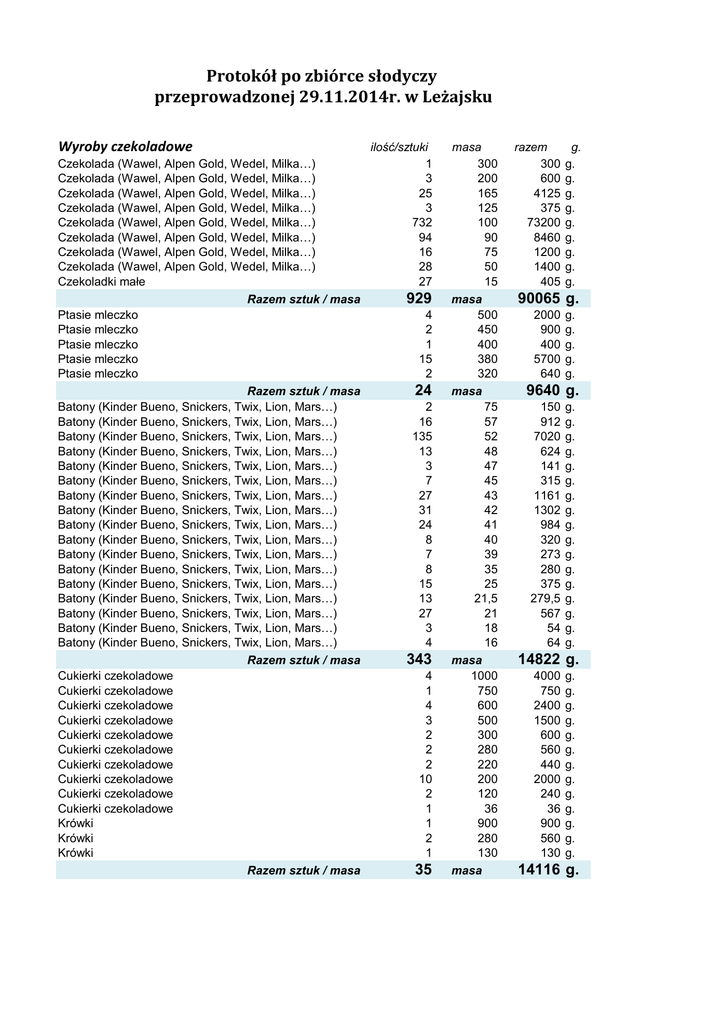Protokół po zbiórce słodyczy przeprowadzonej 29.11.2014r. w Leżajsku Wyroby czekoladowe Czekolada (Wawel, Alpen Gold, Wedel, Milka…) Czekolada (Wawel, Alpen Gold, Wedel, Milka…) Czekolada (Wawel, Alpen Gold, Wedel, Milka…) Czekolada (Wawel, Alpen Gold, Wedel, Milka…) Czekolada (Wawel, Alpen Gold, Wedel, Milka…) Czekolada (Wawel, Alpen Gold, Wedel, Milka…) Czekolada (Wawel, Alpen Gold, Wedel, Milka…) Czekolada (Wawel, Alpen Gold, Wedel, Milka…) Czekoladki małe Razem sztuk / masa Ptasie mleczko Ptasie mleczko Ptasie mleczko Ptasie mleczko Ptasie mleczko Razem sztuk / masa Batony (Kinder Bueno, Snickers, Twix, Lion, Mars…) Batony (Kinder Bueno, Snickers, Twix, Lion, Mars…) Batony (Kinder Bueno, Snickers, Twix, Lion, Mars…) Batony (Kinder Bueno, Snickers, Twix, Lion, Mars…) Batony (Kinder Bueno, Snickers, Twix, Lion, Mars…) Batony (Kinder Bueno, Snickers, Twix, Lion, Mars…) Batony (Kinder Bueno, Snickers, Twix, Lion, Mars…) Batony (Kinder Bueno, Snickers, Twix, Lion, Mars…) Batony (Kinder Bueno, Snickers, Twix, Lion, Mars…) Batony (Kinder Bueno, Snickers, Twix, Lion, Mars…) Batony (Kinder Bueno, Snickers, Twix, Lion, Mars…) Batony (Kinder Bueno, Snickers, Twix, Lion, Mars…) Batony (Kinder Bueno, Snickers, Twix, Lion, Mars…) Batony (Kinder Bueno, Snickers, Twix, Lion, Mars…) Batony (Kinder Bueno, Snickers, Twix, Lion, Mars…) Batony (Kinder Bueno, Snickers, Twix, Lion, Mars…) Batony (Kinder Bueno, Snickers, Twix, Lion, Mars…) Razem sztuk / masa Cukierki czekoladowe Cukierki czekoladowe Cukierki czekoladowe Cukierki czekoladowe Cukierki czekoladowe Cukierki czekoladowe Cukierki czekoladowe Cukierki czekoladowe Cukierki czekoladowe Cukierki czekoladowe Krówki Krówki Krówki Razem sztuk / masa ilość/sztuki 1 3 25 3 732 94 16 28 27 929 4 2 1 15 2 24 2 16 135 13 3 7 27 31 24 8 7 8 15 13 27 3 4 343 4 1 4 3 2 2 2 10 2 1 1 2 1 35 masa 300 200 165 125 100 90 75 50 15 masa 500 450 400 380 320 masa 75 57 52 48 47 45 43 42 41 40 39 35 25 21,5 21 18 16 masa 1000 750 600 500 300 280 220 200 120 36 900 280 130 masa razem 300 600 4125 375 73200 8460 1200 1400 405 g. g. g. g. g. g. g. g. g. g. 90065 g. 2000 900 400 5700 640 g. g. g. g. g. 9640 g. 150 912 7020 624 141 315 1161 1302 984 320 273 280 375 279,5 567 54 64 g. g. g. g. g. g. g. g. g. g. g. g. g. g. g. g. g. 14822 g. 4000 750 2400 1500 600 560 440 2000 240 36 900 560 130 g. g. g. g. g. g. g. g. g. g. g. g. g. 14116 g. Wyroby czekoladowe (mikołajki, szyszki, serduszka, …) Wyroby czekoladowe (mikołajki, szyszki, serduszka, …) Wyroby czekoladowe (mikołajki, szyszki, serduszka, …) Wyroby czekoladowe (mikołajki, szyszki, serduszka, …) Wyroby czekoladowe (mikołajki, szyszki, serduszka, …) Razem sztuk / masa Mieszanka krakowska-galaretki w czekoladzie Jajka-kinder niespodzianka Galaretka w czekoladzie Galaretka w czekoladzie Galaretka w czekoladzie Bombonierka Razem sztuk / masa RAZEM WYROBY CZEKOLADOWE CIASTKA Ciastka w czekoladzie Delicje Delicje Delicje Delicje Delicje Razem sztuk / masa Pierniczki w czekoladzie Pierniczki w czekoladzie Pierniczki w czekoladzie Pierniczki w czekoladzie Razem sztuk / masa 1407 masa ilość/sztuki 11 23 24 77 1 17 masa 300 147 140 135 128 masa 400 200 160 150 masa 360 300 235 250 210 200 168 145 120 masa 235 192 160 118 105 masa 208 masa 34388 g. ilość/sztuki 2 5 masa 300 200 razem g. 600 g. 1000 g. 66 3 3 1 1 1 1 136 38 2 1 2 2 1 2 1 4 2 Razem sztuk / masa Herbatniki w czekoladzie Herbatniki w czekoladzie Herbatniki w czekoladzie Herbatniki w czekoladzie Herbatniki w czekoladzie 17 3 1 5 3 5 Razem sztuk / masa RAZEM CIASTKA W CZEKOLADZIE Ciastka deserowe Ciastka deserowe 10 500 125 60 40 35 masa 1000 20 280 165 160 250 masa 4 19 1 14 Ciastka w czekoladzie Ciastka w czekoladzie Ciastka w czekoladzie Ciastka w czekoladzie Ciastka w czekoladzie Ciastka w czekoladzie Ciastka w czekoladzie Ciastka w czekoladzie Ciastka w czekoladzie INNE CIASTKA 1 2 31 23 9 500 250 1860 920 315 g. g. g. g. g. 3845 g. 3000 60 280 165 160 250 g. g. g. g. g. g. 3915 g. 136403 g. razem 3300 3381 3360 10395 128 g. g. g. g. g. g. 20564 g. 1600 3800 160 2100 g. g. g. g. 7660 g. 720 300 470 500 210 400 168 580 240 g. g. g. g. g. g. g. g. g. 3588 g. 705 192 800 354 525 g. g. g. g. g. 2576 g. Ciastka deserowe Ciastka maślane Ciastka pieguski Ciastka pieguski Ciastka jeżyki Ciastka jeżyki Ciastka zbożowe Ciastka zbożowe Ciastka deserowe z marmoladą Ciastka deserowe z marmoladą Biszkopty Biszkopty Biszkopty Biszkopty Biszkopty Biszkopty Ptysie Pierniki lukrowane Pierniki lukrowane Pierniki lukrowane 2 6 1 4 1 5 2 1 5 1 1 1 3 4 2 6 2 6 1 1 Razem sztuk / masa Markizy Markizy Markizy Oreo Oreo Hity Hity Hity 62 2 3 3 4 1 18 2 1 Razem sztuk / masa Herbatniki Herbatniki Herbatniki 34 2 2 6 2 1 27 3 9 Herbatniki Herbatniki Herbatniki Razem sztuk / masa Wafle Wafle Wafle Wafle Wafle Wafle Wafle Wafle Razem sztuk / masa Wafelki (Princessa, Prince Polo, Grześki…) Wafelki (Princessa, Prince Polo, Grześki…) Wafelki (Princessa, Prince Polo, Grześki…) Wafelki (Princessa, Prince Polo, Grześki…) Wafelki (Princessa, Prince Polo, Grześki…) Wafelki (Princessa, Prince Polo, Grześki…) Wafelki (Princessa, Prince Polo, Grześki…) Wafelki (Princessa, Prince Polo, Grześki…) 52 2 1 4 3 87 4 1 5 6 113 58 31 27 18 47 49 18 13 150 168 135 125 150 140 360 210 330 150 330 275 230 200 160 120 200 200 170 150 masa 160 150 135 176 66 220 168 120 masa 280 200 168 150 135 100 70 50 masa 500 450 235 230 180 175 160 150 130 masa 52 51 50 48 46 45 44 42 300 1008 135 500 150 700 720 210 1650 150 330 275 690 800 320 720 400 1200 170 150 g. g. g. g. g. g. g. g. g. g. g. g. g. g. g. g. g. g. g. g. 12178 g. 320 450 405 704 66 3960 336 120 g. g. g. g. g. g. g. g. 6361 g. 560 400 1008 300 135 2700 210 450 g. g. g. g. g. g. g. g. 5763 g. 1000 450 940 690 15660 700 160 750 780 g. g. g. g. g. g. g. g. g. 21130 g. 3016 1581 1350 864 2162 2205 792 546 g. g. g. g. g. g. g. g. Wafelki (Princessa, Prince