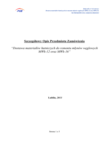 Załącznik nr 1 do umowy: Dostawa materiałów hutniczych do remontu młynów węglowych MWk-12 oraz MWk-16. NR POSTĘPOWANIA: GEK/ECL/0048/2013 Szczegółowy Opis Przedmiotu Zamówienia “Dostawa materiałów hutniczych do remontu młynów węglowych MWk-12 oraz MWk-16” Lublin, 2013 Strona 1 z 5 Załącznik nr 1 do umowy: Dostawa materiałów hutniczych do remontu młynów węglowych MWk-12 oraz MWk-16. NR POSTĘPOWANIA: GEK/ECL/0048/2013 Zawartość 1. 2. 3. 4. 5. Przedmiot zamówienia ................................................................................................................... 3 Opis stanu istniejącego .................................................................................................................. 4 Szczegółowy zakres prac ............................................................................................................... 4 Harmonogram realizacji zamówienia ............................................................................................ 4 Uwagi dodatkowe .......................................................................................................................... 4 Strona 2 z 5 Załącznik nr 1 do umowy: Dostawa materiałów hutniczych do remontu młynów węglowych MWk-12 oraz MWk-16. NR POSTĘPOWANIA: GEK/ECL/0048/2013 1. PRZEDMIOT ZAMÓWIENIA Przedmiotem zamówienia jest: Dostawa następujących materiałów hutniczych do remontu młynów węglowych MWk-12 oraz MWk-16: 1.1 1.2 1.3 1.4 1.5 1.6 1.7 1.8 1.9 1.10 1.11 1.12 1.13 1.14 1.15 1.16 1.17 1.18 1.19 1.20 1.21 Bijak, część dolna, młyn MWk-12, rys. nr 4-1286894, mat.HTK1000H o twardości 500HB lub równoważny – szt.100, Bijak, część górna, młyn MWk-12, rys. nr 4-1286895, mat.HTK1000H o twardości 500HB lub równoważny – szt.100, Bijak, część dolna, młyn MWk-16, rys. nr 4-1286779, mat.HTK1000H o twardości 500HB lub równoważny – szt.100, Bijak, część górna, młyn MWk-16, rys. nr 4-1286780, mat.HTK1000H o twardości 500HB lub równoważny – szt.100, Pancerz narożny, młyn MWk-12, rys. nr 4-88502b, mat.HTK1000H o twardości 500HB lub równoważny – szt.100, Pancerz narożny, młyn MWk-16, rys. nr 4-1165286, mat.HTK1000H o twardości 500HB lub równoważny – szt.100, Tarcza ochronna, rys. nr 2-1286777b, mat. 18G2A lub równoważny – szt.5, Pręt stalowy, kwadratowy, pełny 15x15mm, mat. 18G2A lub równoważny – kg. 200, Pręt stalowy, kwadratowy, pełny 20x20mm, mat. 18G2A lub równoważny – kg. 400, Stal płaska 20x40x2000mm, mat.HTK1000H o twardości 500HB lub równoważny – szt.30, Stal płaska 30x100x380mm, mat.HTK1000H o twardości 500HB lub równoważny – szt.300, Stal płaska 30x100x690mm, mat.HTK1000H o twardości 500HB lub równoważny – szt.300, Stal płaska 30x100x6000mm, mat.HTK1000H o twardości 500HB lub równoważny – szt.10, Stal płaska 40x100x380mm, mat.HTK1000H o twardości 500HB lub równoważny – szt.300, Stal płaska 40x100x690mm, mat.HTK1000H o twardości 500HB lub równoważny – szt.300, Stal płaska 40x100x6000mm, mat.HTK1000H o twardości 500HB lub równoważny – szt.10, Blacha stalowa gr.8mm, mat.HTK1000H o twardości 500HB lub równoważny – kg. 1280, Blacha stalowa gr.10mm, mat.HTK1000H o twardości 500HB lub równoważny – kg. 1600, Blacha stalowa gr.10mm, mat.St3SX lub równoważny – kg. 1600, Blacha stalowa gr.15mm, mat.HTK1000H o twardości 500HB lub równoważny – kg. 2400, Blacha stalowa gr.15mm, mat.St3SX lub równoważny – kg. 2400, Strona 3 z 5 Załącznik nr 1 do umowy: Dostawa materiałów hutniczych do remontu młynów węglowych MWk-12 oraz MWk-16. NR POSTĘPOWANIA: GEK/ECL/0048/2013 1.22 Blacha stalowa gr.20mm, mat.HTK1000H o twardości 500HB lub równoważny – kg. 3200, 1.23 Blacha stalowa gr.20mm, mat.St3SX lub równoważny – kg. 3200, 1.24 Płaskownik profilowany 20x100x870mm, profil gięcia R-1103, mat.HTK1000H o twardości 500HB lub równoważny – szt.100, 1.25 Płaskownik profilowany 20x110x870mm, profil gięcia R-1103, mat.HTK1000H o twardości 500HB lub równoważny – szt.100, 1.26 Płaskownik profilowany 20x80x870mm, profil gięcia R-1103, mat.HTK1000H o twardości 500HB lub równoważny – szt.50, 1.27 Pierścień 2186x55x30mm, mat. 18G2A lub równoważny – szt.15, 1.28 Pierścień 2260x105x20mm, mat. 18G2A lub równoważny – szt.6, 1.29 Pierścień 2260x75x20mm, mat. 18G2A lub równoważny – szt.6, 2. OPIS STANU ISTNIEJĄCEGO Nie dotyczy. 3. SZCZEGÓŁOWY ZAKRES PRAC 3.1. Dostarczenie wszystkich materiałów zamieszczonych w przedmiocie zamówienia od pozycji 1.1 do 1.29, do magazynu materiałowego na terenie PGE GIEK S.A. Oddział Elektrociepłownia Lublin Wrotków. 3.2. Dla wszystkich pozycji zakupowych wymagane jest przy każdorazowej dostawie Świadectwo jakości 3.1 wg PN-EN 10204:2006. 3.3. Dostarczenie formularza protokołu odbioru dostawy. 4. HARMONOGRAM REALIZACJI ZAMÓWIENIA 4.1. Termin realizacji zamówienia: do 30-09-2013 5. UWAGI DODATKOWE 5.1. Dokumentację techniczną pomocną w realizacji przedmiotu zamówienia, Zamawiający może udostępnić potencjalnym Wykonawcom na terenie PGE GIEK S.A. Oddział Elektrociepłownia Lublin Wrotków. 5.2. Wizyty na terenie PGE GIEK S.A. Oddział Elektrociepłownia Lublin Wrotków w celu zapoznania się z dokumentacją techniczną posiadaną przez Zamawiającego należy potwierdzić z co najmniej jednodniowym wyprzedzeniem. 5.3. Zamawiający dopuszcza możliwość podziału przez Wykonawcę dostawy materiałów na kilka dostarczanych partii w zależności od możliwości transportowych Wykonawcy, nie wykluczając przy tym dostawy w jednej partii. Strona 4 z 5 Załącznik nr 1 do umowy: Dostawa materiałów hutniczych do remontu młynów węglowych MWk-12 oraz MWk-16. NR POSTĘPOWANIA: GEK/ECL/0048/2013 5.4. Wykonawca ponosi odpowiedzialność za braki i wady powstałe w czasie transportu materiałów do magazynu materiałowego na terenie PGE GIEK S.A. Oddział Elektrociep