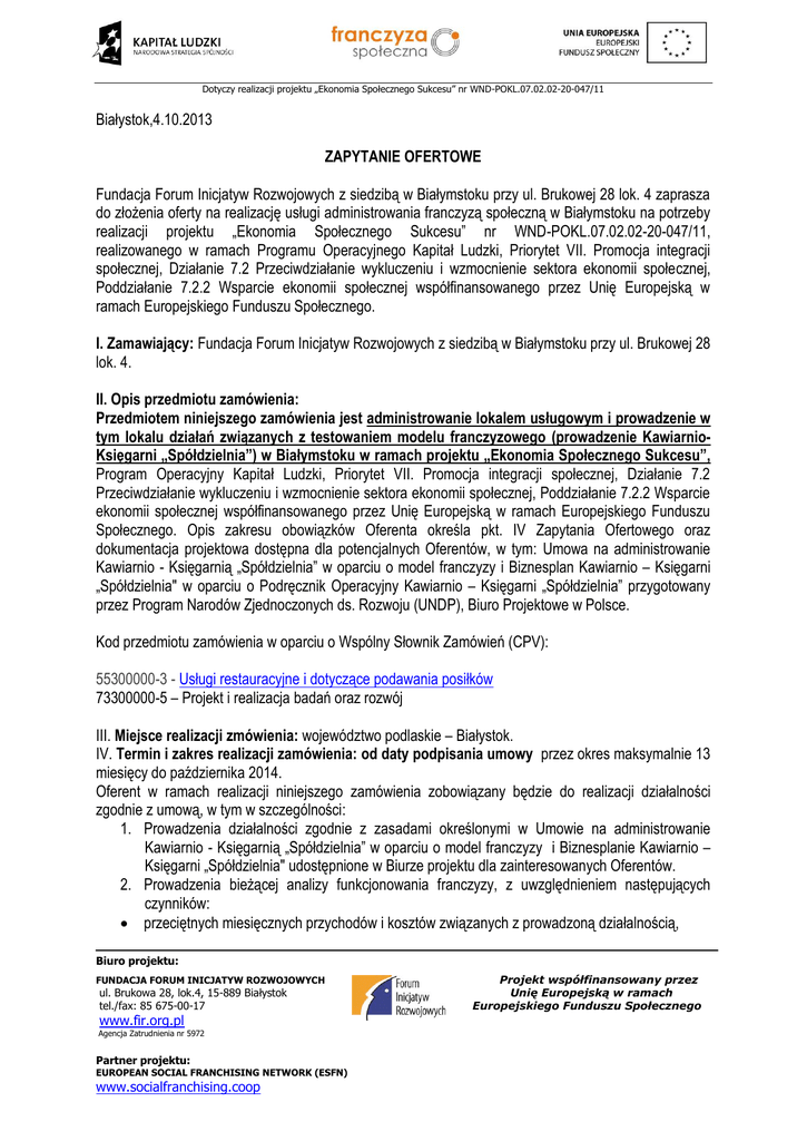 Dotyczy realizacji projektu „Ekonomia Społecznego Sukcesu” nr WND-POKL.07.02.02-20-047/11 Białystok,4.10.2013 ZAPYTANIE OFERTOWE Fundacja Forum Inicjatyw Rozwojowych z siedzibą w Białymstoku przy ul. Brukowej 28 lok. 4 zaprasza do złożenia oferty na realizację usługi administrowania franczyzą społeczną w Białymstoku na potrzeby realizacji projektu „Ekonomia Społecznego Sukcesu” nr WND-POKL.07.02.02-20-047/11, realizowanego w ramach Programu Operacyjnego Kapitał Ludzki, Priorytet VII. Promocja integracji społecznej, Działanie 7.2 Przeciwdziałanie wykluczeniu i wzmocnienie sektora ekonomii społecznej, Poddziałanie 7.2.2 Wsparcie ekonomii społecznej współfinansowanego przez Unię Europejską w ramach Europejskiego Funduszu Społecznego. I. Zamawiający: Fundacja Forum Inicjatyw Rozwojowych z siedzibą w Białymstoku przy ul. Brukowej 28 lok. 4. II. Opis przedmiotu zamówienia: Przedmiotem niniejszego zamówienia jest administrowanie lokalem usługowym i prowadzenie w tym lokalu działań związanych z testowaniem modelu franczyzowego (prowadzenie KawiarnioKsięgarni „Spółdzielnia”) w Białymstoku w ramach projektu „Ekonomia Społecznego Sukcesu”, Program Operacyjny Kapitał Ludzki, Priorytet VII. Promocja integracji społecznej, Działanie 7.2 Przeciwdziałanie wykluczeniu i wzmocnienie sektora ekonomii społecznej, Poddziałanie 7.2.2 Wsparcie ekonomii społecznej współfinansowanego przez Unię Europejską w ramach Europejskiego Funduszu Społecznego. Opis zakresu obowiązków Oferenta określa pkt. IV Zapytania Ofertowego oraz dokumentacja projektowa dostępna dla potencjalnych Oferentów, w tym: Umowa na administrowanie Kawiarnio - Księgarnią „Spółdzielnia” w oparciu o model franczyzy i Biznesplan Kawiarnio – Księgarni „Spółdzielnia" w oparciu o Podręcznik Operacyjny Kawiarnio – Księgarni „Spółdzielnia” przygotowany przez Program Narodów Zjednoczonych ds. Rozwoju (UNDP), Biuro Projektowe w Polsce. Kod przedmiotu zamówienia w oparciu o Wspólny Słownik Zamówień (CPV): 55300000-3 - Usługi restauracyjne i dotyczące podawania posiłków 73300000-5 – Projekt i realizacja badań oraz rozwój III. Miejsce realizacji zmówienia: województwo podlaskie – Białystok. IV. Termin i zakres realizacji zamówienia: od daty podpisania umowy przez okres maksymalnie 13 miesięcy do października 2014. Oferent w ramach realizacji niniejszego zamówienia zobowiązany będzie do realizacji działalności zgodnie z umową, w tym w szczególności: 1. Prowadzenia działalności zgodnie z zasadami określonymi w Umowie na administrowanie Kawiarnio - Księgarnią „Spółdzielnia” w oparciu o model franczyzy i Biznesplanie Kawiarnio – Księgarni „Spółdzielnia" udostępnione w Biurze projektu dla zainteresowanych Oferentów. 2. Prowadzenia bieżącej analizy funkcjonowania franczyzy, z uwzględnieniem następujących czynników: przeciętnych miesięcznych przychodów i kosztów związanych z prowadzoną działalnością, Biuro projektu: FUNDACJA FORUM INICJATYW ROZWOJOWYCH ul. Brukowa 28, lok.4, 15-889 Białystok tel./fax: 85 675-00-17 www.fir.org.pl Agencja Zatrudnienia nr 5972 Partner projektu: EUROPEAN SOCIAL FRANCHISING NETWORK (ESFN) www.socialfranchising.coop Projekt współfinansowany przez Unię Europejską w ramach Europejskiego Funduszu Społecznego Dotyczy realizacji projektu „Ekonomia Społecznego Sukcesu” nr WND-POKL.07.02.02-20-047/11 rentowności przedsięwzięcia, najbardziej efektywnych środków marketingowych; 3. Proponowania, w związku z wynikami analizy funkcjonowania franczyzy społecznej, rozwiązań mogących udoskonalić planowane przedsięwzięcie. Szczegółowy zakres zamówienia określa Umowa na administrowanie Kawiarnio - Księgarnią „Spółdzielnia” w oparciu o model franczyzy i Biznesplan Kawiarnio – Księgarni „Spółdzielnia". V. Warunki udzielenia zamówienia: 1. Zgodnie z założeniami Projektu p.n. „Ekonomia Społecznego Sukcesu” oraz na podstawie pkt. 3.1.3.1 Podsekcja 1 Wytycznych w zakresie kwalifikowania wydatków w ramach Programu Operacyjnego Kapitał Ludzki administratorem (realizatorem zamówienia) może być wyłącznie podmiot ekonomii społecznej: spółdzielnia socjalna, która znajduje się w sytuacji ekonomicznej i finansowej zapewniającej wykonanie zamówienia. 2. Zamawiający nie może udzielać zamówienia podmiotom powiązanym z nim osobowo lub kapitałowo. Przez powiązania kapitałowe lub osobowe rozumie się wzajemne powiązania między Zamawiającym lub osobami upoważnionymi do zaciągania zobowiązań w imieniu Zamawiającego lub osobami wykonującymi w imieniu Zamawiającego czynności związane z przygotowaniem i przeprowadzeniem procedury wyboru Wykonawcy, a Wykonawcą, polegające w szczególności na: a) Uczestniczeniu w spółce jako wspólnik spółki cywilnej lub spółki osobowej; b) Posiadaniu co najmniej 10% udziałów akcji; c) Pełnieniu funkcji członka organu nadzorczego lub zarządzającego, prokurenta, pełnomocnika; d) Pozostawaniu w związku małżeńskim, w stosunku pokrewieństwa lub powinowactwa w linii prostej, pokrewieństwa lub powinowactwa w linii bocznej do drugiego stopnia lub w stosunku przysposobienia, opieki lub kurateli. 3. Wybrany w toku niniejszej procedury przedsiębiorca uzyska pomoc publiczną o charakterze de minimis, zgodnie z treścią rozporządzenia Komisji (WE) NR 1998/2006 z dnia 15 grudnia 2006 r. w sprawie stosowania art. 87 i 88 Traktatu do pomocy de minimis (Dz.U.UE.L.2006.379.5). W związku z tym stosownie do postanowień art. 37 ustawy z dnia 30 kwietnia 2004 r. o postępowaniu w sprawach dotyczących pomocy publicznej (Dz.U.2007.59.404 j.t. z późniejszymi zm.) oraz treści rozporządzenia Rady Ministrów z dnia 29 marca 2010 r. w sprawie zakresu informacji przedstawianych przez podmiot ubiegający się o pomoc de minimis (Dz.U.2010.53.311 z późniejszymi zmianami), oferent zobowiązany jest prze