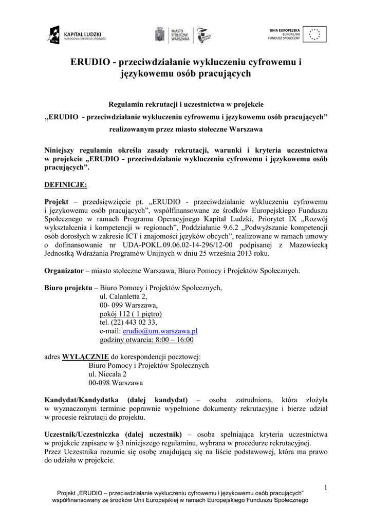 ERUDIO - przeciwdziałanie wykluczeniu cyfrowemu i językowemu osób pracujących Regulamin rekrutacji i uczestnictwa w projekcie „ERUDIO - przeciwdziałanie wykluczeniu cyfrowemu i językowemu osób pracujących” realizowanym przez miasto stołeczne Warszawa Niniejszy regulamin określa zasady rekrutacji, warunki i kryteria uczestnictwa w projekcie „ERUDIO - przeciwdziałanie wykluczeniu cyfrowemu i językowemu osób pracujących”. DEFINICJE: Projekt – przedsięwzięcie pt. „ERUDIO - przeciwdziałanie wykluczeniu cyfrowemu i językowemu osób pracujących”, współfinansowane ze środków Europejskiego Funduszu Społecznego w ramach Programu Operacyjnego Kapitał Ludzki, Priorytet IX „Rozwój wykształcenia i kompetencji w regionach”, Poddziałanie 9.6.2 „Podwyższanie kompetencji osób dorosłych w zakresie ICT i znajomości języków obcych”, realizowane w ramach umowy o dofinansowanie nr UDA-POKL.09.06.02-14-296/12-00 podpisanej z Mazowiecką Jednostką Wdrażania Programów Unijnych w dniu 25 września 2013 roku. Organizator – miasto stołeczne Warszawa, Biuro Pomocy i Projektów Społecznych. Biuro projektu – Biuro Pomocy i Projektów Społecznych, ul. Calanletta 2, 00- 099 Warszawa, pokój 112 ( 1 piętro) tel. (22) 443 02 33, e-mail: [email protected] godziny otwarcia: 8:00 – 16:00 adres WYŁĄCZNIE do korespondencji pocztowej: Biuro Pomocy i Projektów Społecznych ul. Niecała 2 00-098 Warszawa Kandydat/Kandydatka (dalej kandydat) – osoba zatrudniona, która złożyła w wyznaczonym terminie poprawnie wypełnione dokumenty rekrutacyjne i bierze udział w procesie rekrutacji do projektu. Uczestnik/Uczestniczka (dalej uczestnik) – osoba spełniająca kryteria uczestnictwa w projekcie zapisane w §3 niniejszego regulaminu, wybrana w procedurze rekrutacyjnej. Przez Uczestnika rozumie się osobę znajdującą się na liście podstawowej, która ma prawo do udziału w projekcie. Projekt „ERUDIO – przeciwdziałanie wykluczeniu cyfrowemu i językowemu osób pracujących” współfinansowany ze środków Unii Europejskiej w ramach Europejskiego Funduszu Społecznego 1 ERUDIO - przeciwdziałanie wykluczeniu cyfrowemu i językowemu osób pracujących Uczestnik rezerwowy – przez Uczestnika rezerwowego rozumie się osobę, znajdującą się na liście rezerwowej projektu, spełniającą kryteria uczestnictwa w projekcie zapisane w §3 niniejszego regulaminu. Osoba z listy rezerwowej posiada prawo wejścia na listę podstawową w przypadku zwolnienia się na niej miejsca. Osoba 50+ – osoba, która w momencie podpisania Deklaracji uczestnictwa w projekcie ma ukończony 50. rok życia. Kursy komputerowe – obejmują kurs ECDL Start, kurs ECDL Core oraz Kurs umiejętości internetowych (KUI). Kurs ECDL Start (ECDL Start) – kurs przygotowujący do zdawania egzaminów ECDL START dla 120 uczestników projektu powyżej 50. roku życia, obejmujący 80 godzin lekcyjnych zajęć dla każdej grupy (godzina lekcyjna = 45 min) oraz dodatkowo 4h lekcyjne na egzaminy. Kurs składa się z 4 modułów, które kończą się egzaminami. Zgodnie z międzynarodowymi normami dotyczącymi zakresu szkoleń, każdy kurs informatyczny przygotowujący do zdawania egzaminu ECDL START obejmować będzie 4 następujące moduły: 1. 2. 3. 4. Podstawy technik informatycznych i komunikacyjnych, Przetwarzanie tekstów. Arkusze kalkulacyjne, Użytkowanie komputerów i zarządzanie plikami. W przypadku zdania wszystkich egzaminów uczestnik otrzyma Europejski Certyfikat Umiejętności Komputerowych (Certyfikat ECDL w formie papierowej oraz w formie plastikowej karty). Kurs ECDL Core (ECDL Core) – kurs przygotowujący do zdawania egzaminów ECDL CORE dla 36 uczestników projektu, obejmujący 120 godzin lekcyjnych zajęć dla każdej grupy (godzina lekcyjna = 45 min) oraz dodatkowo 7h lekcyjnych na egzaminy. Kurs składa się z 7 modułów z których każdy kończy się egzaminem: 1. 2. 3. 4. 5. 6. 7. Podstawy technik informatycznych i komunikacyjnych, Użytkowanie komputerów i zarządzanie plikami. Przetwarzanie tekstów, Arkusze kalkulacyjne Użytkowanie baz danych, Grafika menedżerska i prezentacyjna, Przeglądanie stron internetowych i komunikacja. W przypadku zdania wszystkich egzaminów uczestnik otrzyma Europejski Certyfikat Umiejętności Komputerowych (Certyfikat ECDL w formie papierowej oraz w formie plastikowej karty). Projekt „ERUDIO – przeciwdziałanie wykluczeniu cyfrowemu i językowemu osób pracujących” współfinansowany ze środków Unii Europejskiej w ramach Europejskiego Funduszu Społecznego 2 ERUDIO - przeciwdziałanie wykluczeniu cyfrowemu i językowemu osób pracujących Kurs umiejętności internetowych (KUI) – kurs dla 60 osób w wieku 50+, które ukończyły kurs ECDL Start i chcą podnieść swoje umiejętności. Kurs będzie trwał 16 godzin zegarowych (dla 1 grupy). Uczestnik kursu otrzyma certyfikat potwierdzający podstawowe kompetencje w zakresie obsługi Internetu. Tematyka kursu obejmować będzie: 1. Efektywne i bezpieczne wyszukiwanie informacji w Internecie. 2. Komunikacja z innymi użytkownikami sieci. 3. E-usługi. Kurs języka angielskiego – kurs dla 84 osób, obejmujący maksymalnie 240 godzin lekcyjnych dla każdej grupy (godzina lekcyjna = 45 min), składający się z minimum 2 i maksymalnie 4 semestrów, tak by uczestnik osiągnął pełen poziom kompetencji językowych A lub B, lub C, zgodny z Europejskim Systemem Kształcenia Językowego (liczba semestrów – 60h/1 semestr - zależna będzie od poziomu kompetencji językowych uczestnika), zakończony egzaminem Cambridge English i uzyskaniem certyfikatu potwierdzającego zdobycie określonego poziomu biegłości językowej (tj. jednego z egzaminów Cambridge English): • • • KET - Key English Test FCE - First Certificate in English CPE - Certificate of Proficiency in English Pełen poziom kompetencji językowych oznacza cały poziom A (poziom podstawowy), B (poziom samo